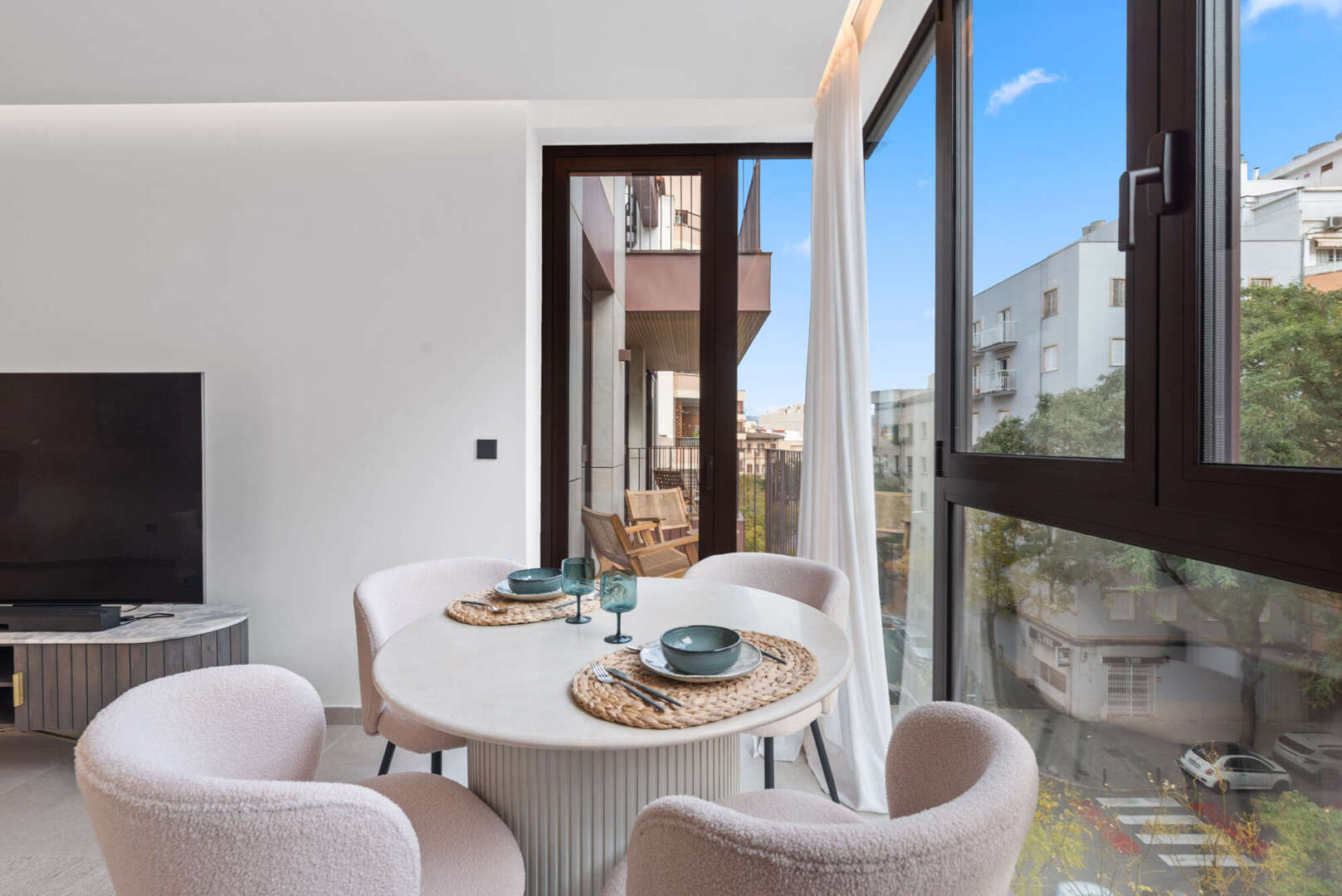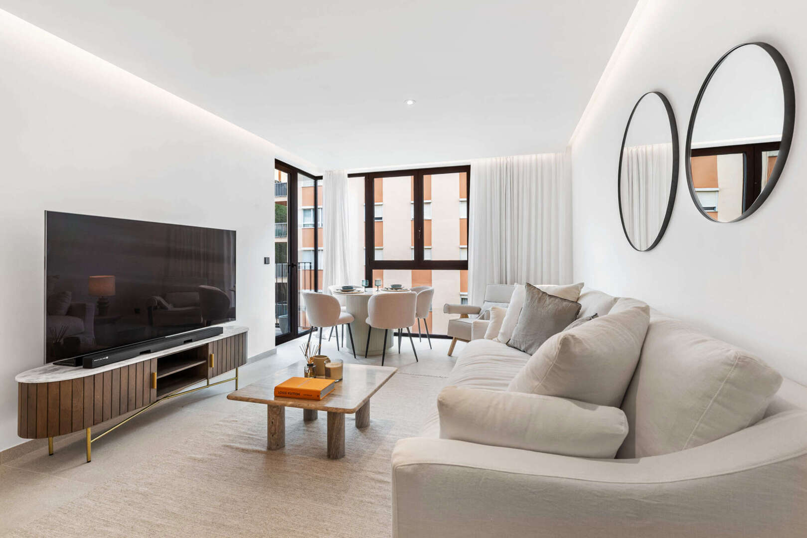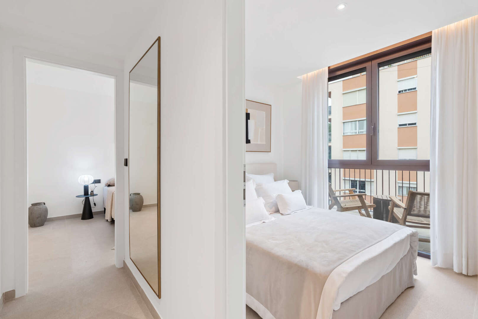 * Large, floor-to-ceiling metal windows with double glazing