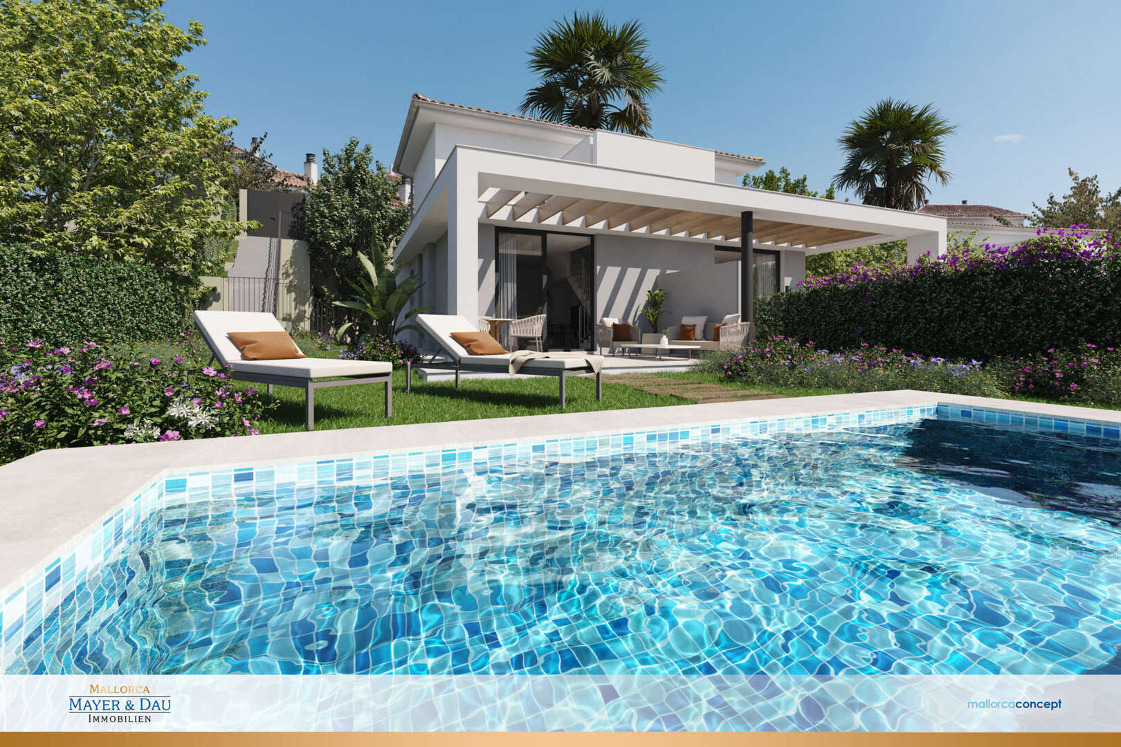 Here you will find two identical, adjoining residential units. Each unit has 4 bedrooms, perfect for couples and families. Three modern bathrooms in each unit, equipped with high-quality fittings and stylish tiles. The spacious living areas are flooded with light and offer a wonderful view of the private garden and the sparkling pool. The open-plan design creates a feeling of spaciousness and modernity.