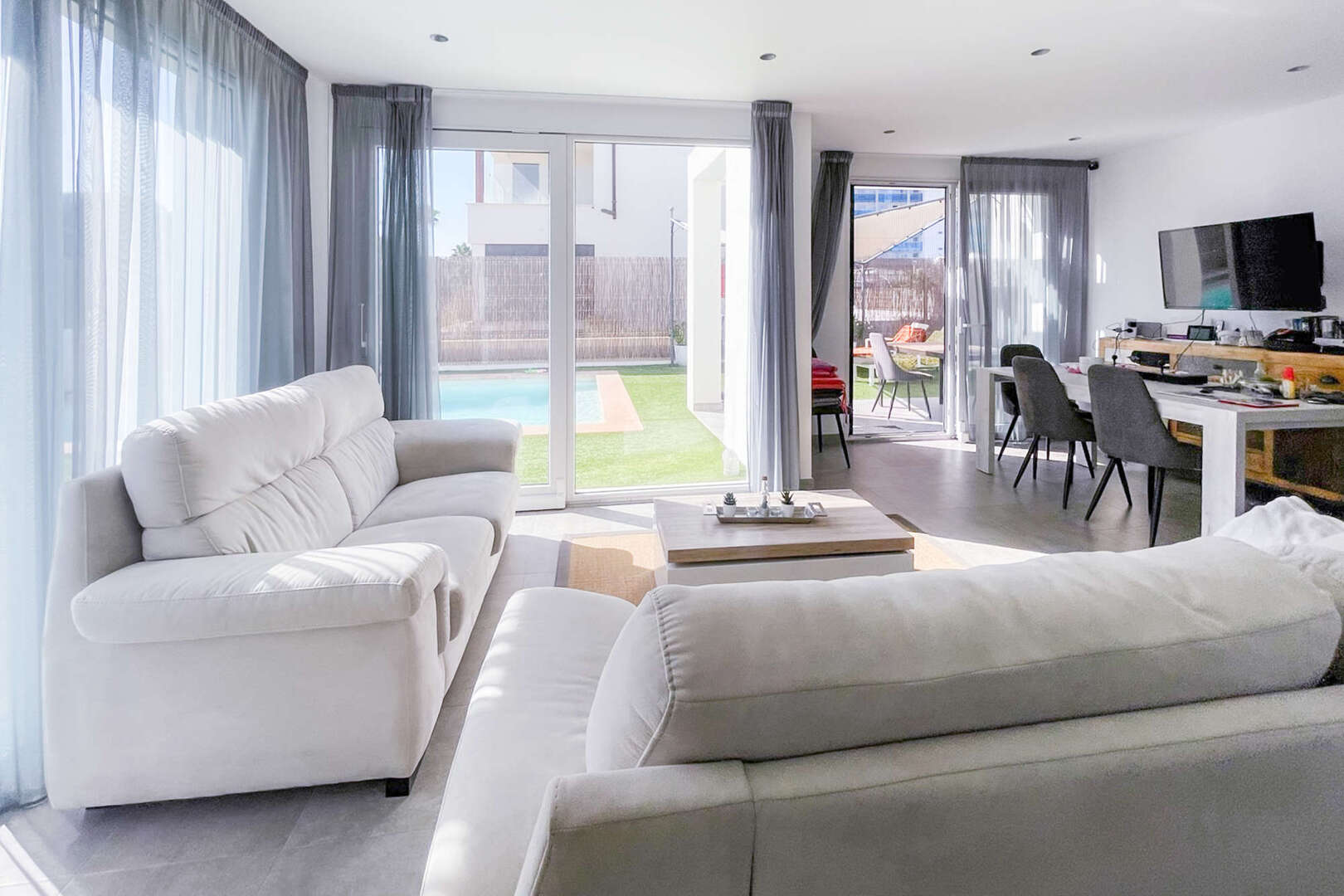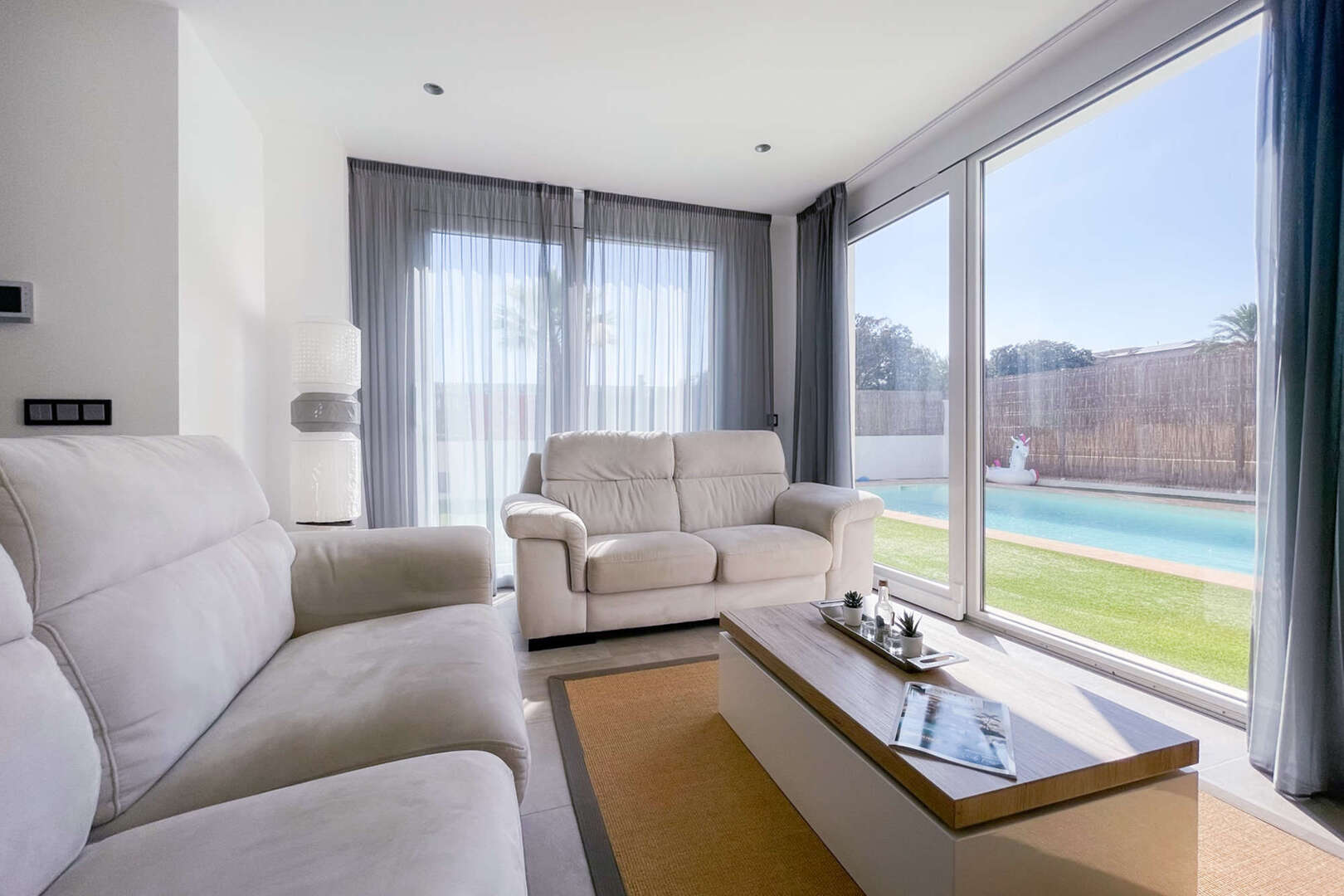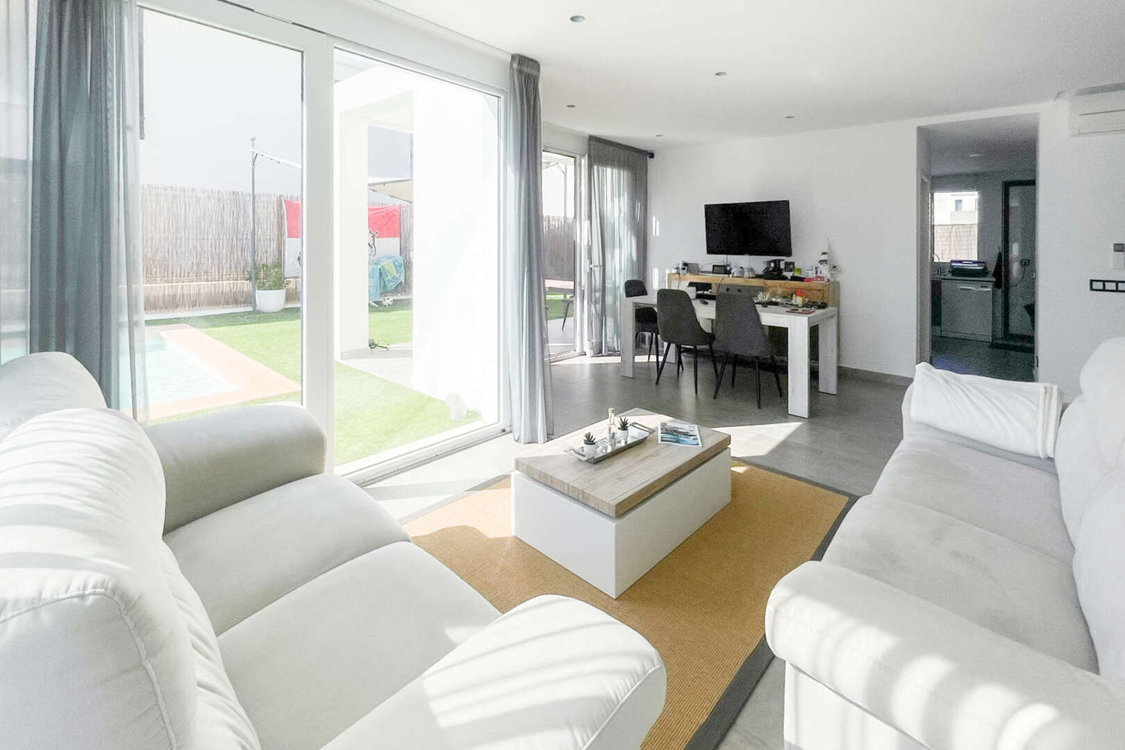 Living and dining area: The bright, large living and dining area is equipped with panoramic windows that offer breathtaking views of the pool and the well-kept plot. The rooms are flooded with light and create a pleasant, open atmosphere.