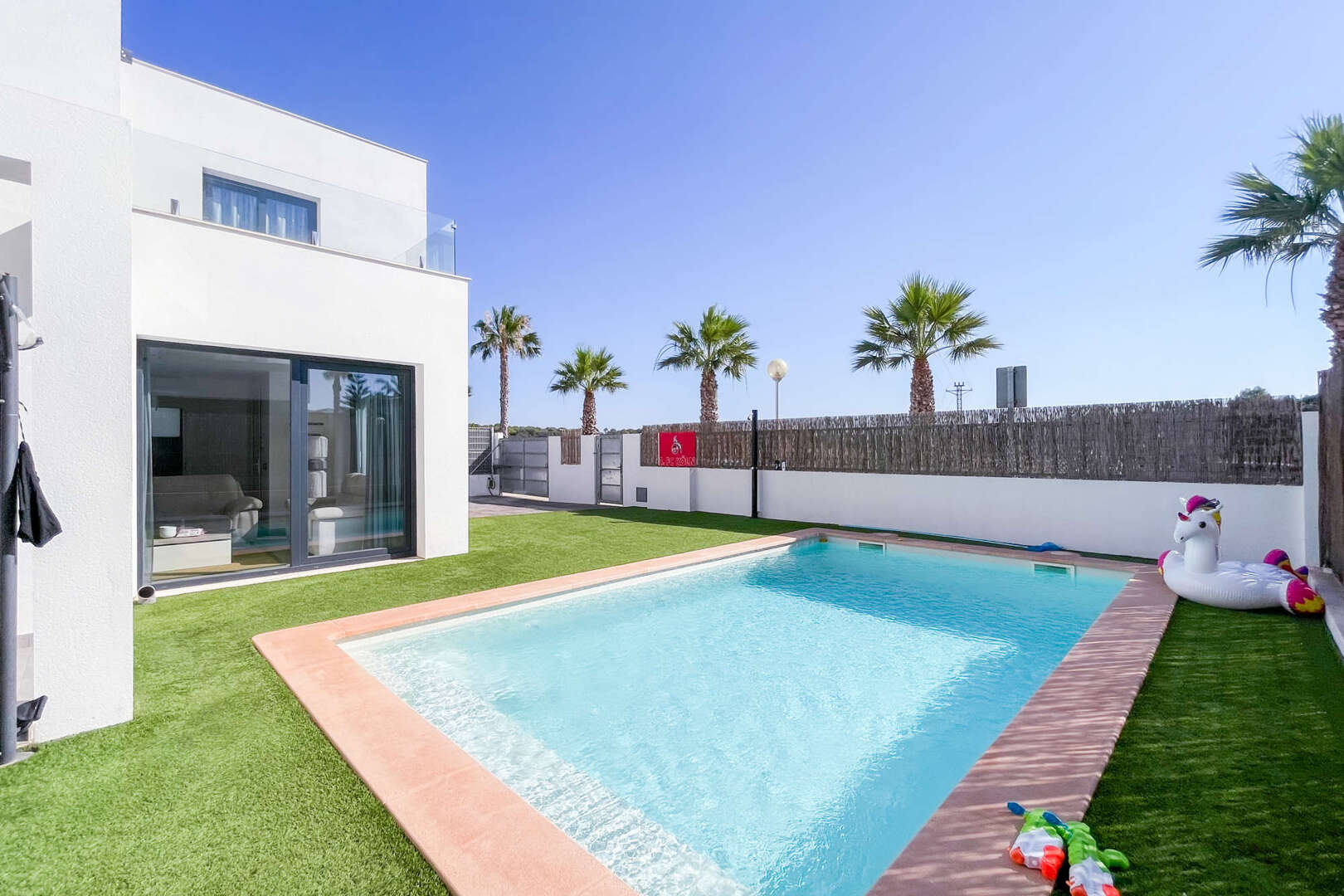 Bedrooms: There is a guest bedroom on the first floor and three large bedrooms on the upper floor, all with modern fitted wardrobes offering ample storage space. The rooms are flooded with light and offer a wonderful retreat. The master bedroom on the upper floor has an en-suite bathroom and a large terrace.
