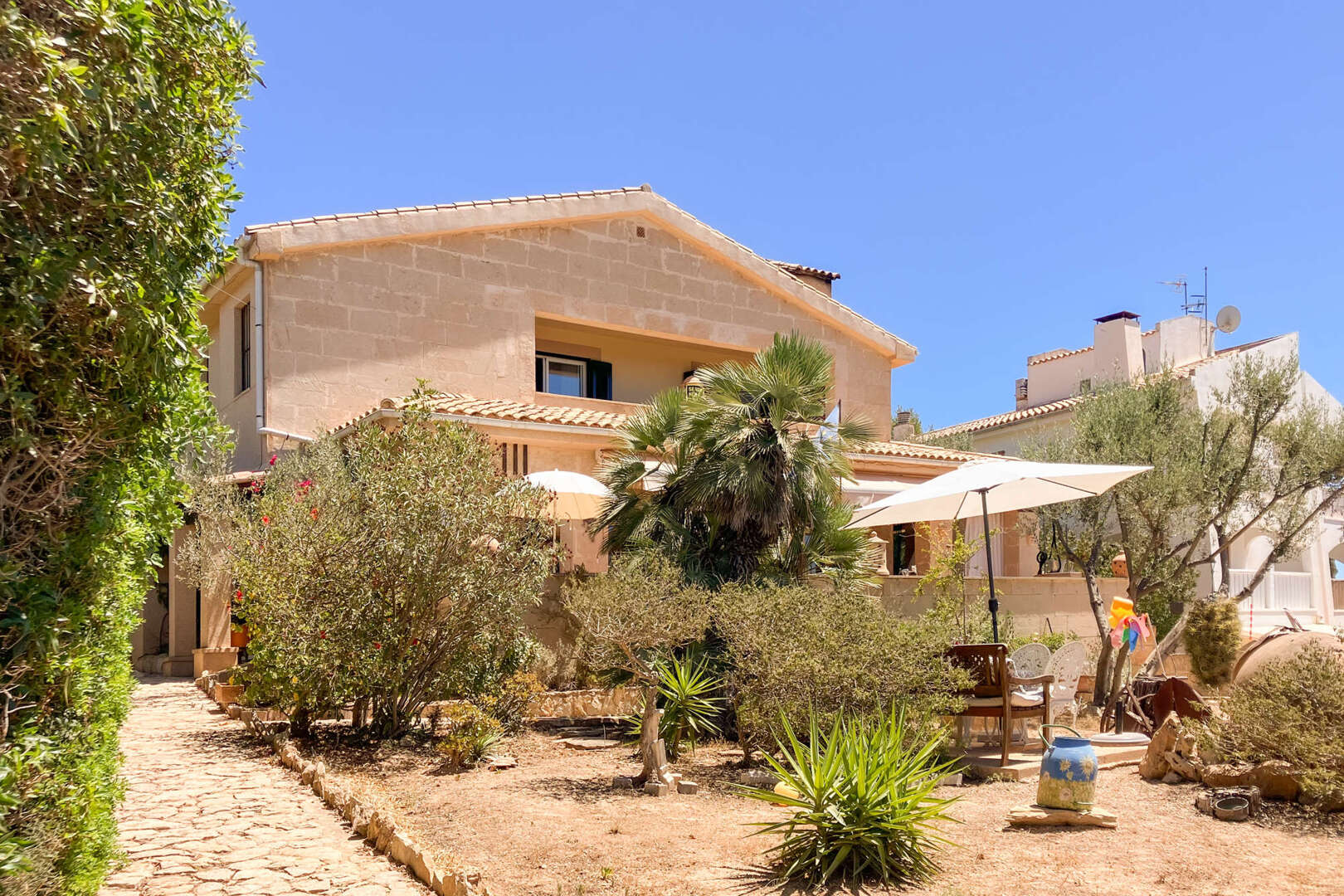 Particularly noteworthy is the generous well with a capacity of 75,000 liters, which ensures a reliable water supply and underlines the independence of the villa. The property is also designed with traditional Mares stone, which is known for its durability and aesthetic beauty and gives the house an authentic Mallorcan charm.