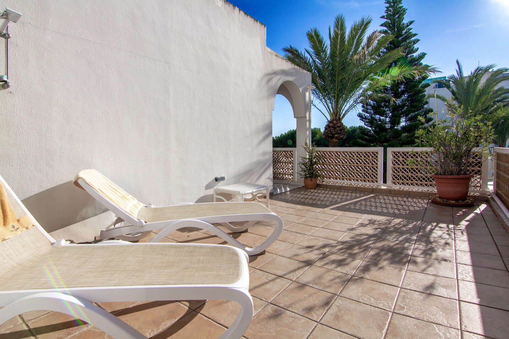 Our exclusive penthouse on the 2nd floor is accessible via a private staircase and impresses with terraces that turn the outdoor area into your second living room. The two spacious, open balconies (approx. 18 m² each) offer an ideal mix of privacy and a fantastic view of the sea and beach. A covered veranda (approx. 7.5 m²) is perfect for al fresco dining, while Mediterranean arches and an additional covered terrace with sea views complete the ambience.