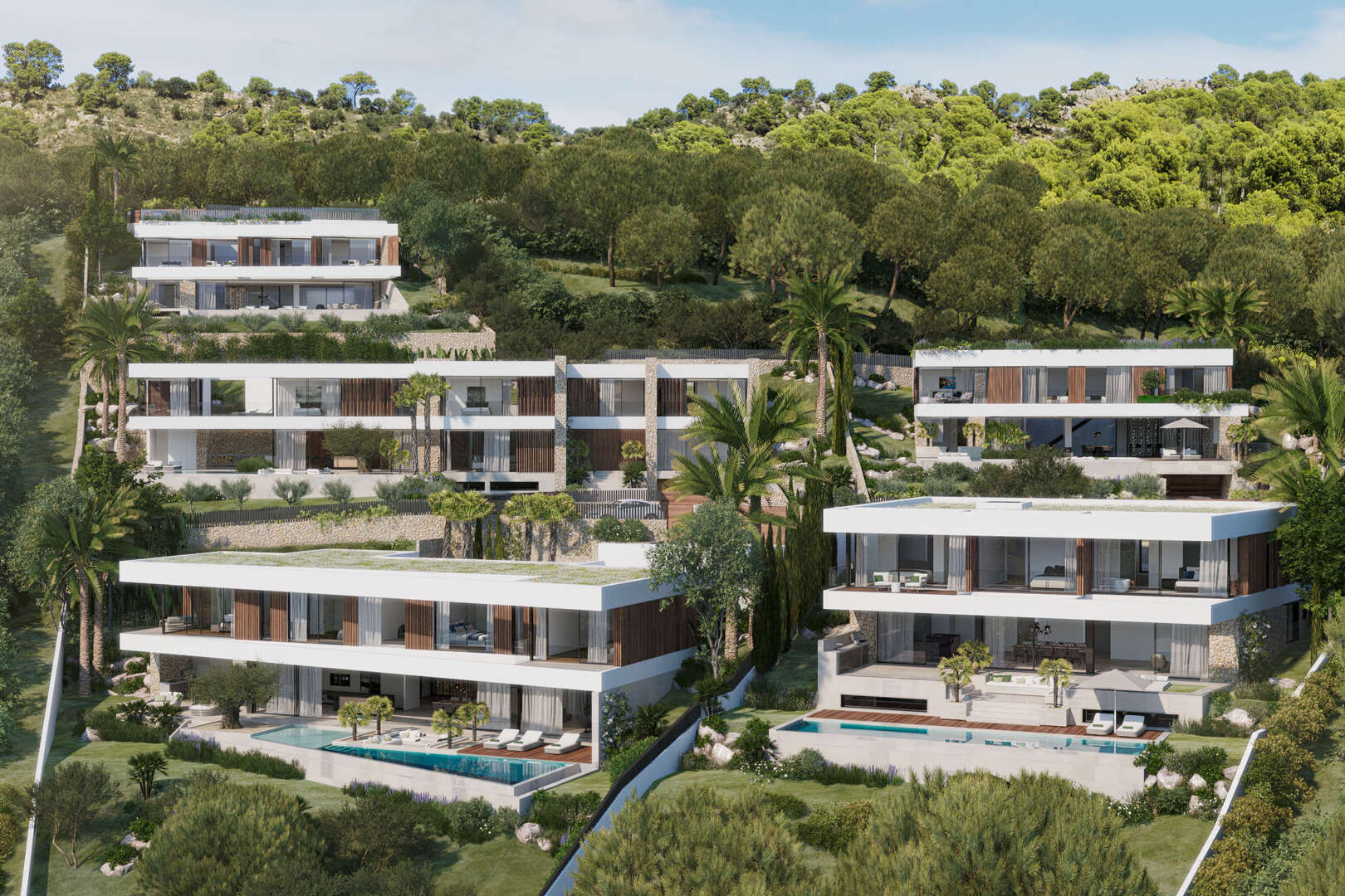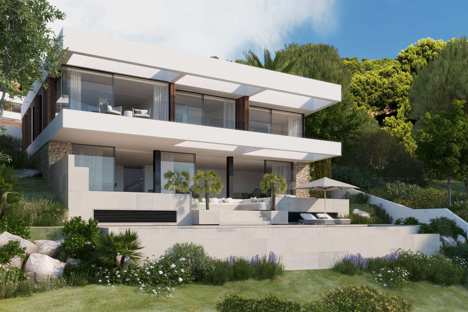 The villa extends over three levels and impresses with its well thought-out room layout. The upper floor serves as a private retreat and comprises an elegant master suite with a spacious bedroom, stylish bathroom, walk-in closet and private terrace. Three further light-flooded bedrooms, each with its own en suite bathroom, offer the highest level of living comfort.