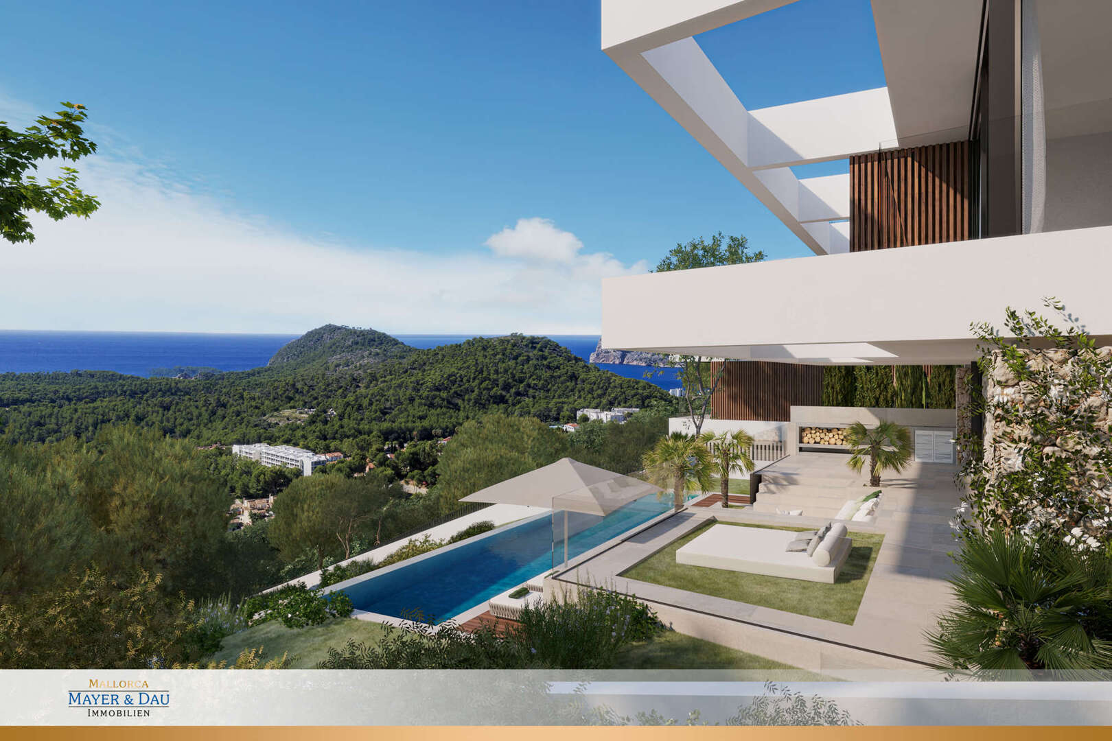 The outdoor area is a true oasis of well-being: an infinity pool, spacious terraces, an outdoor kitchen, a stylish lounge with a fireplace and an outdoor shower invite you to relax.