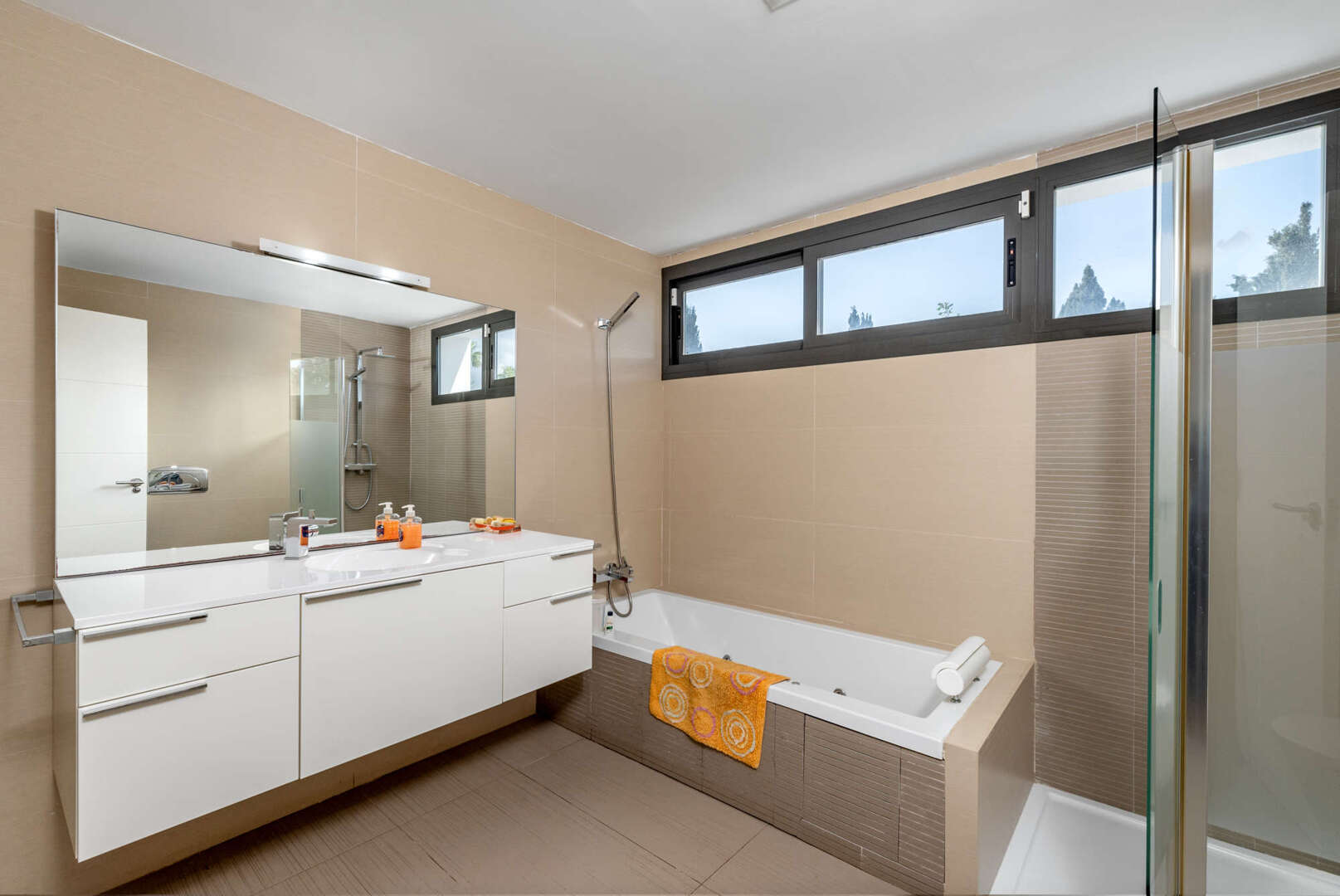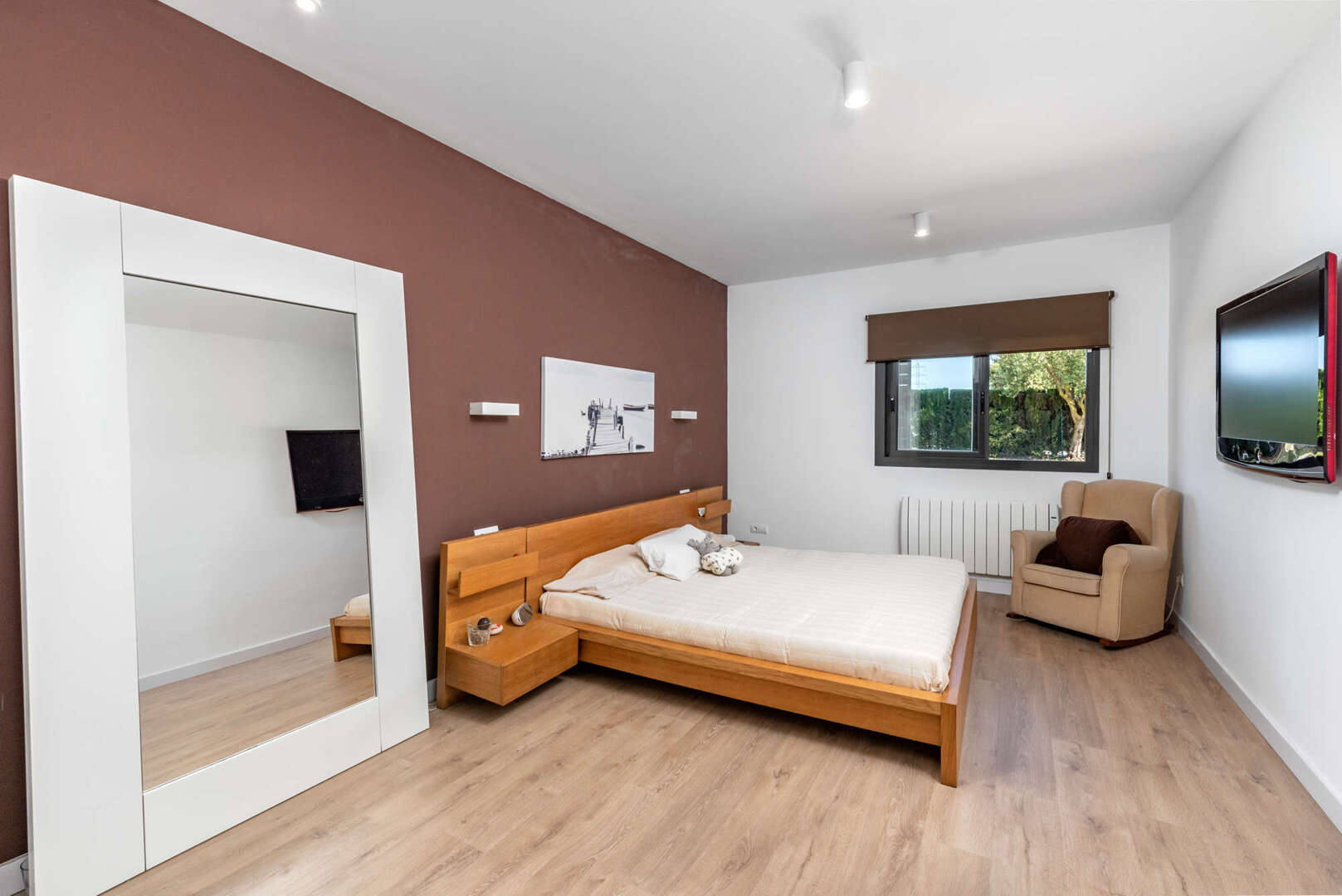 The house also impresses in terms of sustainability: hot water via solar energy, Climalit windows, floating wooden floors, a fireplace, electric heating in every room and central air conditioning ensure a pleasant indoor climate all year round.