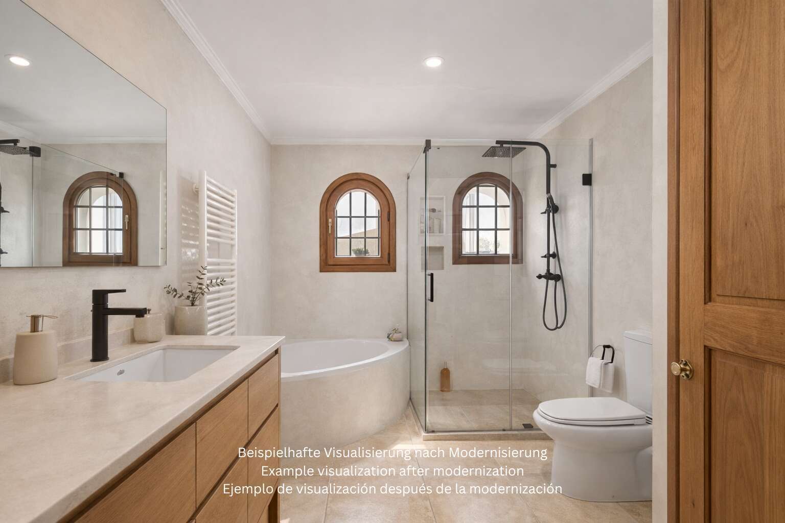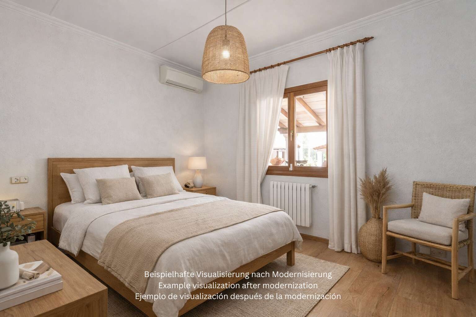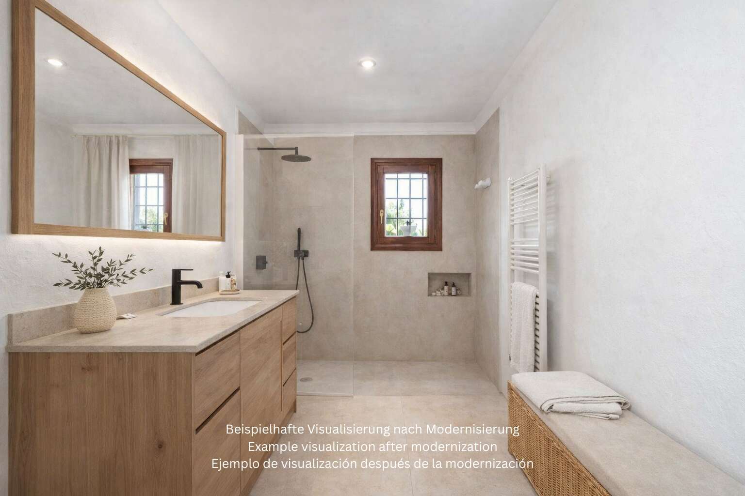 The spacious master bedroom with en-suite bathroom forms the exclusive retreat of this property. Two further double bedrooms share a tastefully designed bathroom. A further bedroom with its own en suite bathroom is available for guests. A highlight is the spacious studio on the upper floor with breathtaking views over the Mallorcan countryside as far as the bay of Alcudia.