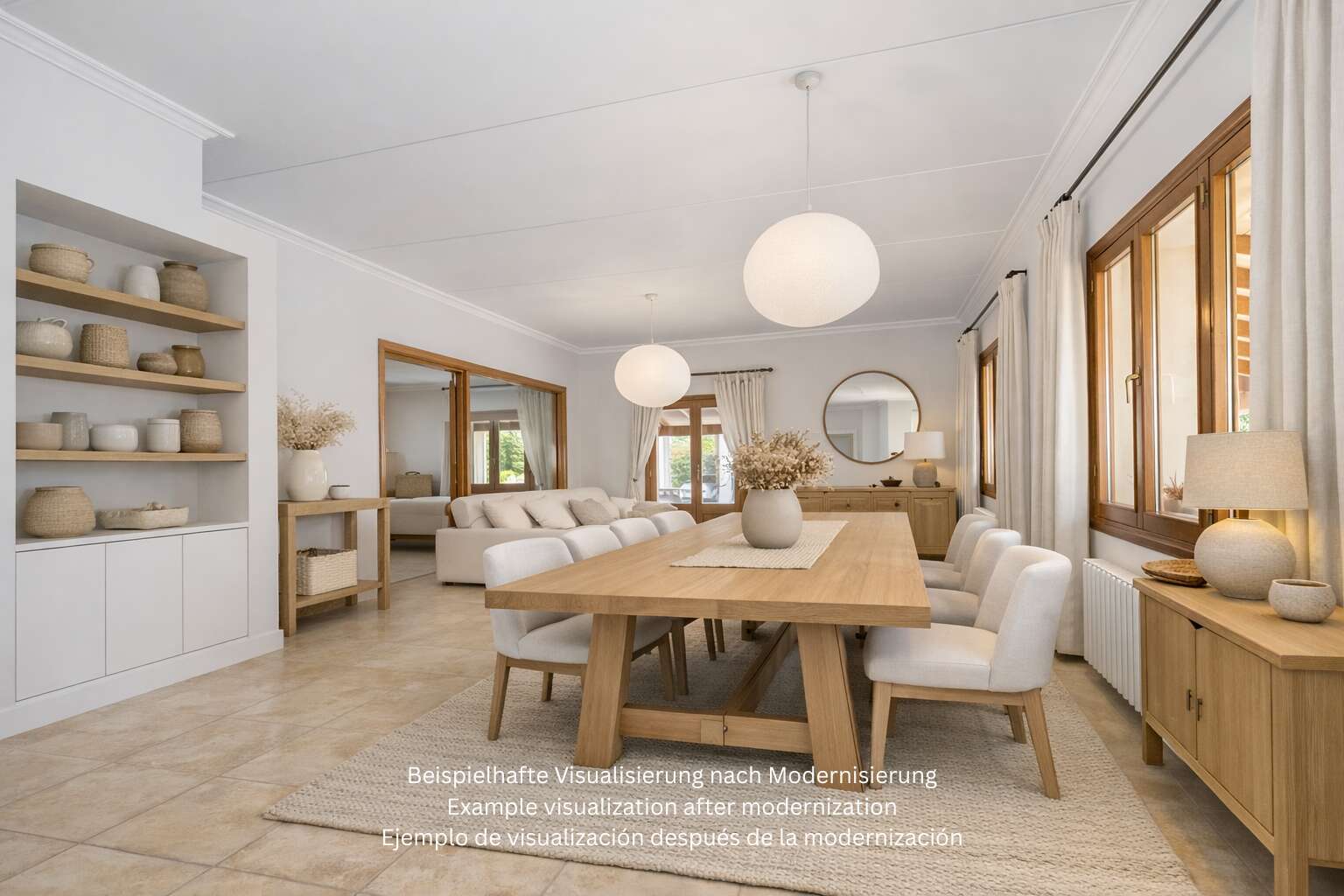 The main house welcomes you with a special living atmosphere that combines warmth and security. The interiors are practically designed, with flowing transitions between living, cooking and enjoyment. The living area and the impressive dining area with its impressive table are perfect for convivial evenings with family and friends. The fully equipped kitchen with central cooking island combines functionality with Mediterranean lightness.