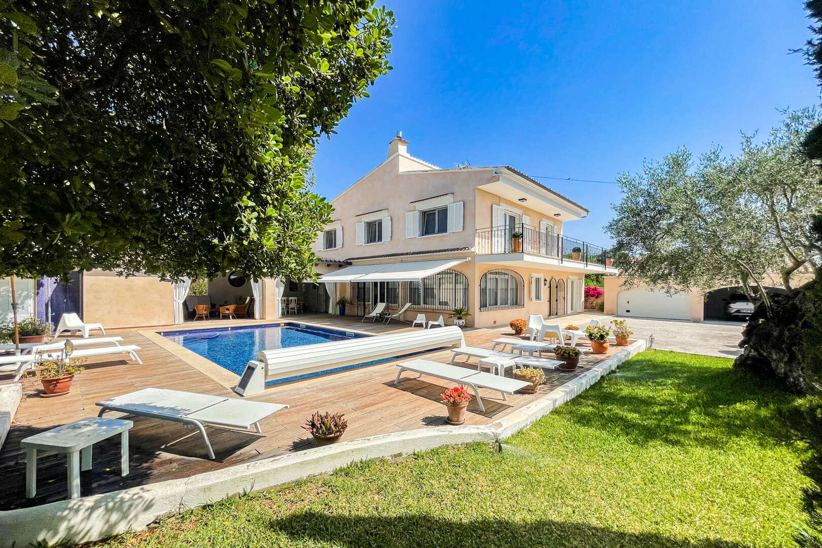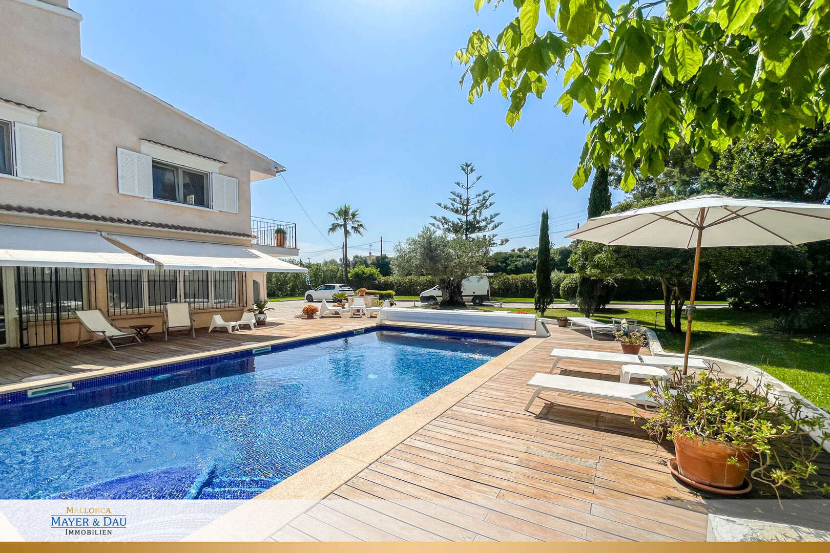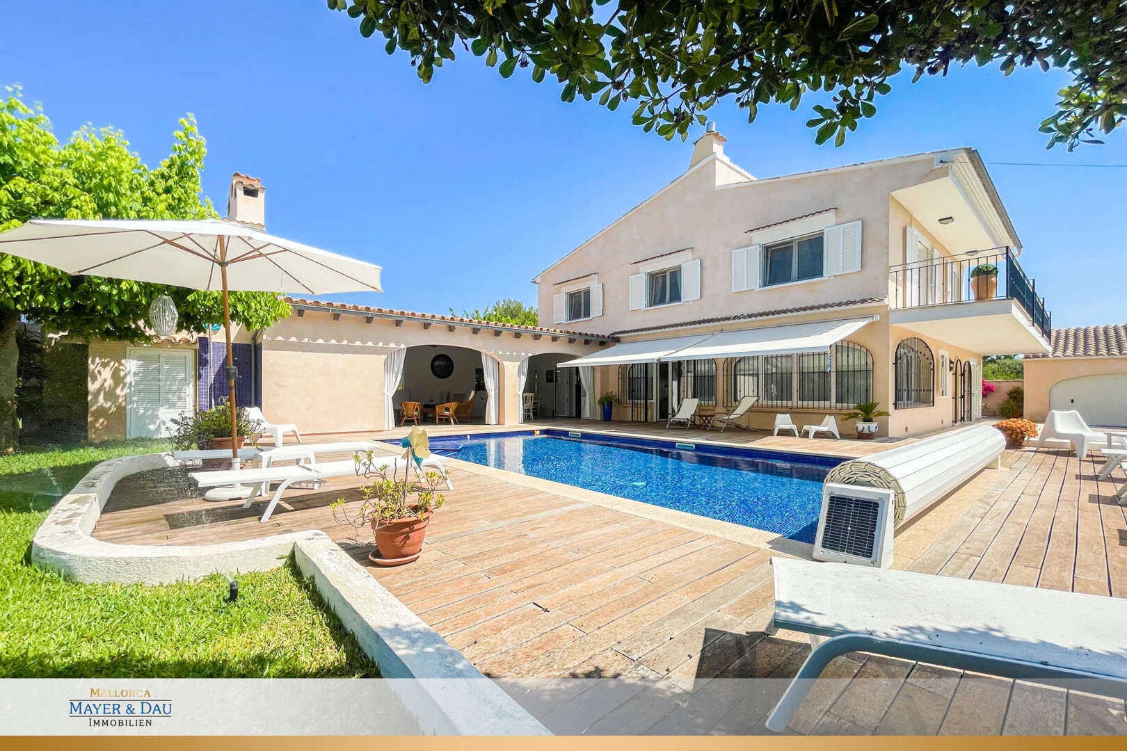 The lovingly landscaped plot impresses with Mediterranean plants, palm trees, idyllic seating areas and a large pool with cover. The covered chill-out terrace with an open oven and extensive sunbathing areas offer perfect outdoor enjoyment all year round. A spacious double garage, good access and all-round privacy complete the offer.