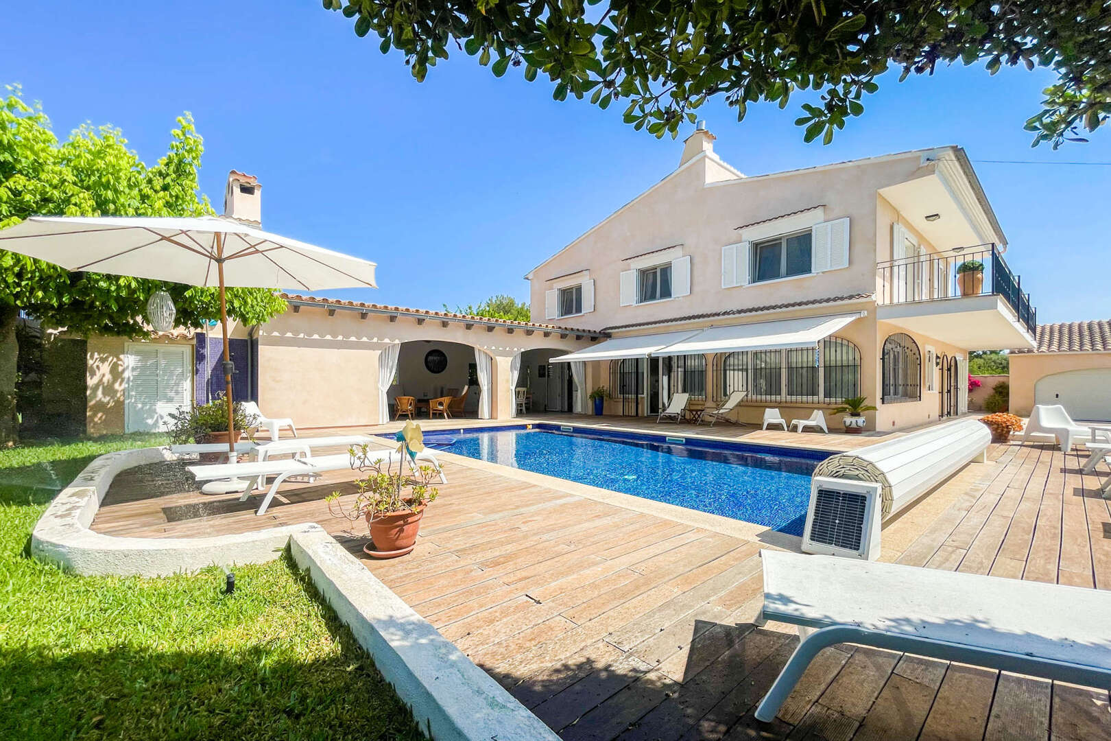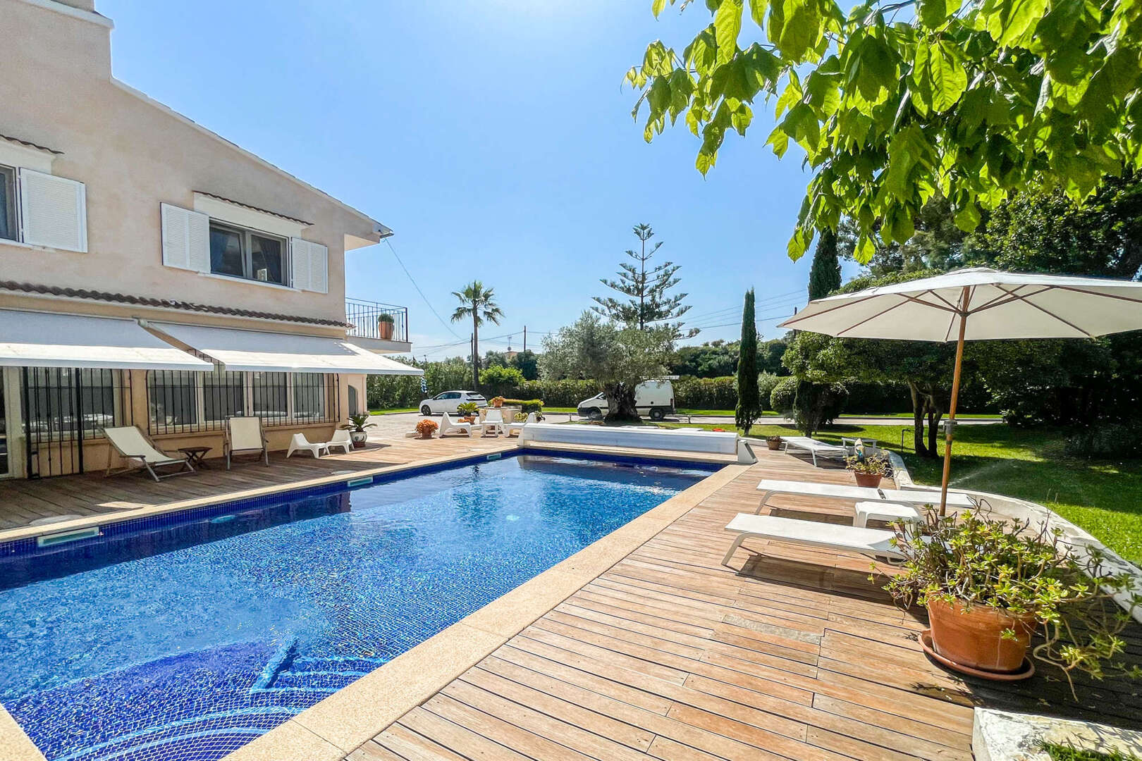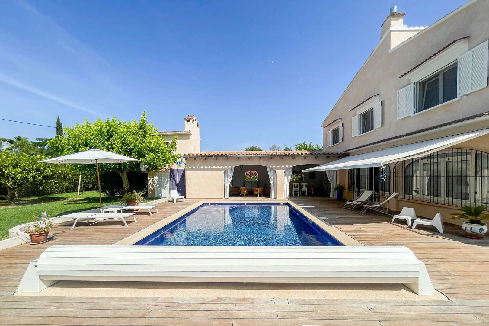 The lovingly landscaped plot impresses with Mediterranean plants, palm trees, idyllic seating areas and a large pool with cover. The covered chill-out terrace with an open oven and extensive sunbathing areas offer perfect outdoor enjoyment all year round. A spacious double garage, good access and all-round privacy complete the offer.