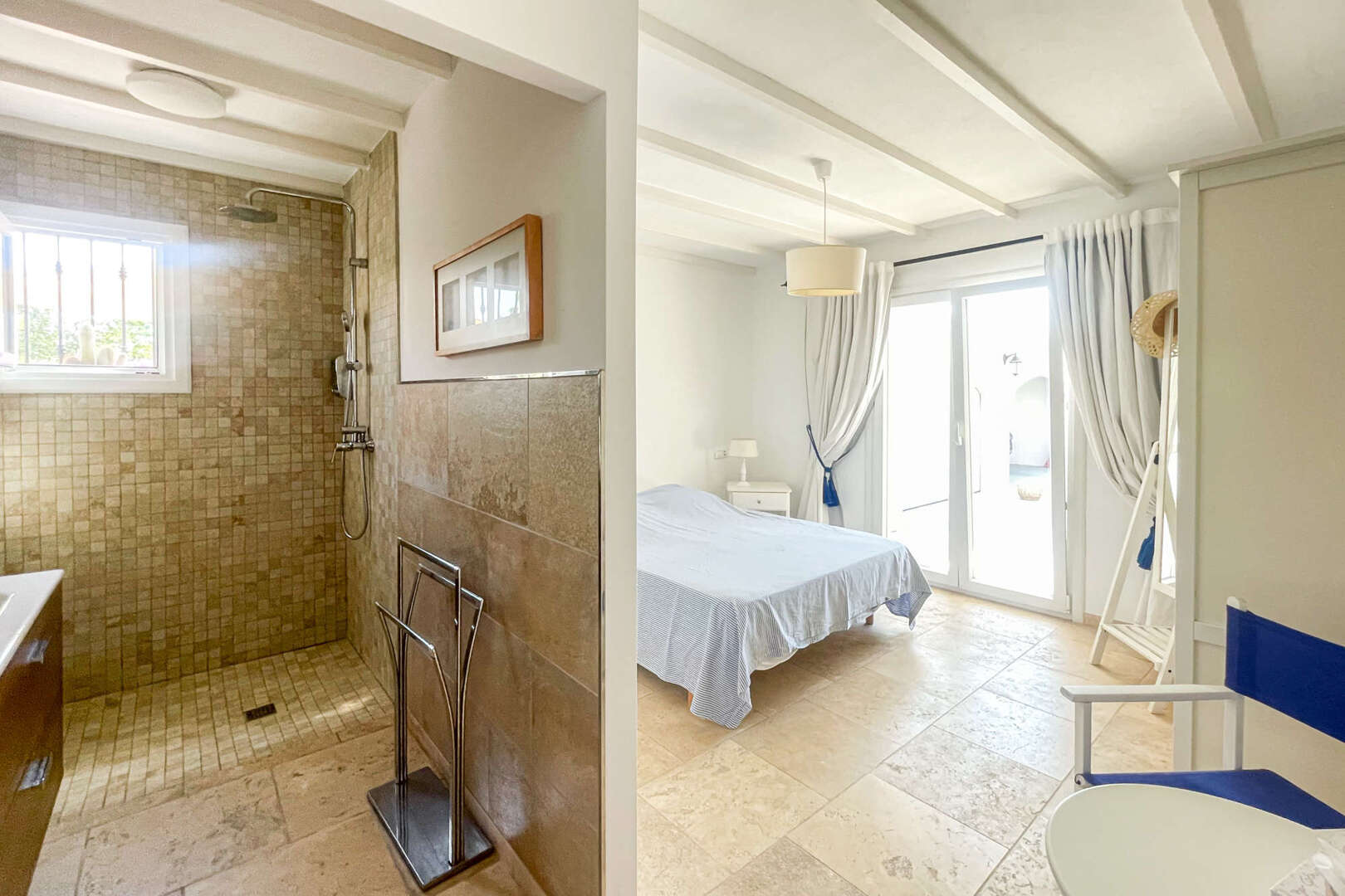 * Light-flooded living room with access to the pool area