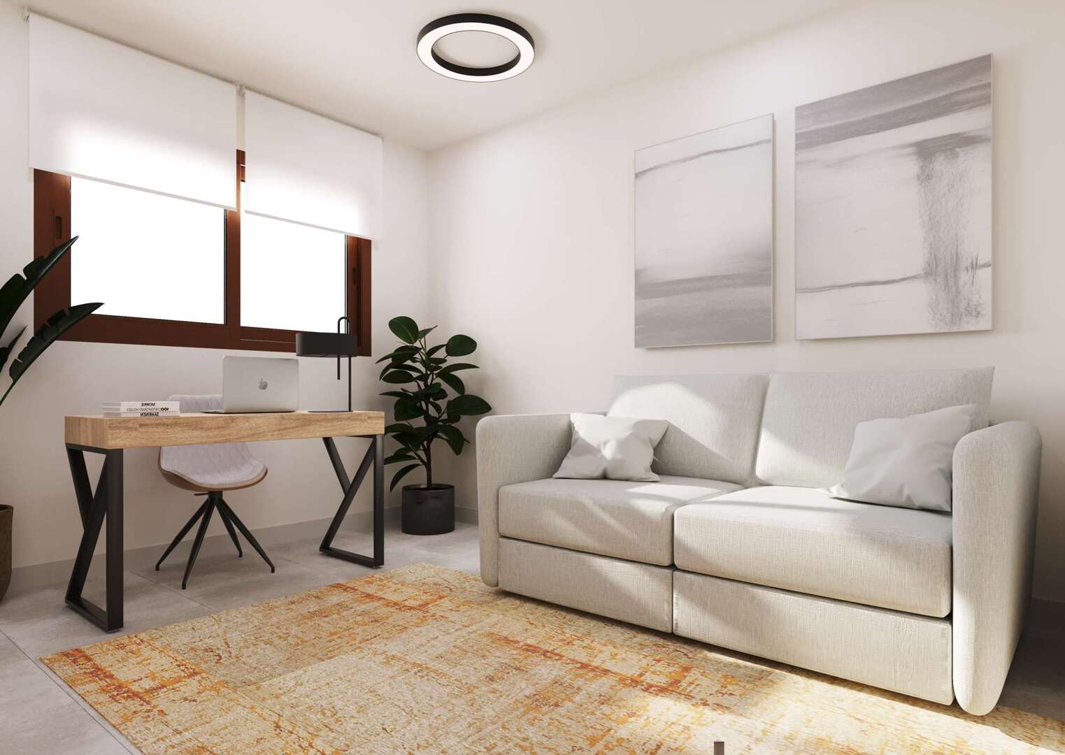 A practical utility room with washing machine connection guarantees additional convenience in everyday life. The modern cooling/heating system ensures pleasant temperatures, providing a pleasant indoor climate in both summer and winter. Electric blinds on the windows make it easy to regulate the light, while the built-in cupboards offer generous storage space.