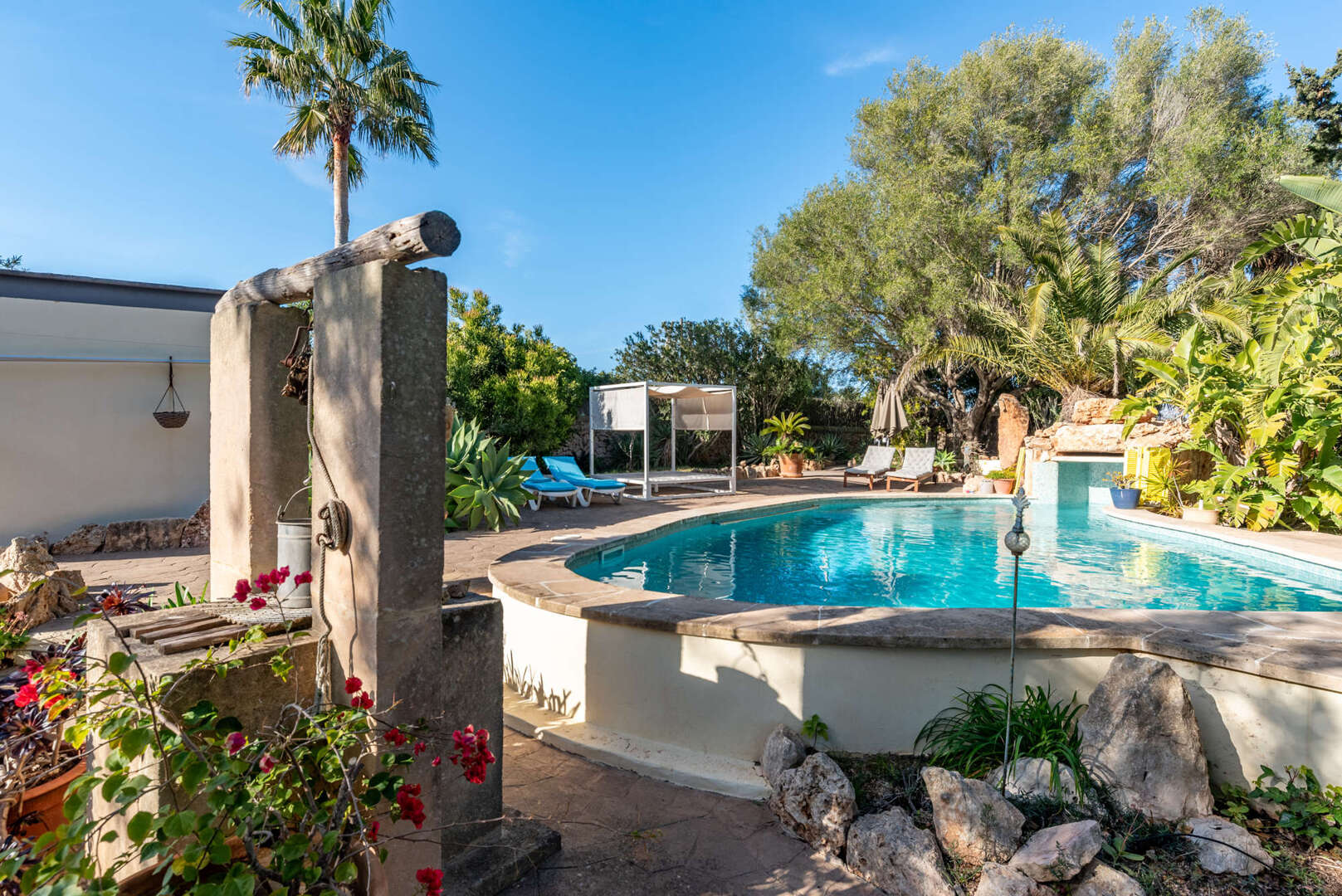 The lovingly landscaped outdoor area with several seating areas and an unusually designed pool with waterfall creates an atmosphere of pure relaxation - embedded in nature and tranquillity.