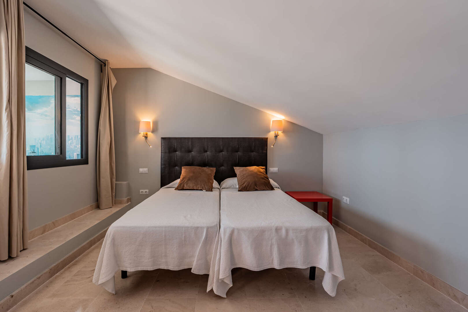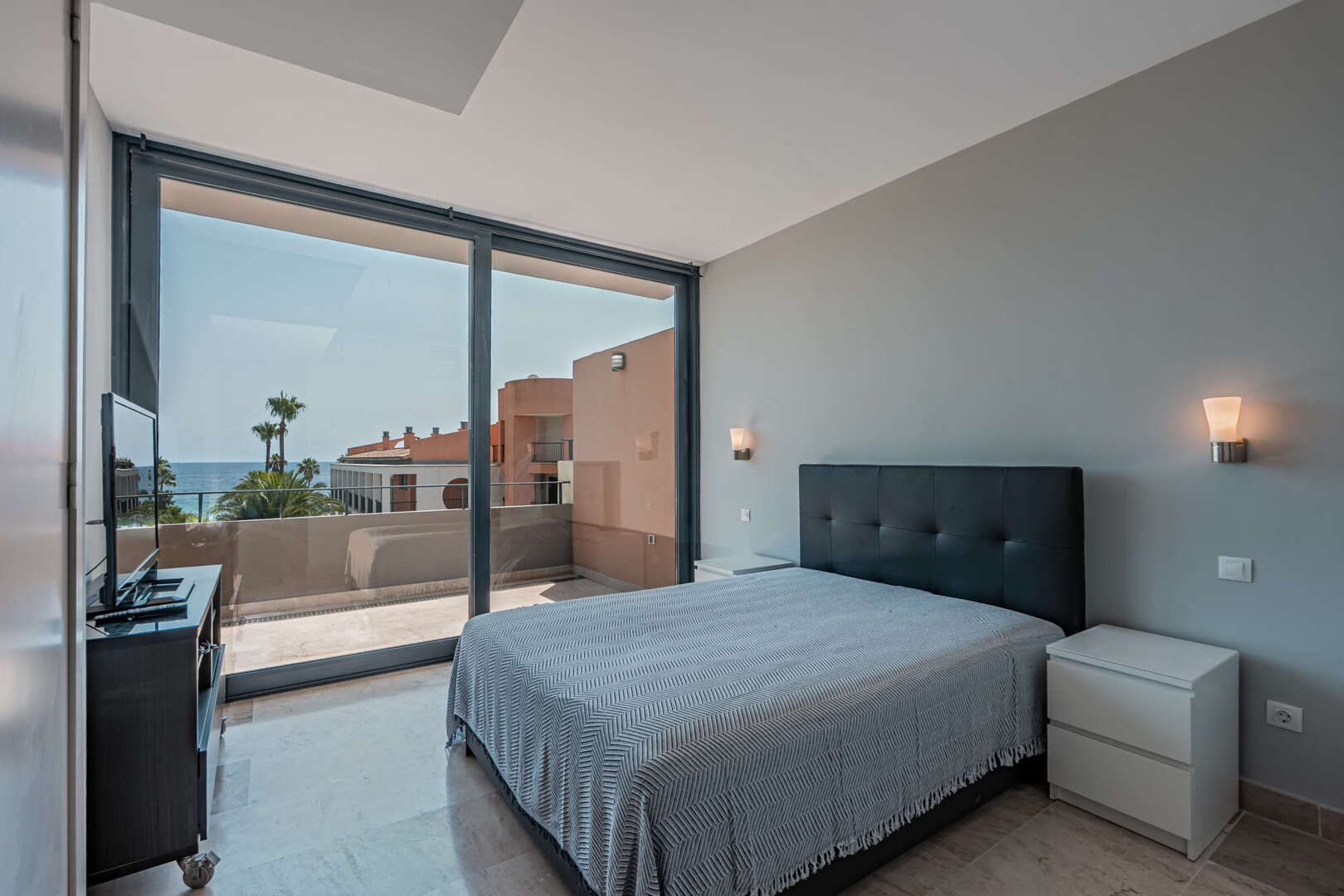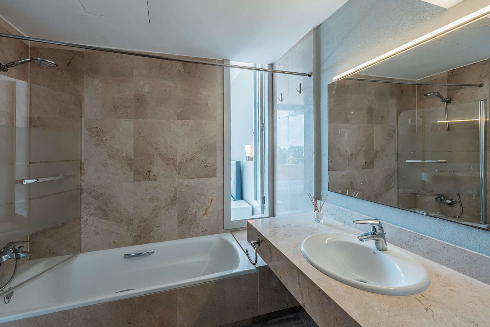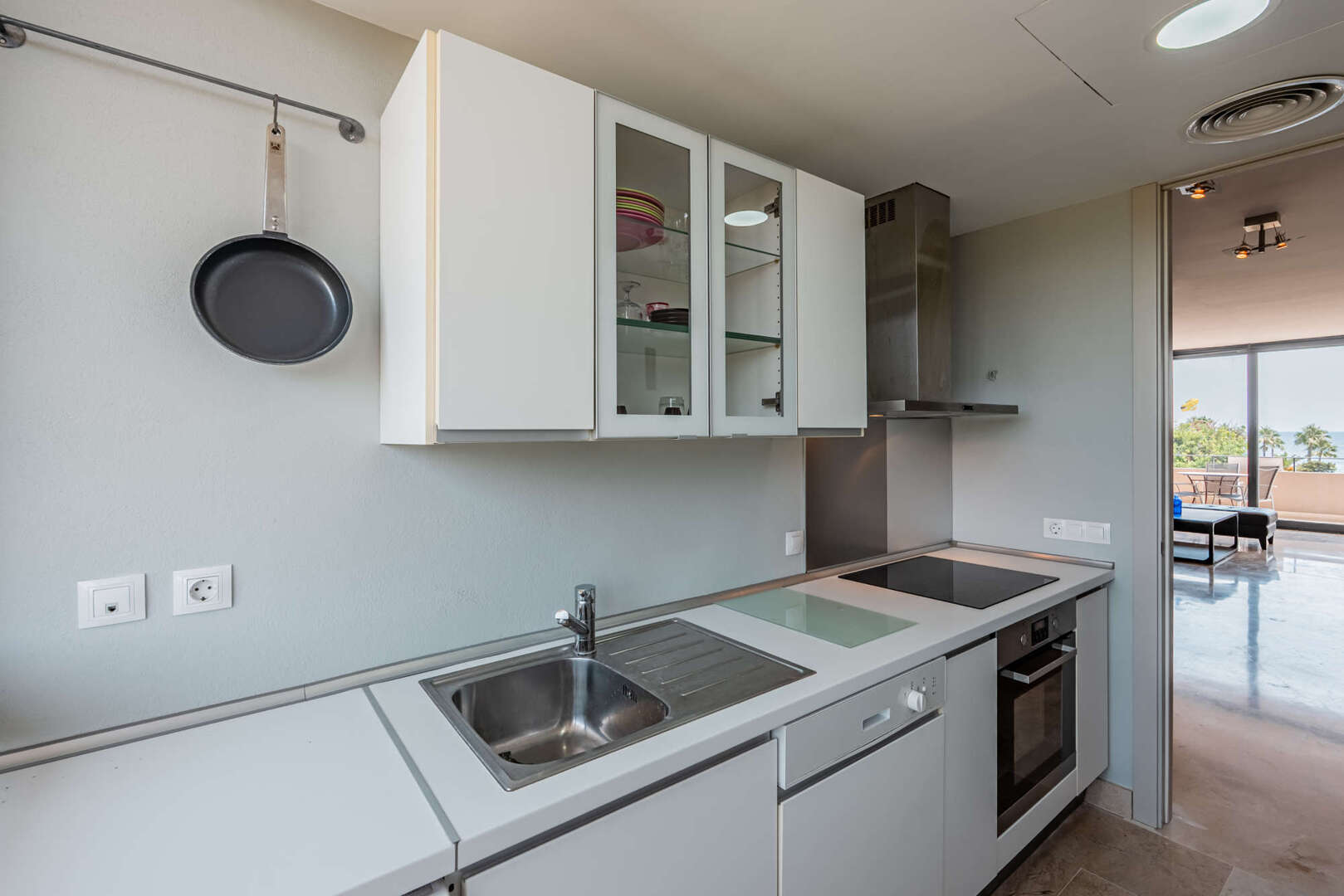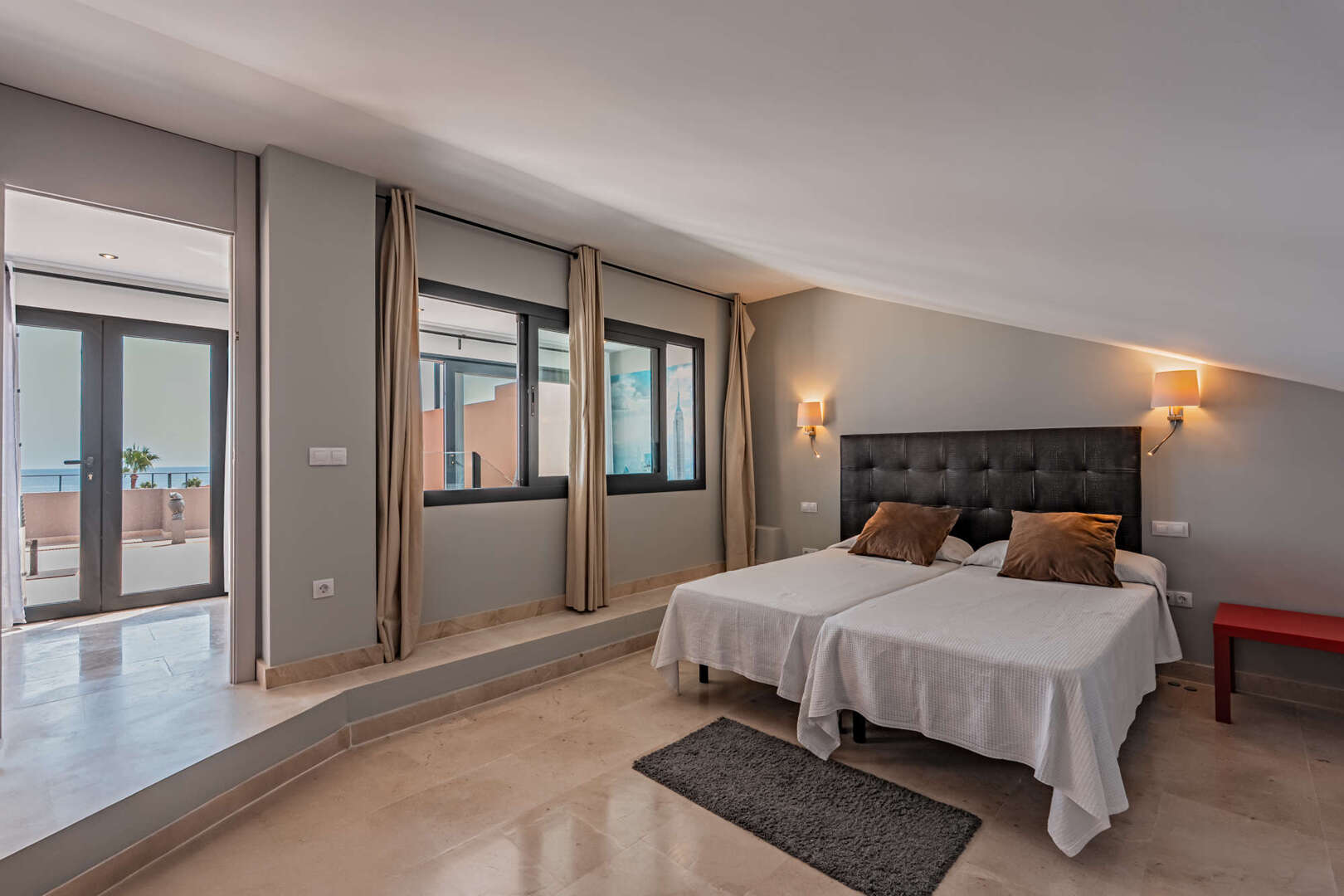 On the lower floor, the penthouse has a double bedroom and the master bedroom, each with an en-suite bathroom. The latter is characterized by a fantastic sea view as soon as you get up. Furthermore, floor-to-ceiling sliding doors lead to the spacious balcony from there as well as from the living/dining area. A fitted kitchen with a view of the mountains completes the lower floor.