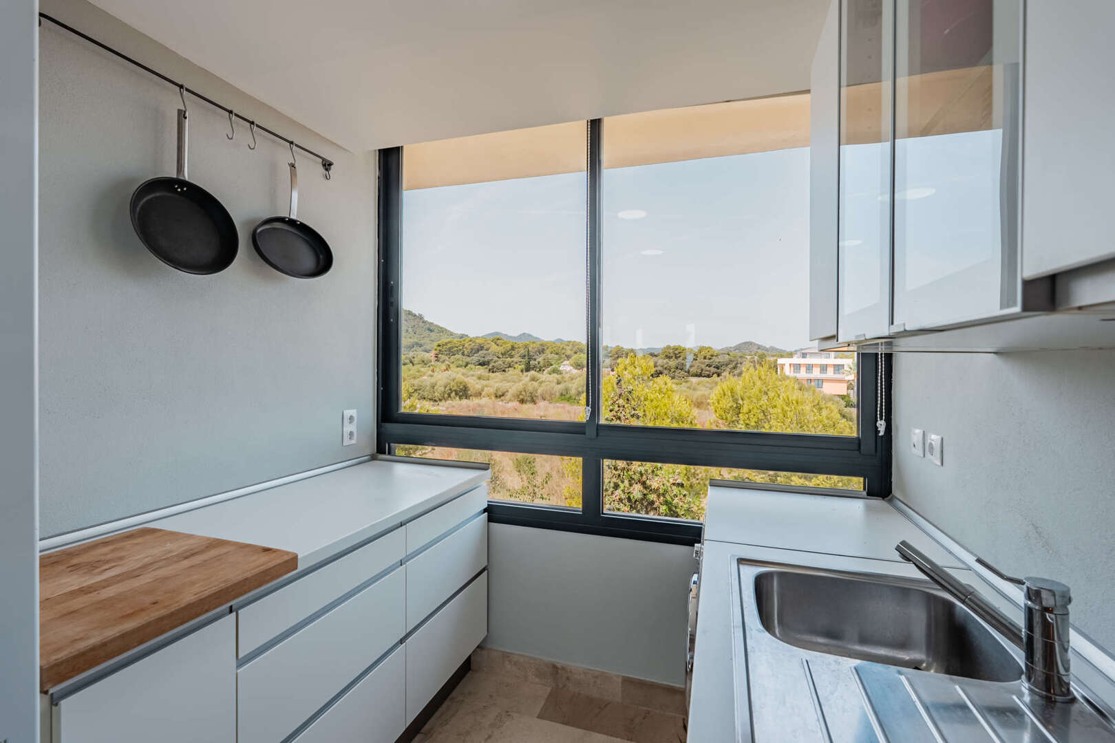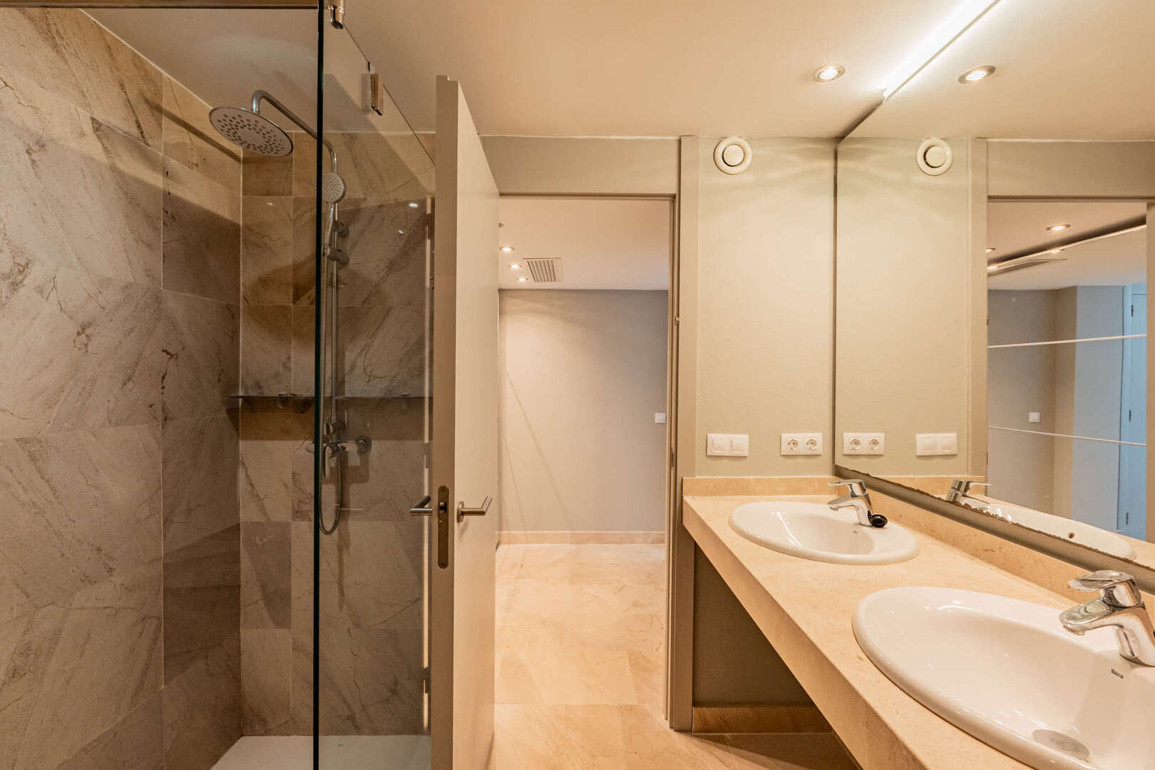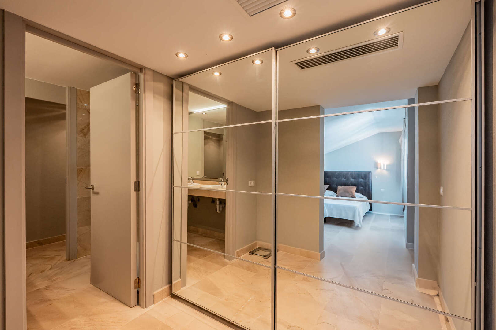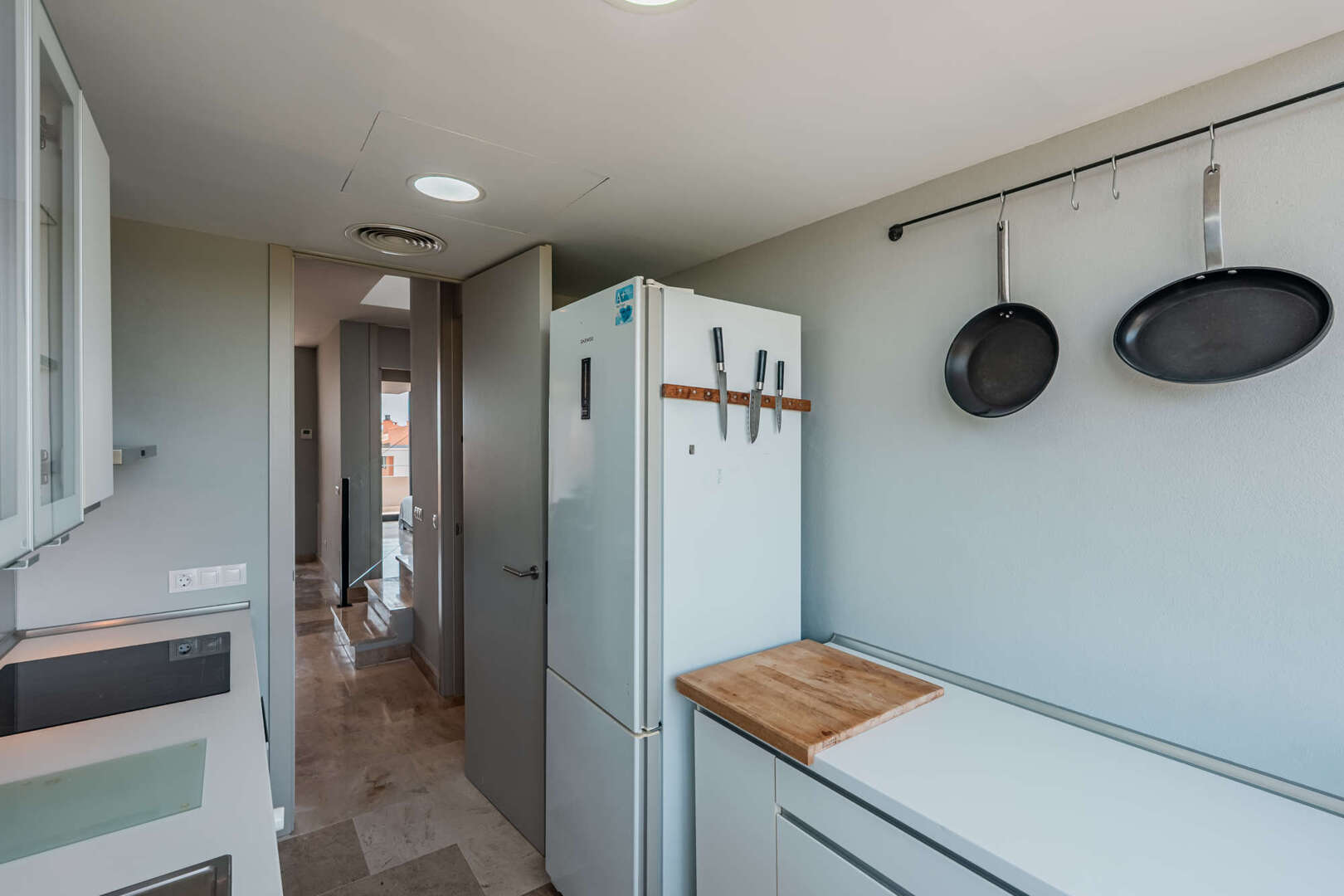 On the lower floor, the penthouse has a double bedroom and the master bedroom, each with an en-suite bathroom. The latter is characterized by a fantastic sea view as soon as you get up. Furthermore, floor-to-ceiling sliding doors lead to the spacious balcony from there as well as from the living/dining area. A fitted kitchen with a view of the mountains completes the lower floor.