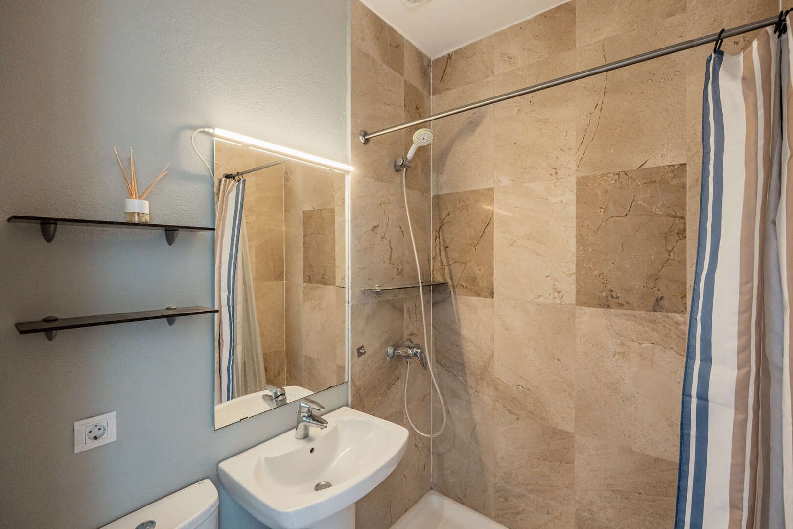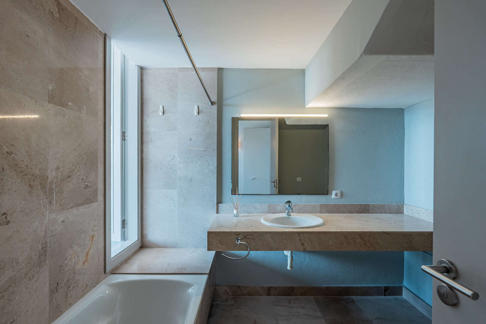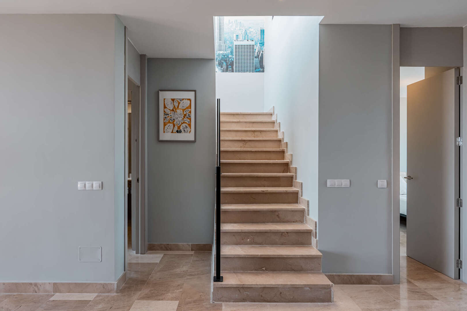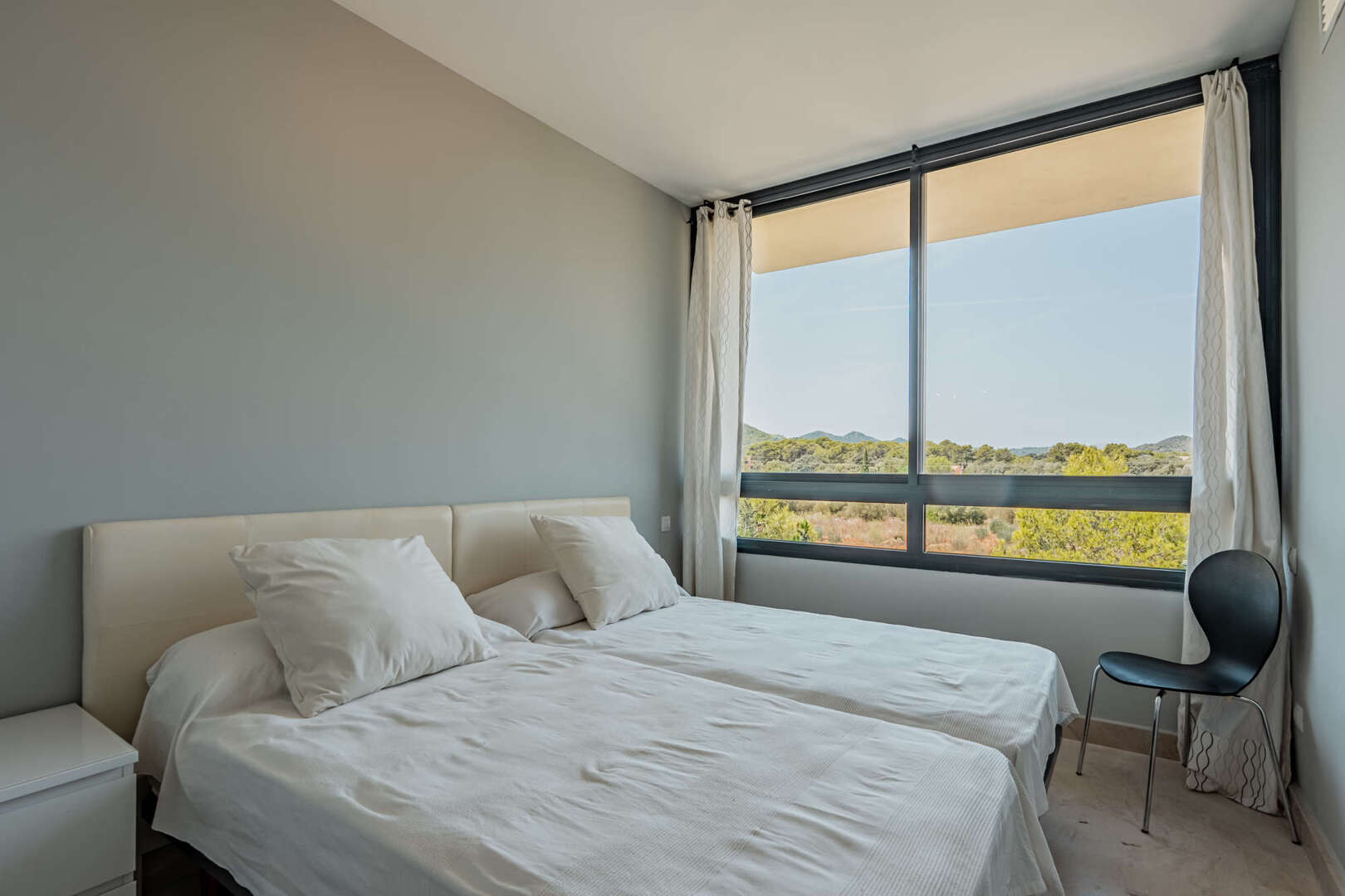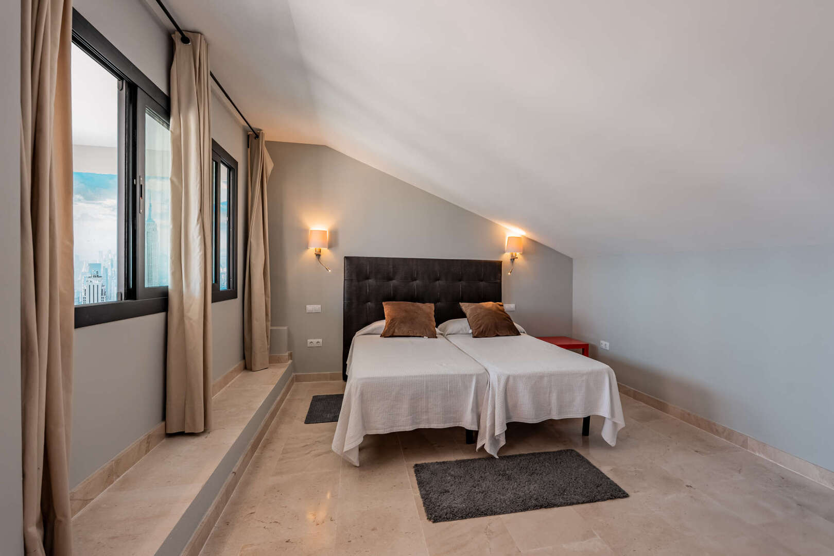 On the lower floor, the penthouse has a double bedroom and the master bedroom, each with an en-suite bathroom. The latter is characterized by a fantastic sea view as soon as you get up. Furthermore, floor-to-ceiling sliding doors lead to the spacious balcony from there as well as from the living/dining area. A fitted kitchen with a view of the mountains completes the lower floor.