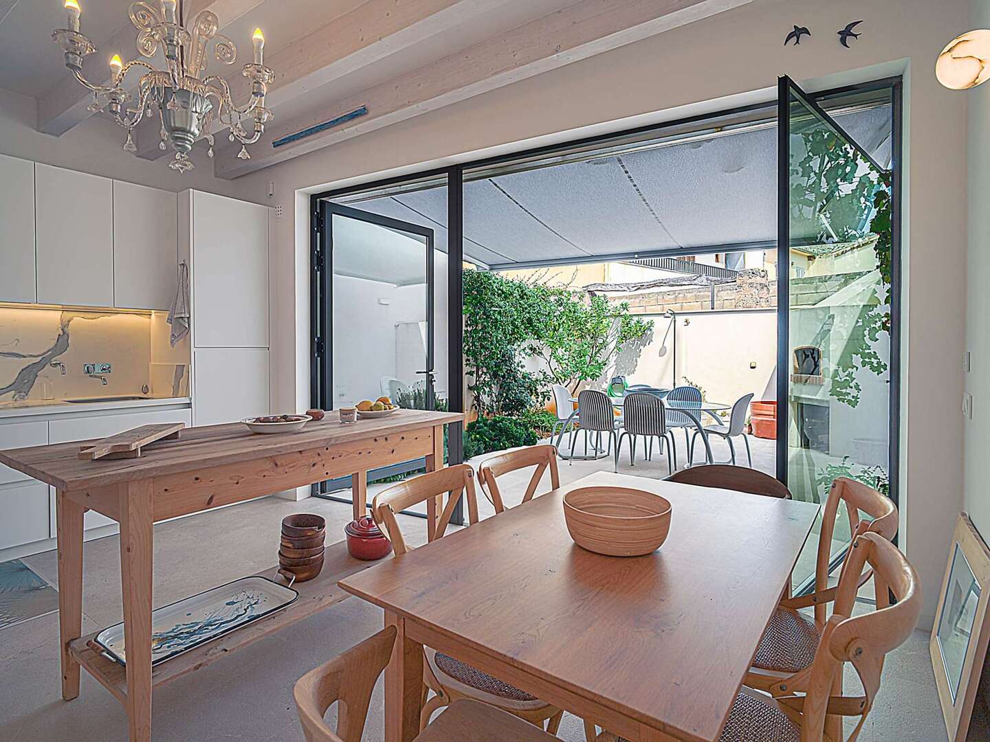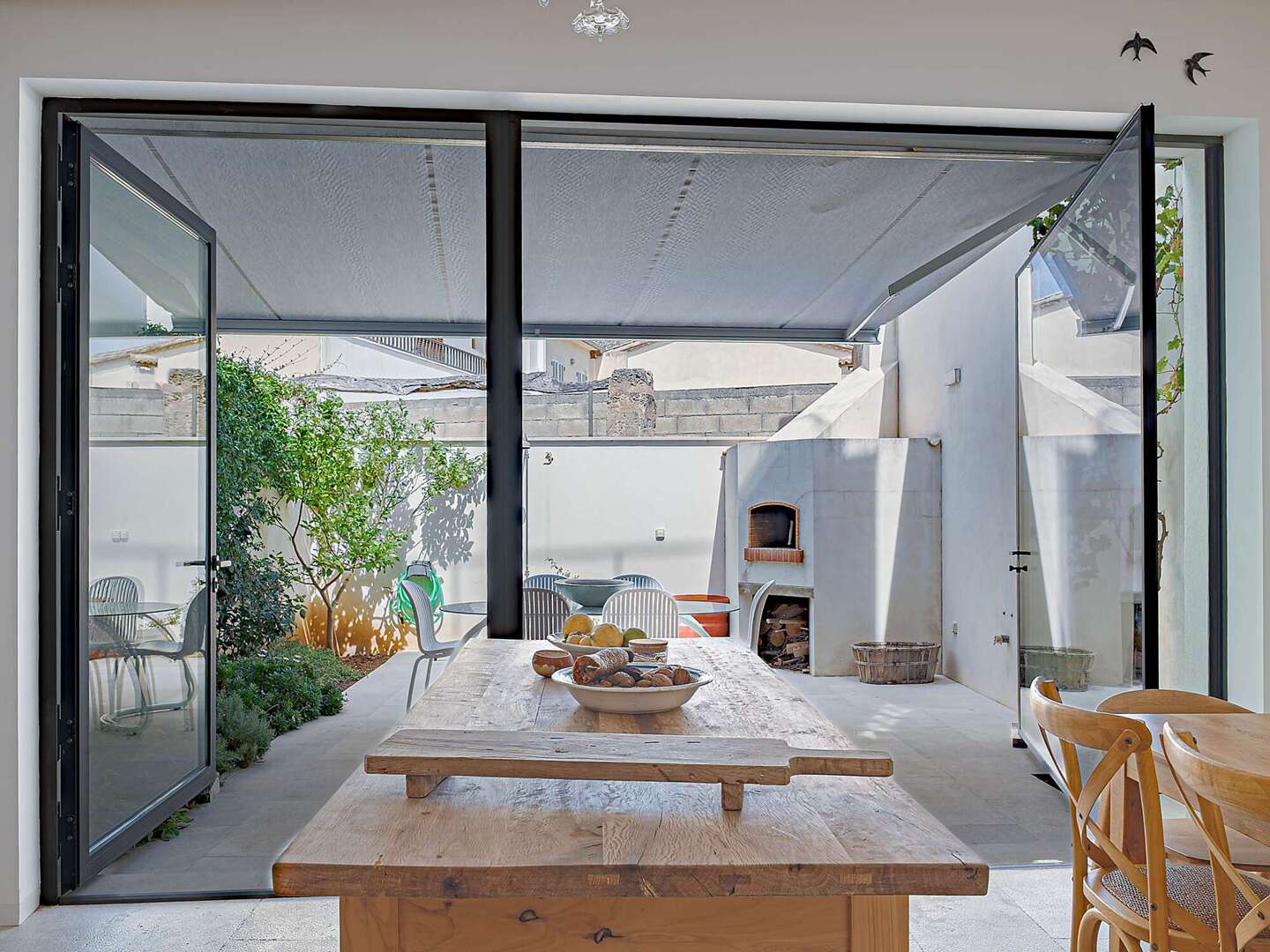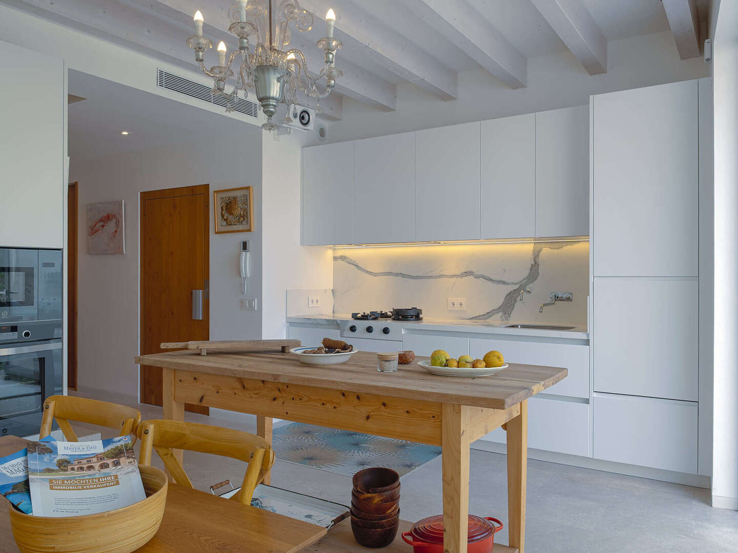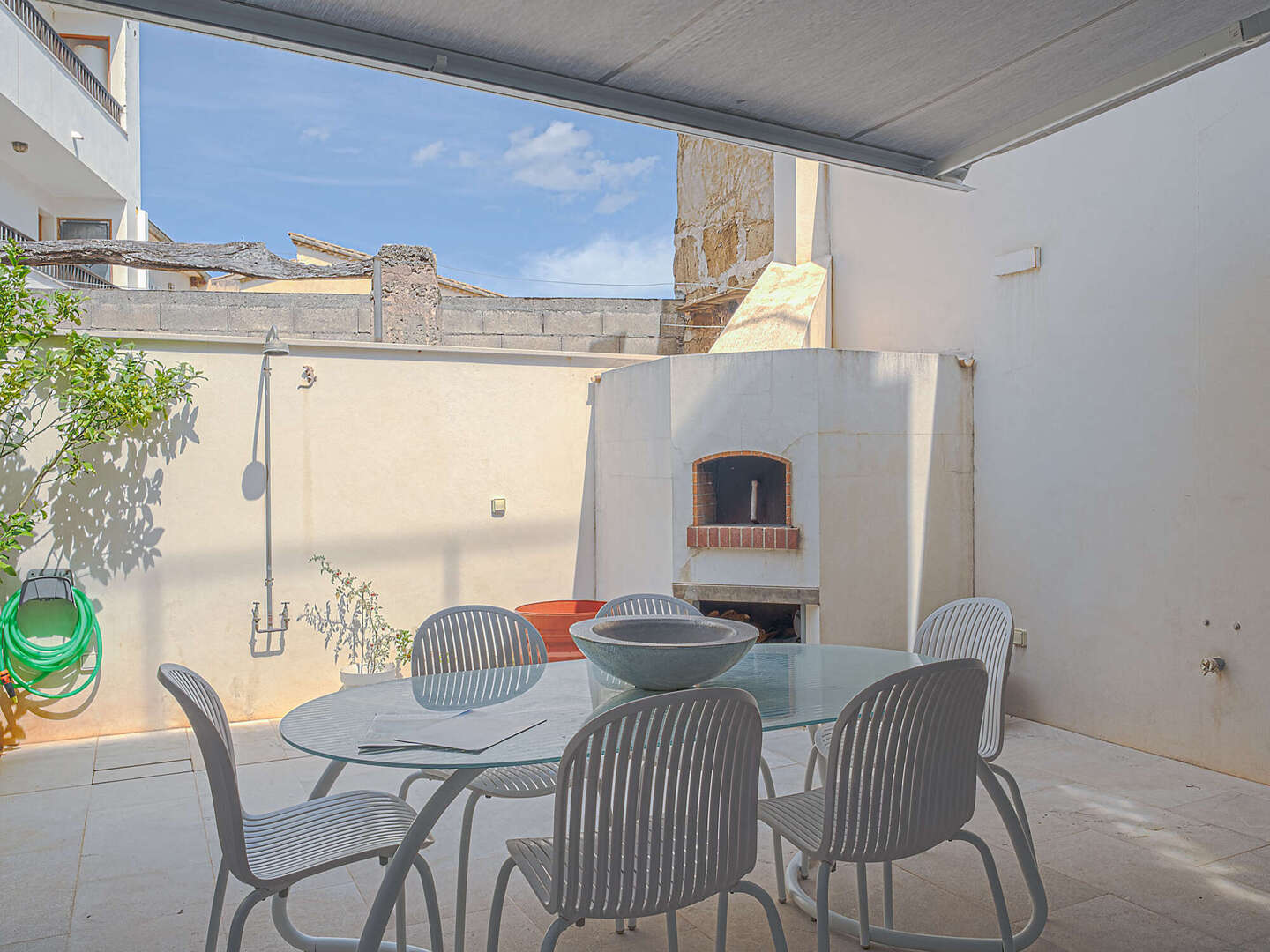 Particular attention was paid to the use of high-quality materials: Fine natural stone floors have been laid throughout the house, supported by modern underfloor heating. In addition, there are exclusive tiles that are not from standard series, but are specially made unique pieces. The walls are completely plastered with 100% lime, which ensures a healthy indoor climate. An automatic air purification system continuously filters the air, guaranteeing the highest quality of living. In the inner courtyard, a wood-fired oven invites you to cook exquisite meals and enjoy Mediterranean moments.