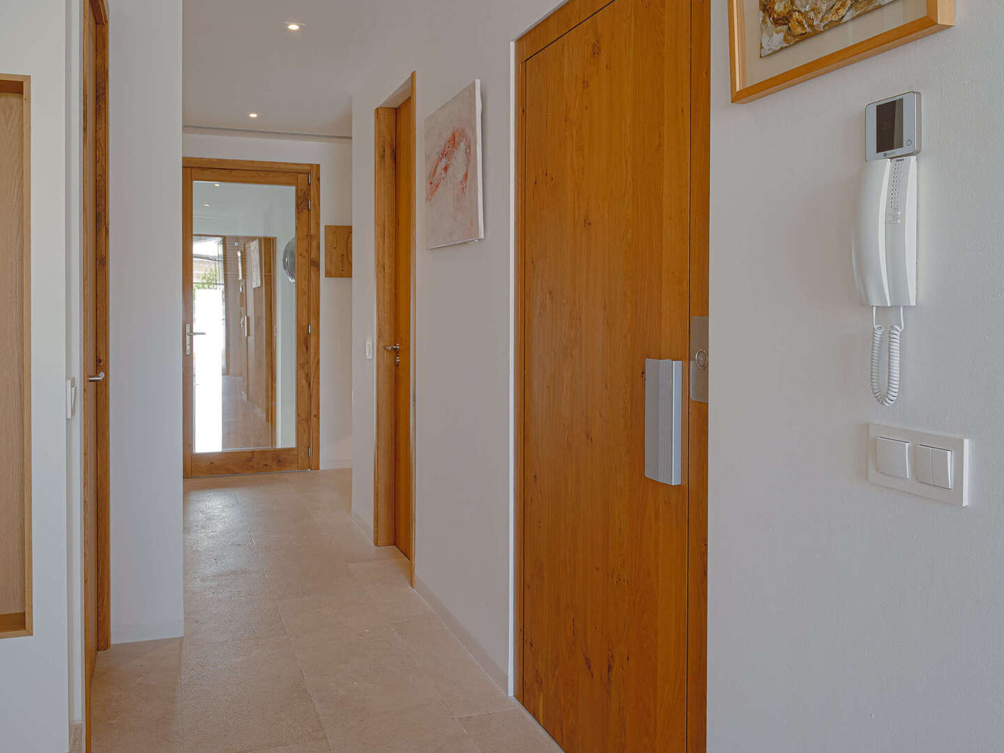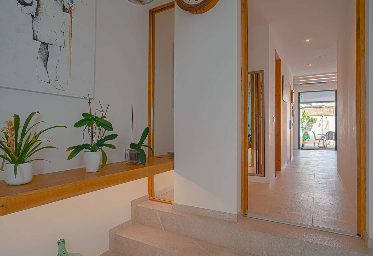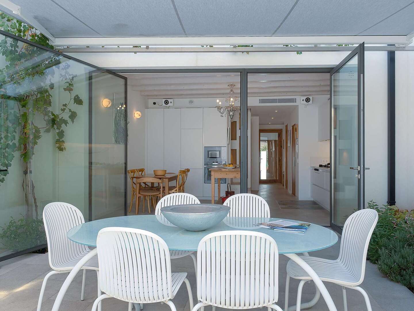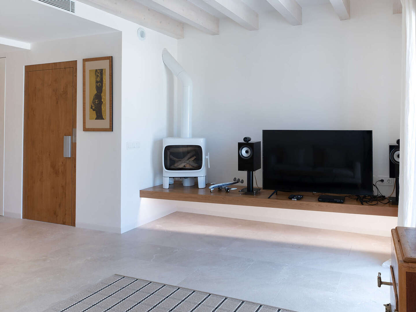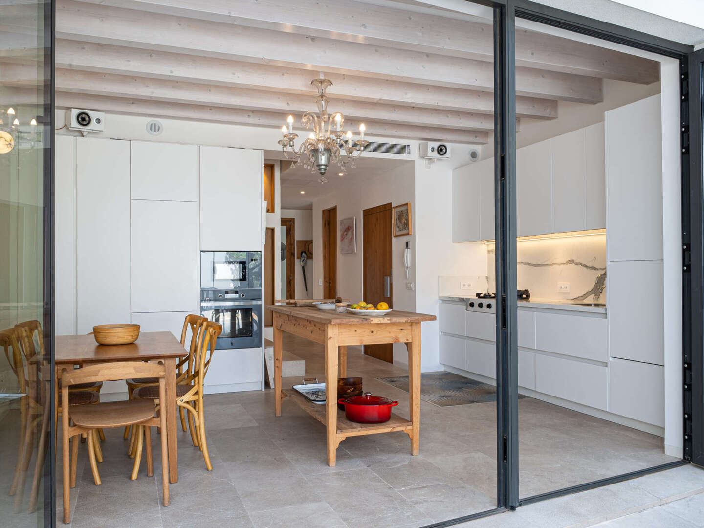 Particular attention was paid to the use of high-quality materials: Fine natural stone floors have been laid throughout the house, supported by modern underfloor heating. In addition, there are exclusive tiles that are not from standard series, but are specially made unique pieces. The walls are completely plastered with 100% lime, which ensures a healthy indoor climate. An automatic air purification system continuously filters the air, guaranteeing the highest quality of living. In the inner courtyard, a wood-fired oven invites you to cook exquisite meals and enjoy Mediterranean moments.
