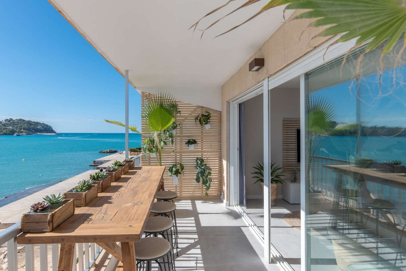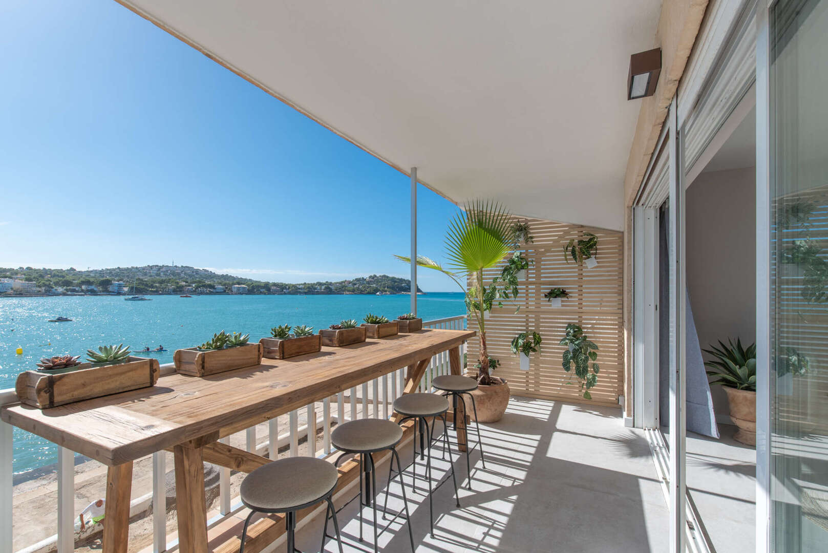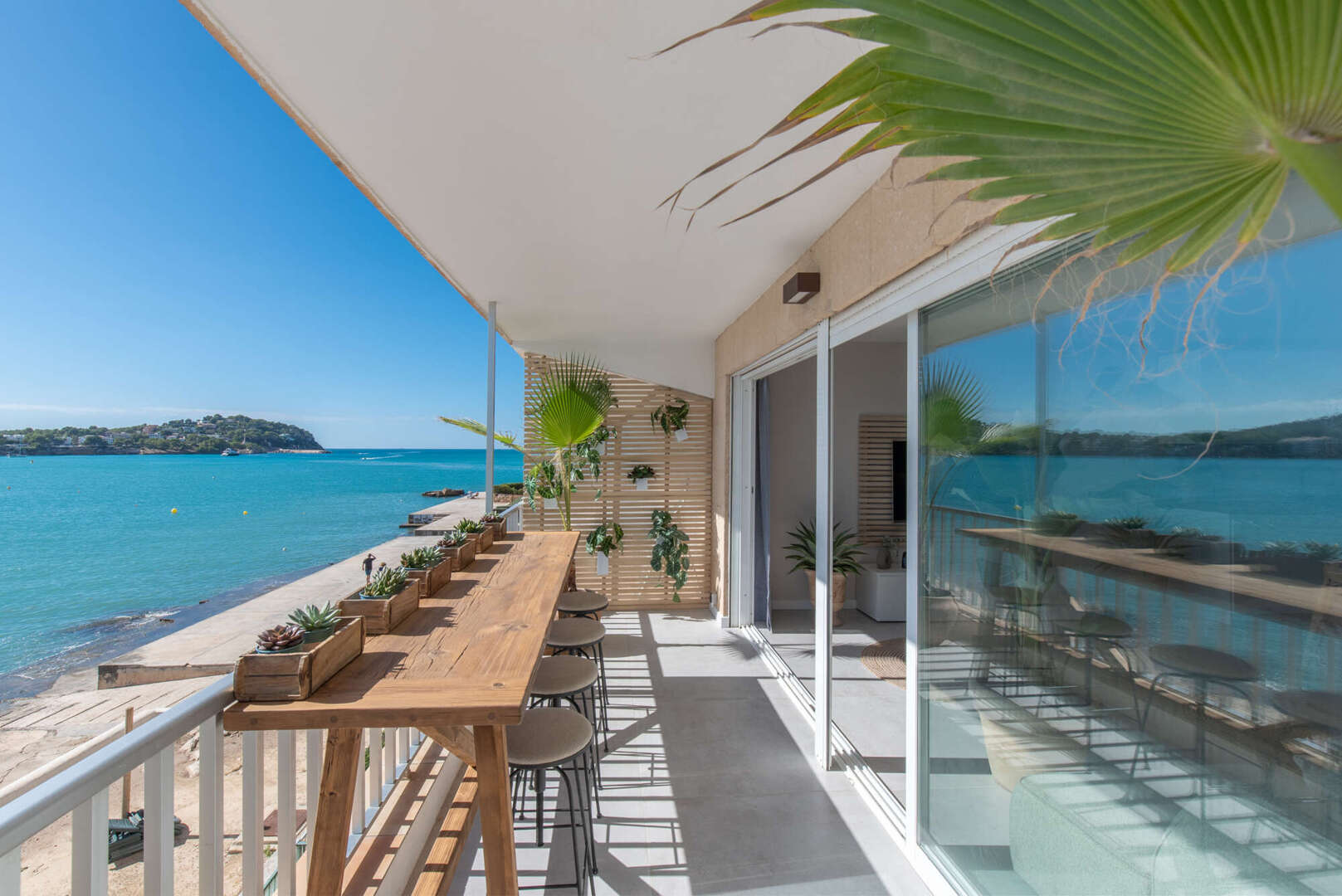 The continuous window front opens up the living space to the bay of Santa Ponsa and is accompanied by a spacious balcony that stretches the entire length of the façade. Here you can enjoy the sun, sea and absolute tranquillity in a private atmosphere.