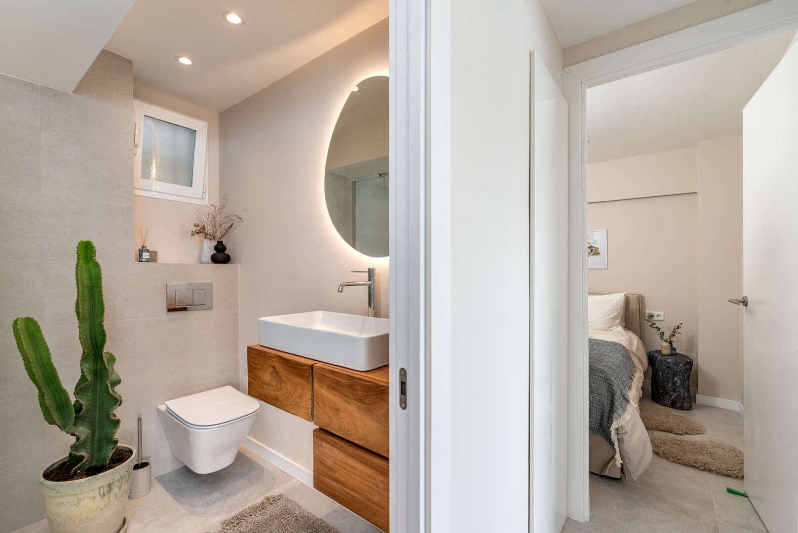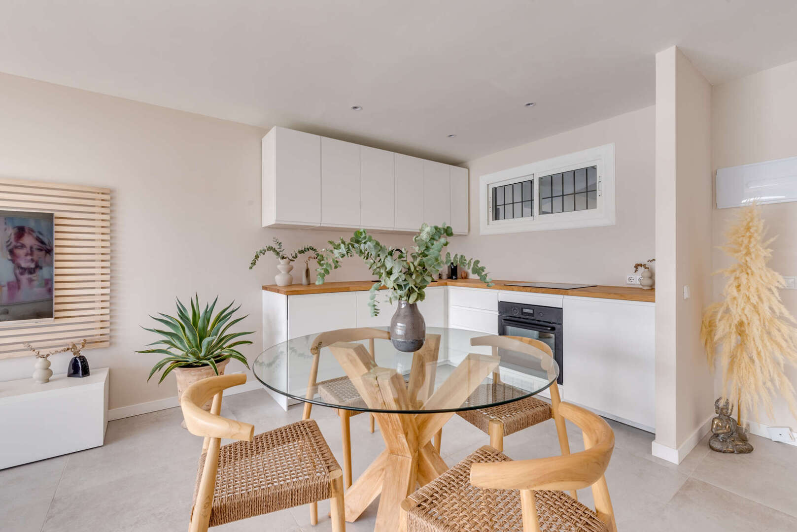 The apartment has two light-flooded bedrooms, an elegant bathroom with a floor-to-ceiling shower and an open, modern kitchen that blends harmoniously into the living and dining area. The well-thought-out floor plan and high-quality furnishings create a Mediterranean feel full of lightness and style.