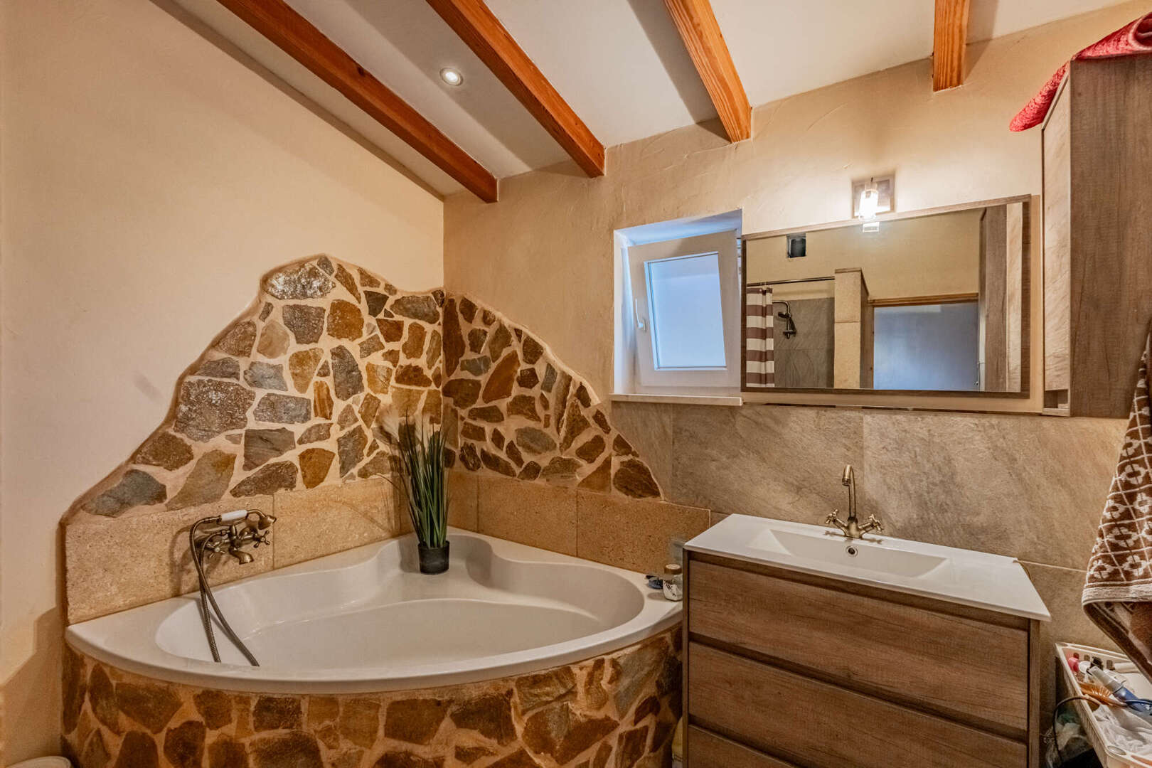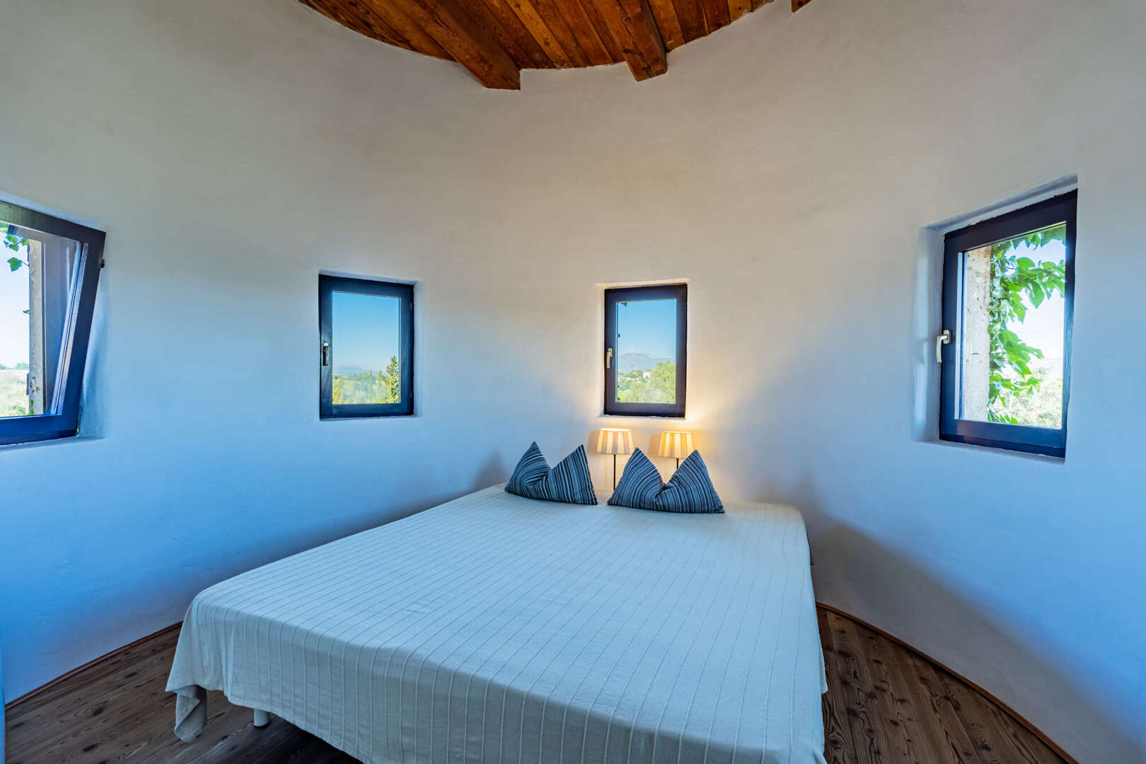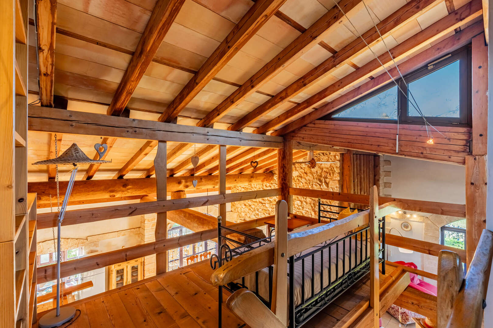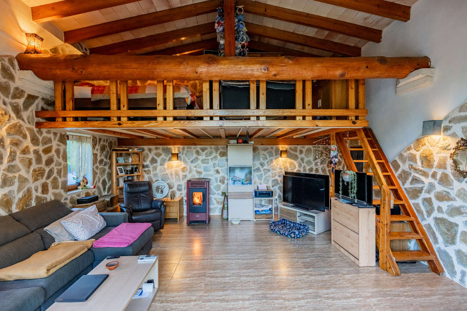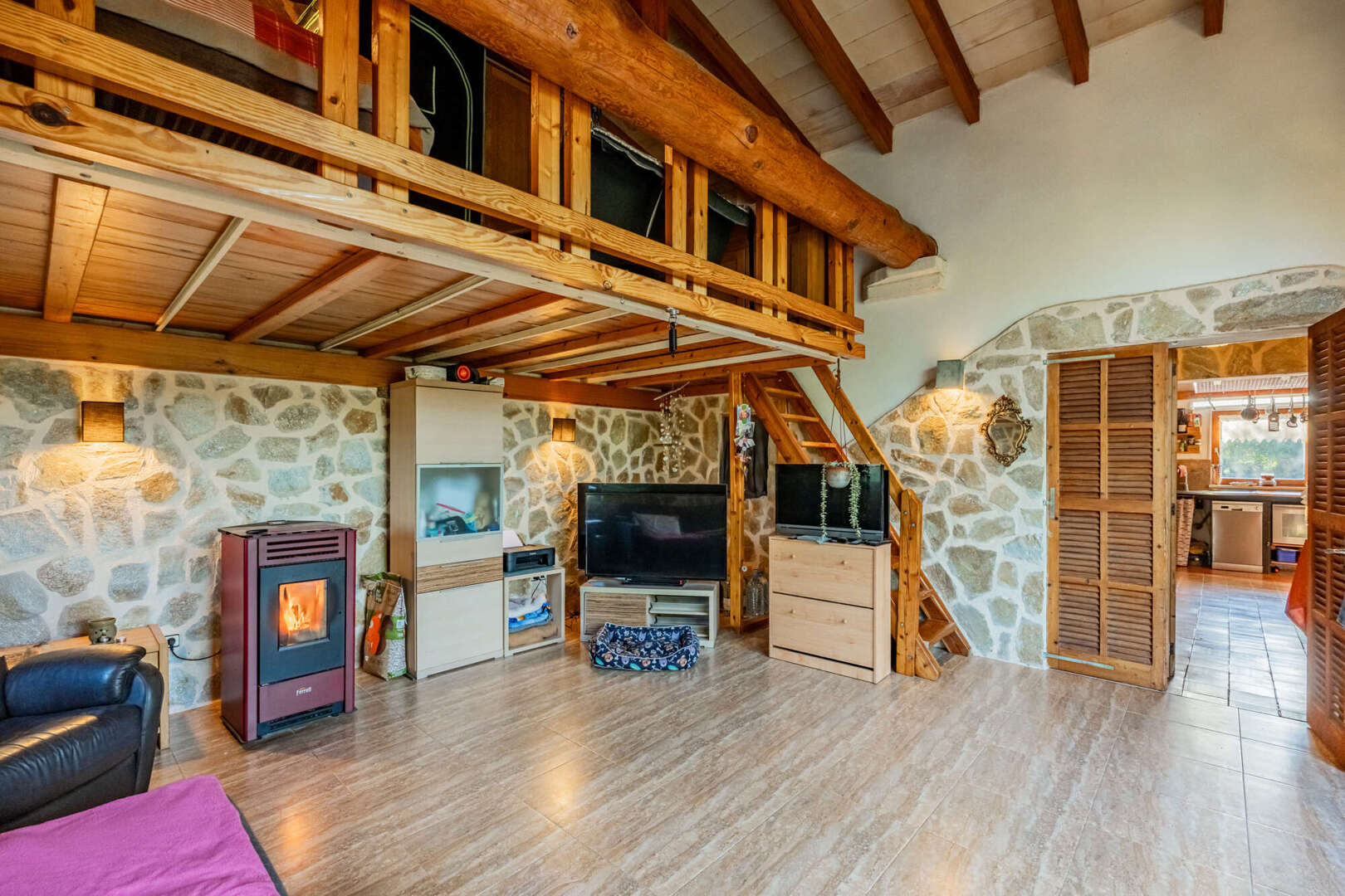 Inside, natural stone, solid wooden beams, high ceilings and large arched windows create a warm yet stately ambience. The open-plan living/dining area with wood-burning stove is harmoniously connected to the gallery via a wooden staircase. On the first floor is the spacious master bedroom with walk-in closet, en suite bathroom in the tower and access to the terrace. The second bedroom in the green tower offers a unique panoramic view through cleverly positioned windows.