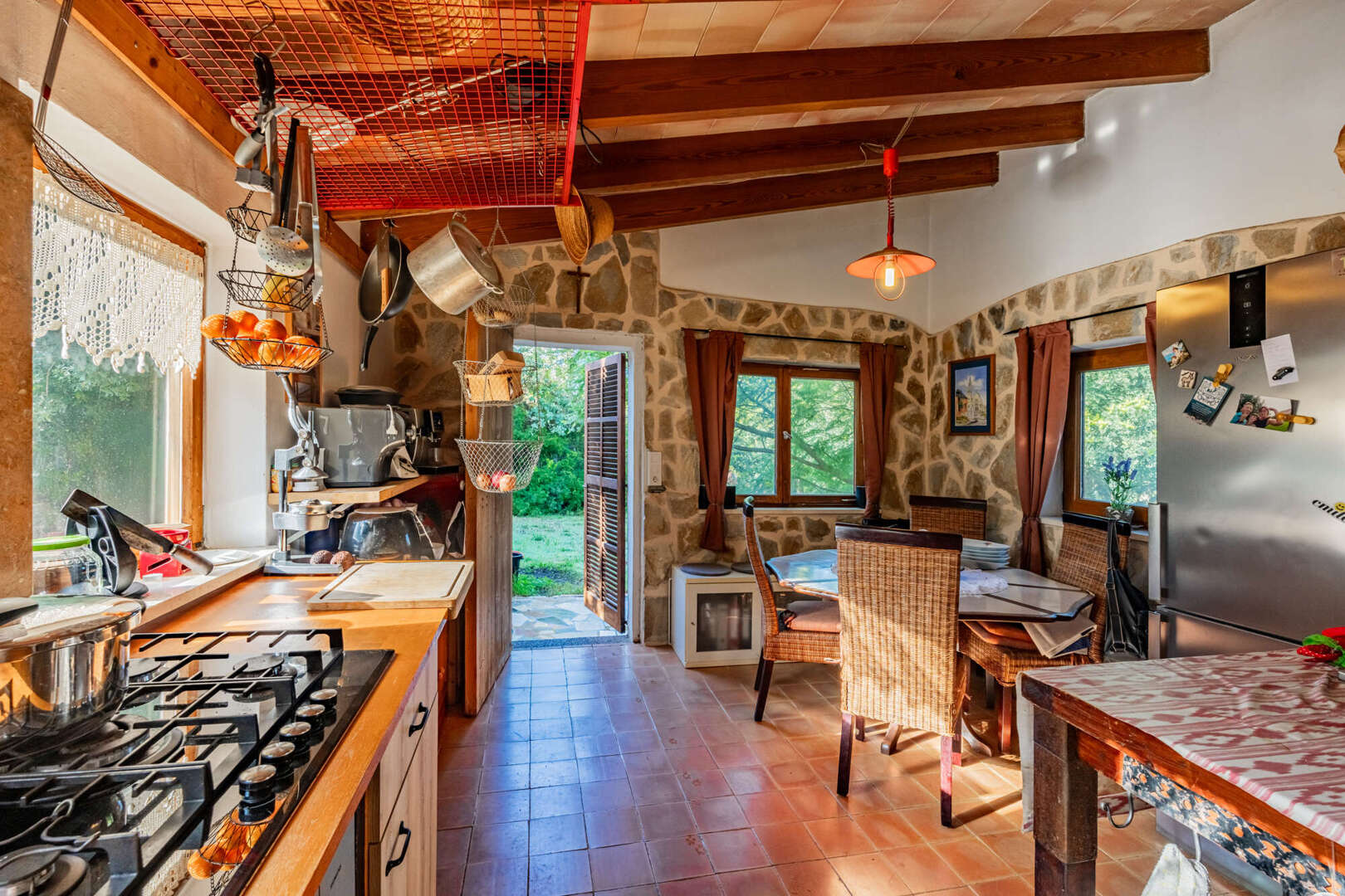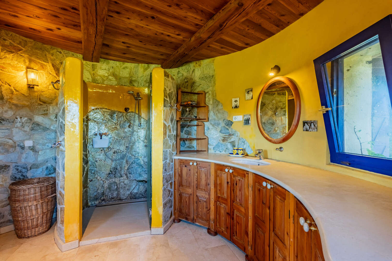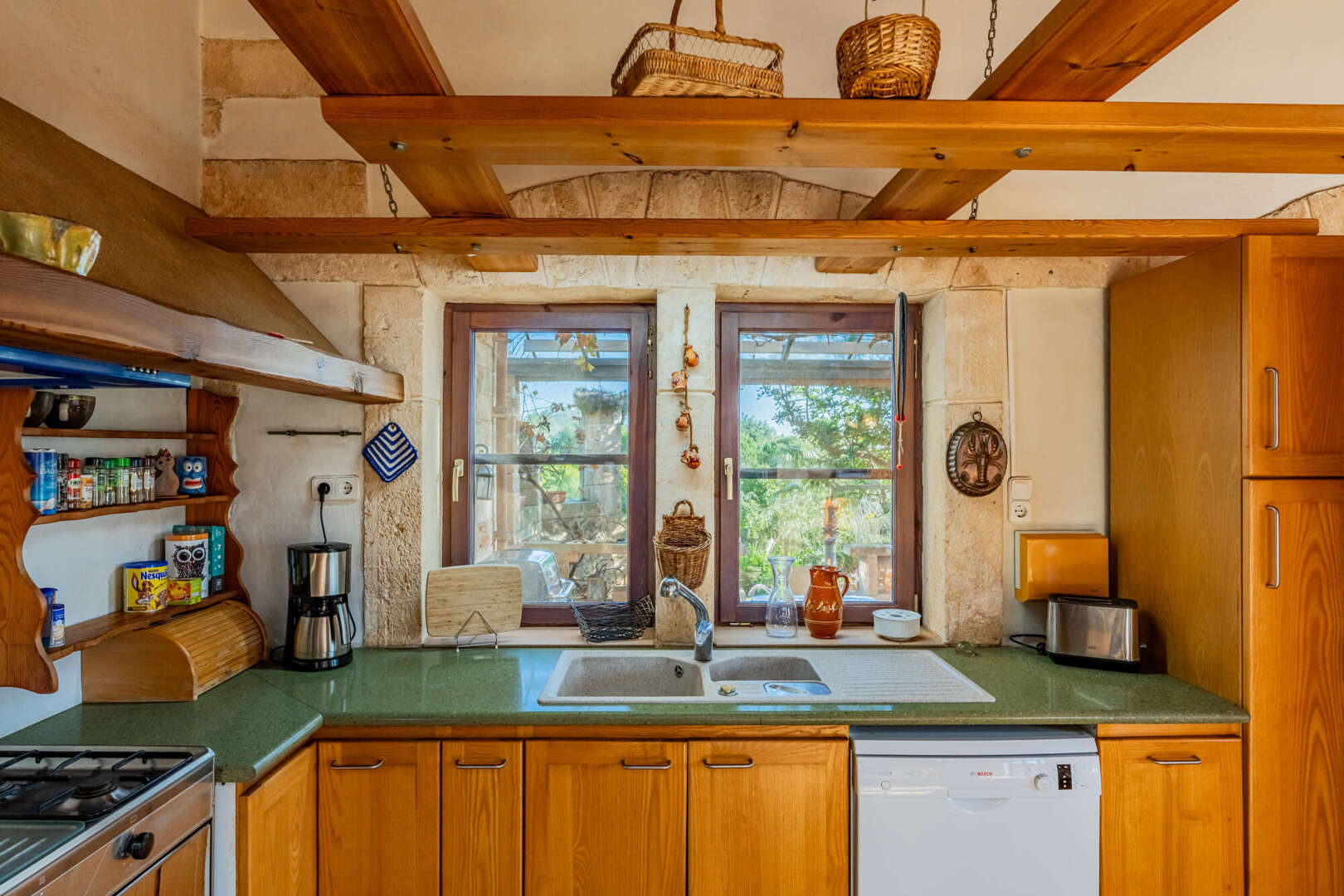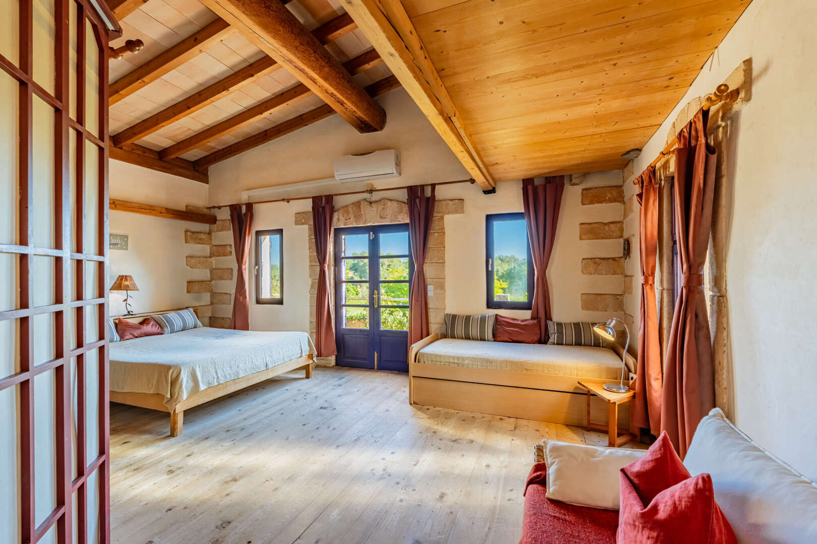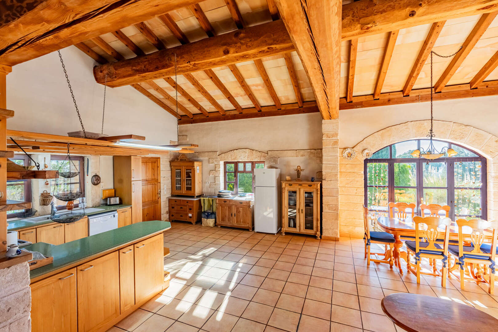 Inside, natural stone, solid wooden beams, high ceilings and large arched windows create a warm yet stately ambience. The open-plan living/dining area with wood-burning stove is harmoniously connected to the gallery via a wooden staircase. On the first floor is the spacious master bedroom with walk-in closet, en suite bathroom in the tower and access to the terrace. The second bedroom in the green tower offers a unique panoramic view through cleverly positioned windows.