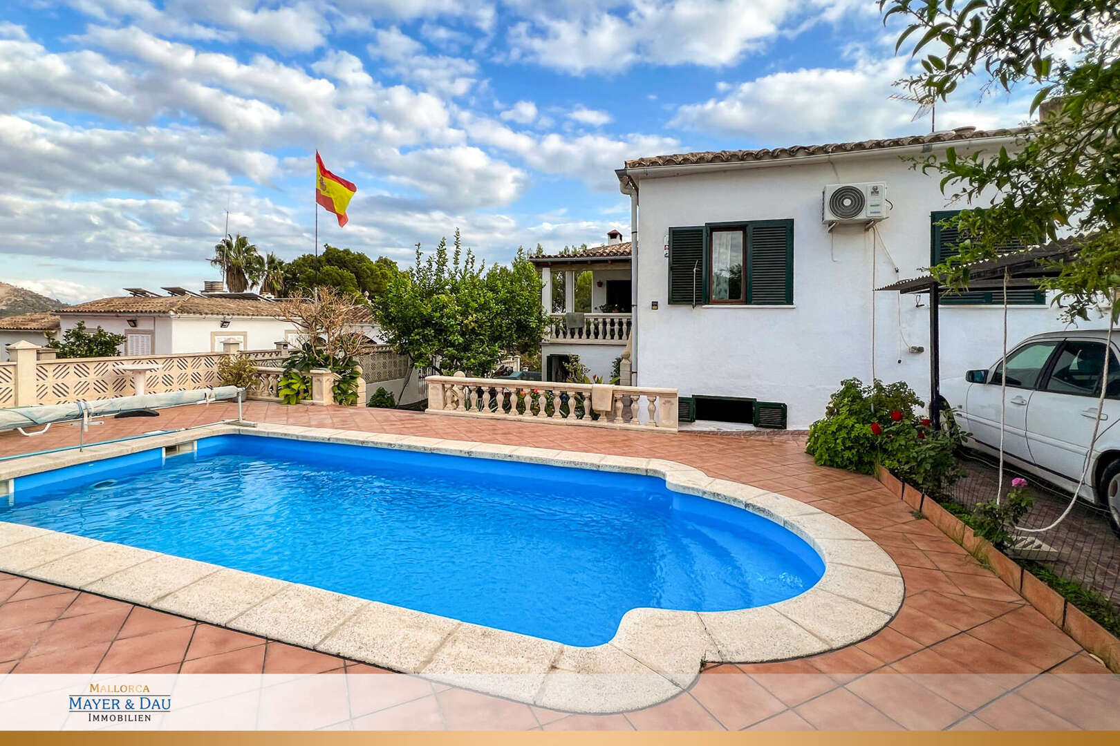 The outdoor area offers several north/west-facing terraces, a private pool and carport with additional parking spaces.