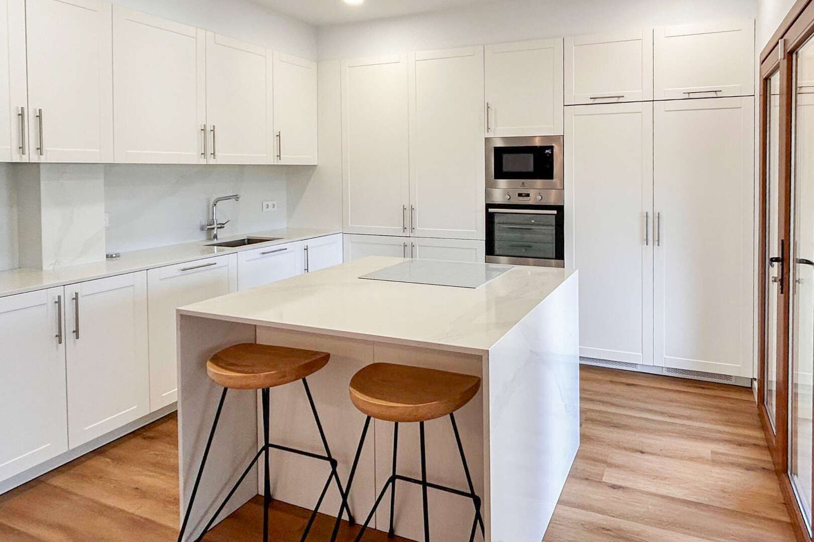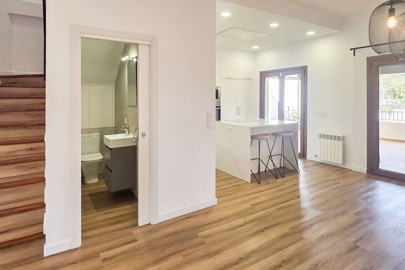 The spacious, open-plan living area forms the heart of the house. Floor-to-ceiling light surfaces create a bright, inviting atmosphere and elegantly combine living, dining and cooking. The modern open kitchen with cooking island is ideal for sociable evenings and sophisticated cooking. A guest WC on the first floor complements this level perfectly. The wood-burning stove, which gives the living room a warm, homely feel, makes for cozy hours.