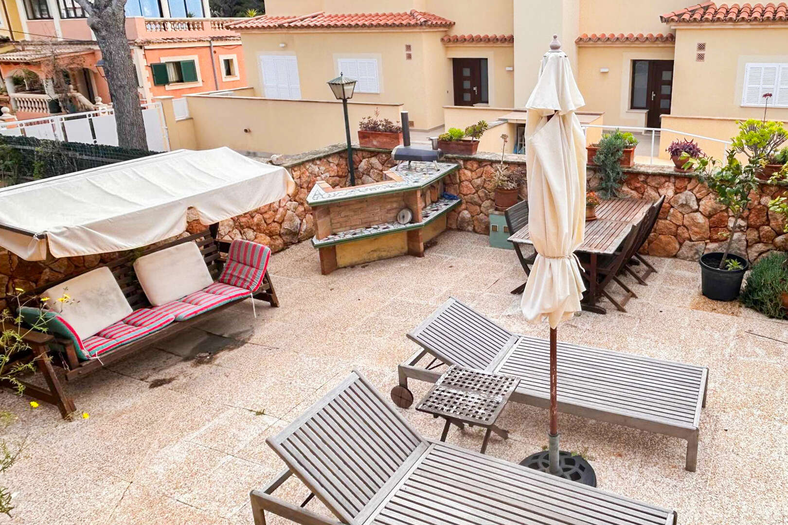 The low-maintenance plot has a large west-facing terrace overlooking the pool, perfect for relaxing hours outdoors.