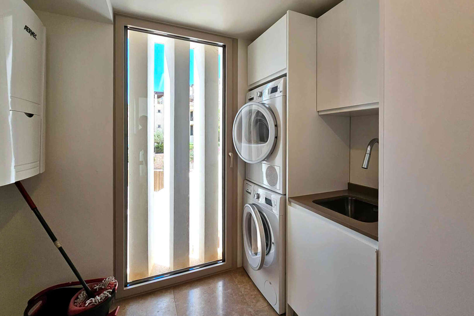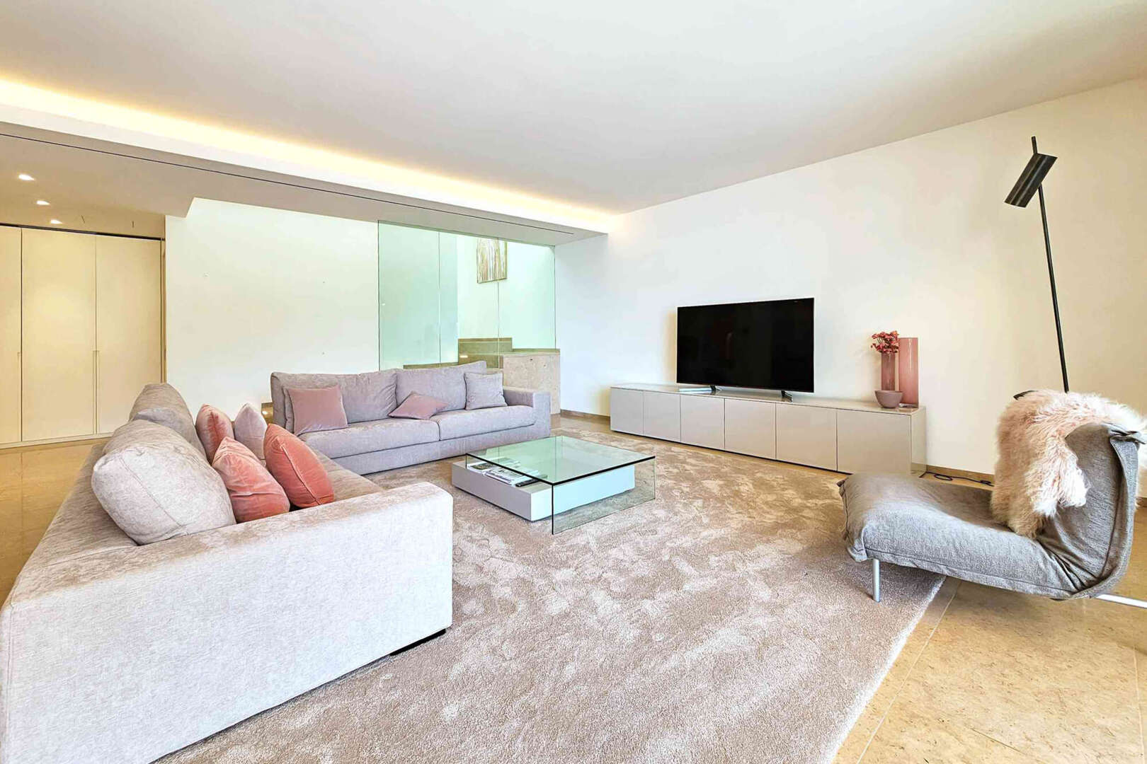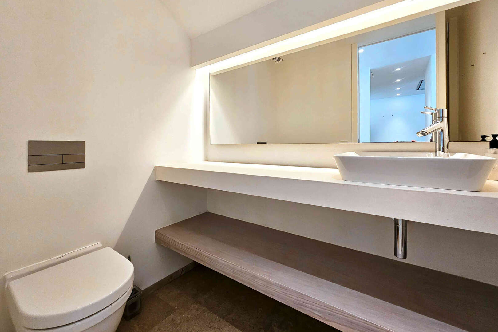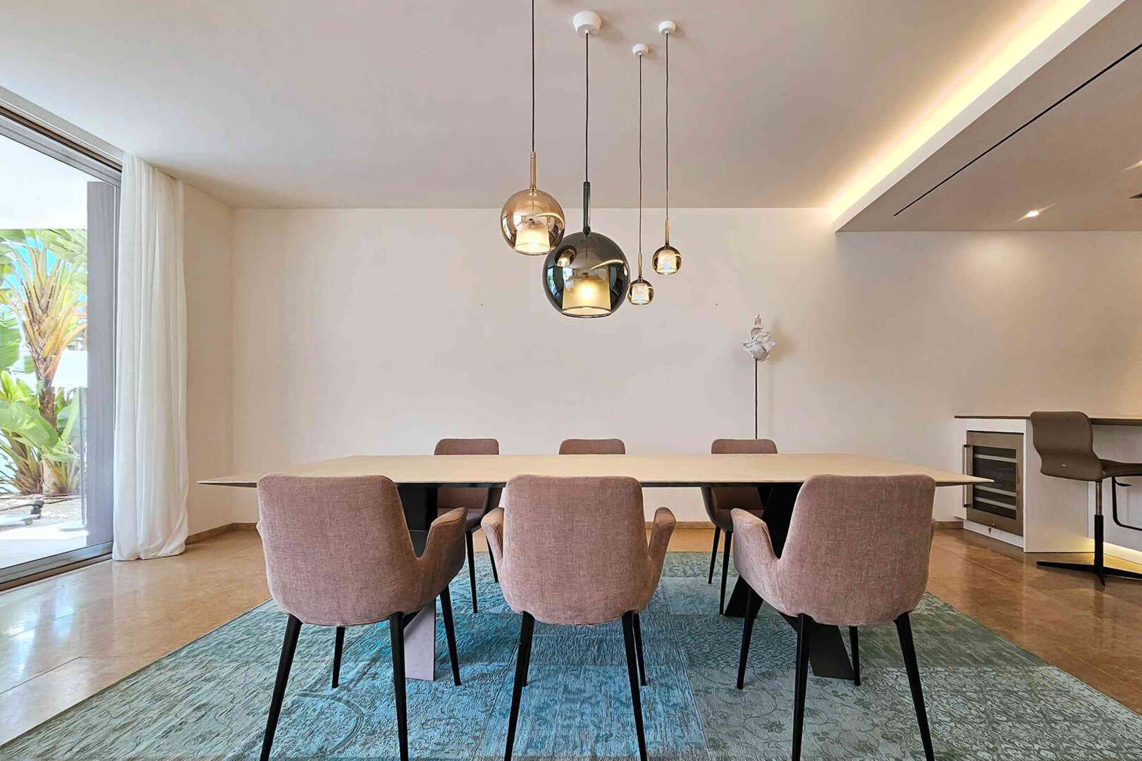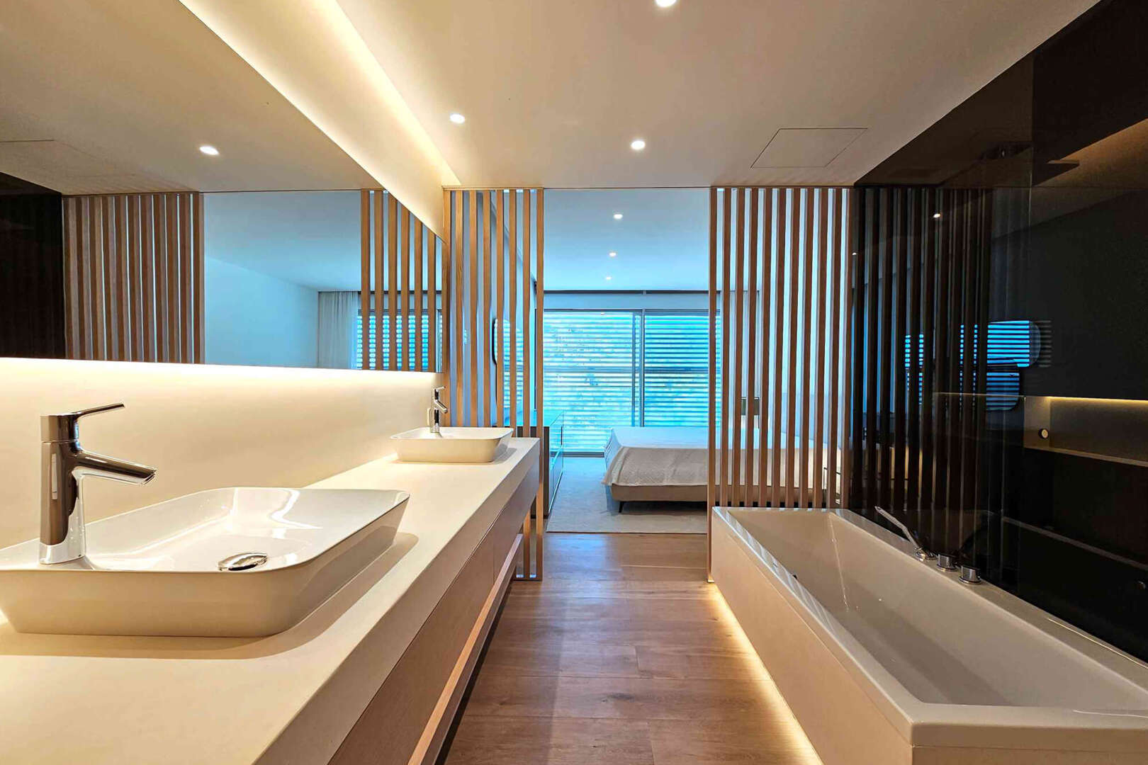 Im Erdgeschoss erwartet Sie ein weitläufiger Wohn- und Essbereich mit offener Luxusküche (Gaggenau-Geräte), Gäste-WC sowie ein charmant gestalteter Innenhof. Der direkte Zugang führt auf die große überdachte Terrasse (41 m²), den privaten Swimmingpool (20 m²) und eine weitere Loungezone mit rundum Meer- und Bergpanorama – Ihre ganz persönliche Ruheoase.