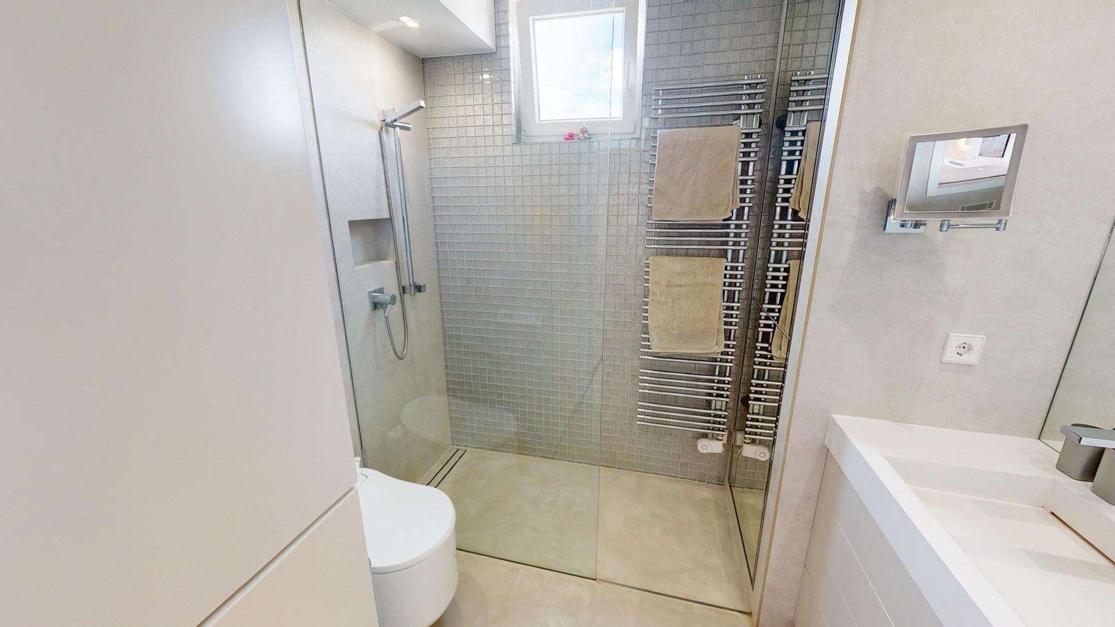The light-flooded apartment was completely renovated in 2019 and furnished with high-quality materials. The terrace was integrated into the living area. It impresses with a breathtaking sea view and a wide panoramic view.