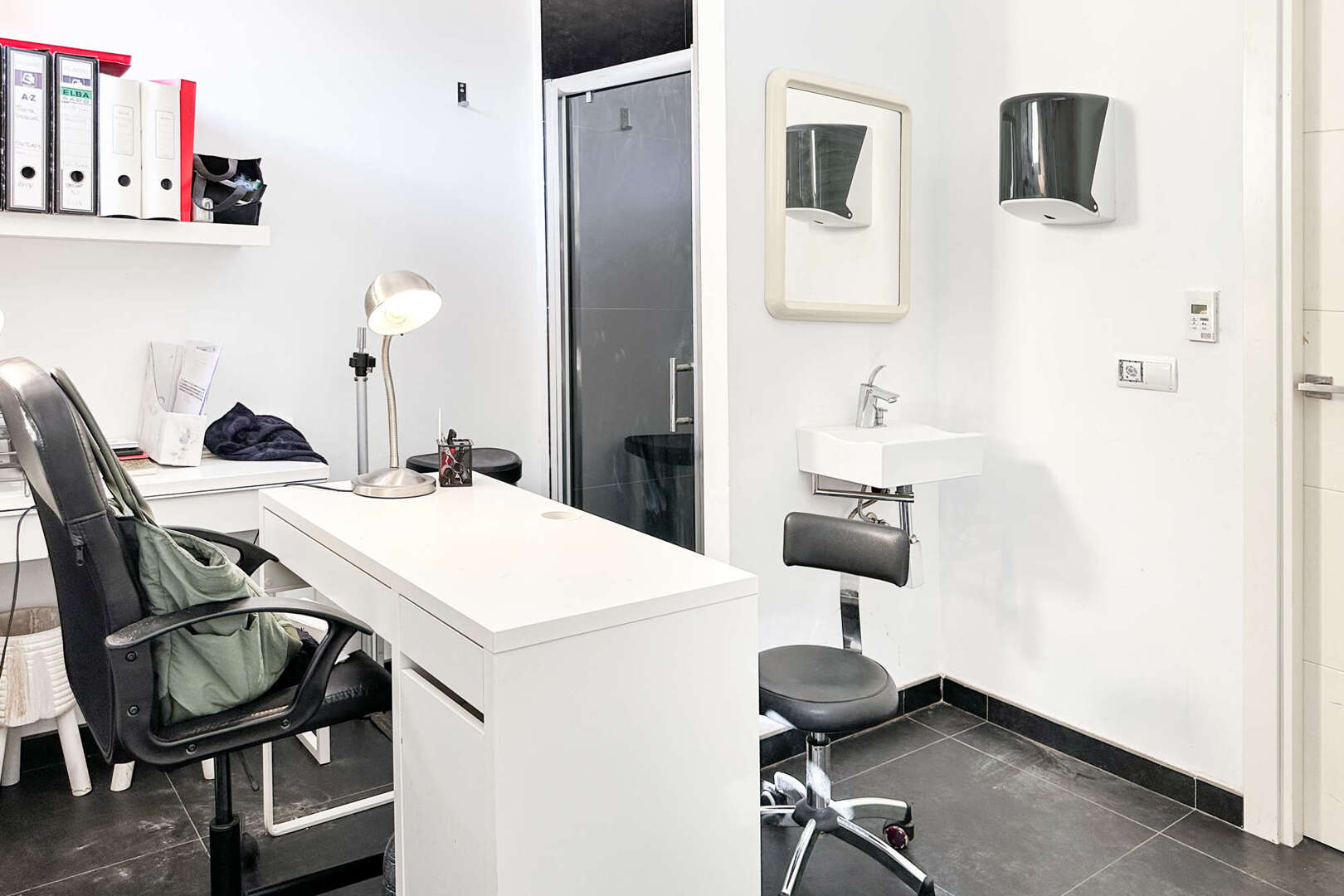 Destaca especialmente la luminosa cabina de belleza, que ofrece opciones de servicios ampliados, como cuidado de la piel, maquillaje o tratamientos de belleza similares. Esto permite abarcar una gama más amplia de servicios y dirigirse a un grupo de clientes más numeroso. Una sala utilizada actualmente como oficina ofrece más opciones gracias a la ducha instalada.
