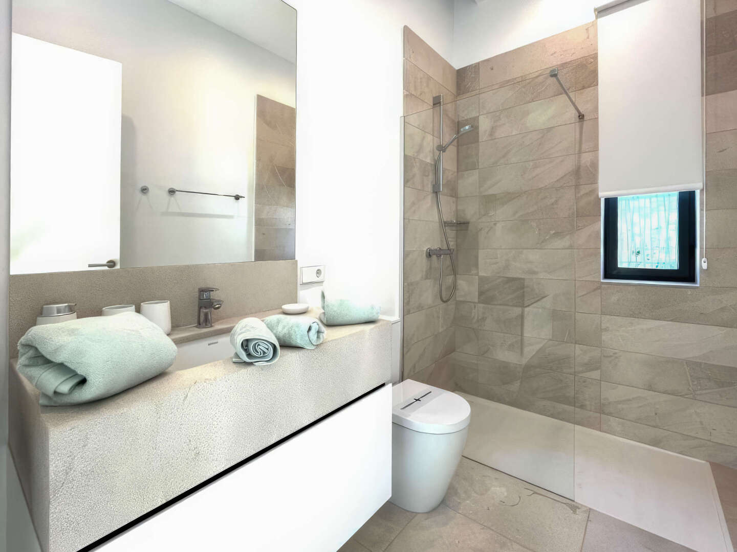 Los dos cuartos de baño de la casa están elegantemente diseñados y equipados con modernos accesorios y mobiliario de alta calidad. Aquí podrá relajarse en un ambiente lujoso y dejar atrás el estrés de la vida cotidiana. Además, la piscina comunitaria del complejo ofrece otra oportunidad para refrescarse.