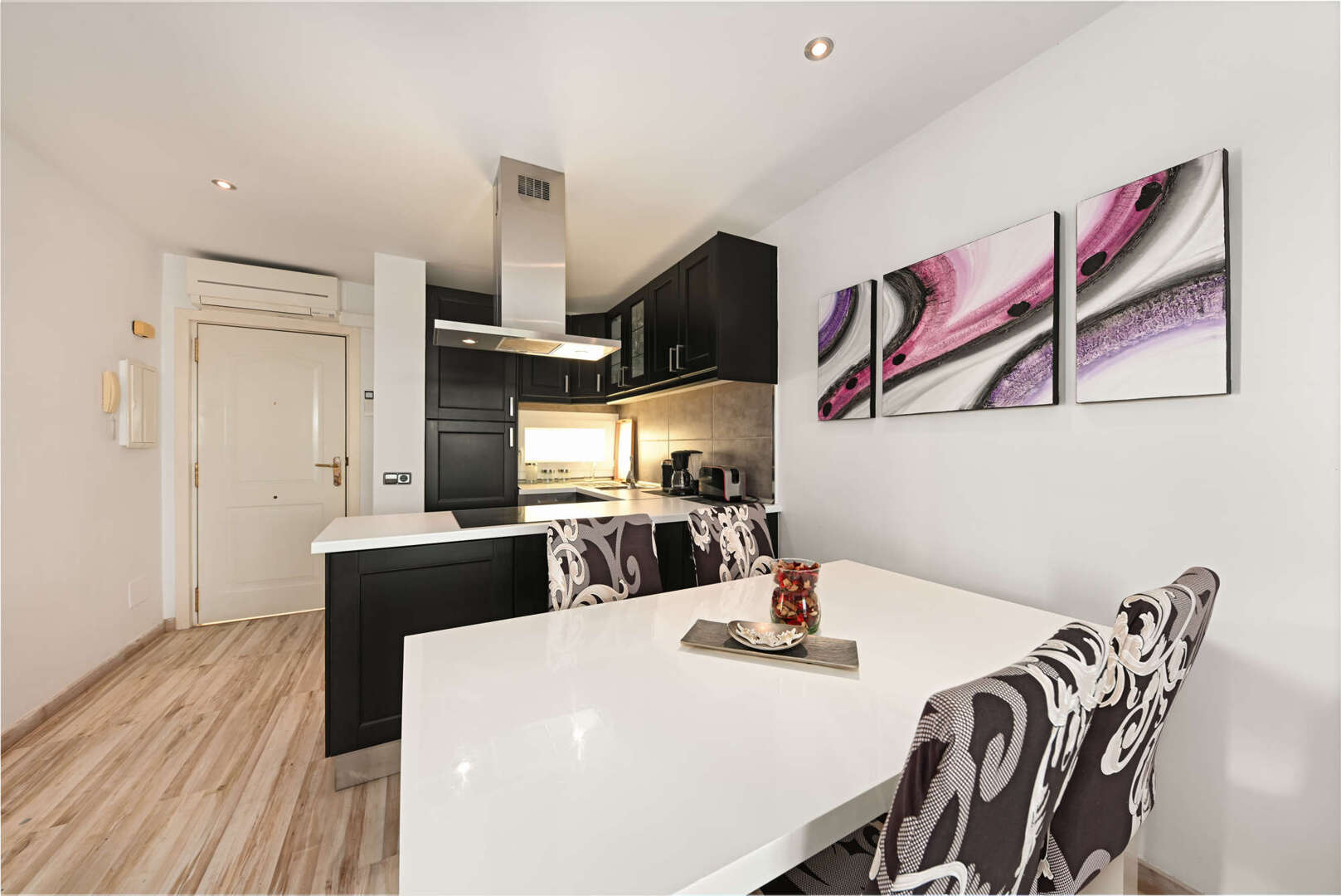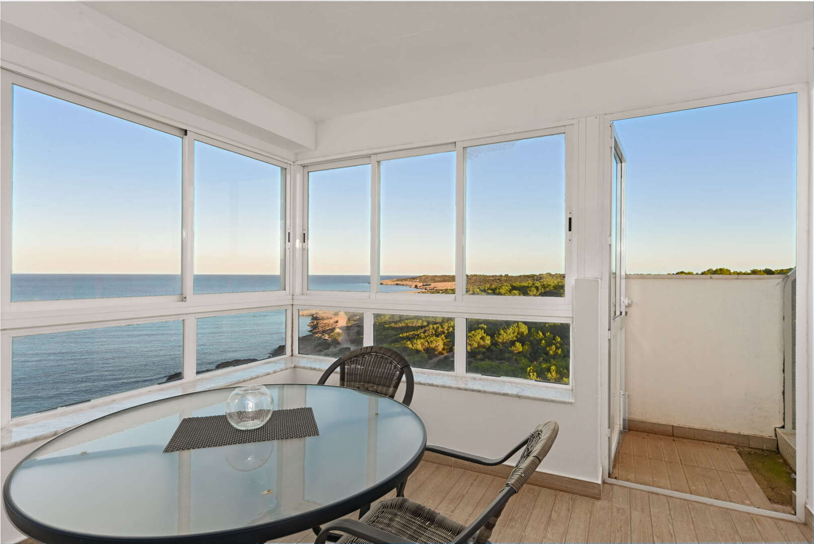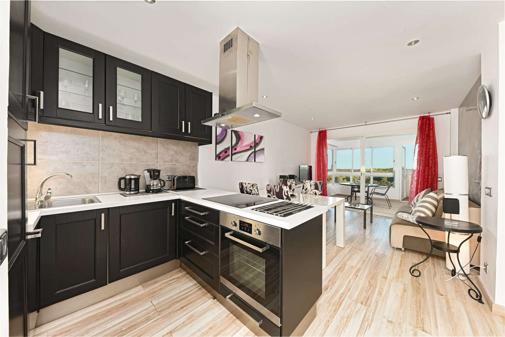 El piso cuenta con un acogedor salón que fluye a la perfección hacia la cocina, convirtiéndolo en un espacio ideal para invitados. La moderna cocina está equipada con electrodomésticos y armarios de alta calidad. Desde el salón se accede a una terraza cubierta, a modo de jardín de invierno, con maravillosas vistas al mar y a la naturaleza.