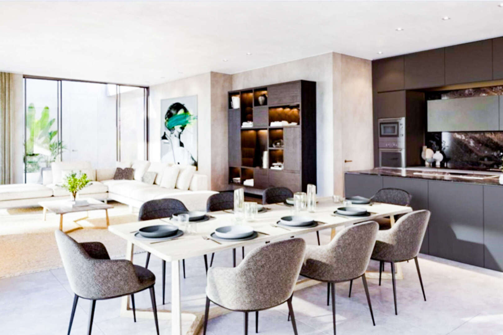 Das Erdgeschoss beeindruckt mit einer offenen, modernen Küche und einem großzügigen Wohn-Essbereich, der nahtlos in die große Terrasse mit Infinity-Pool übergeht. Ein weiteres Schlafzimmer mit Bad en suite und ein Gäste-WC runden diese Ebene ab.