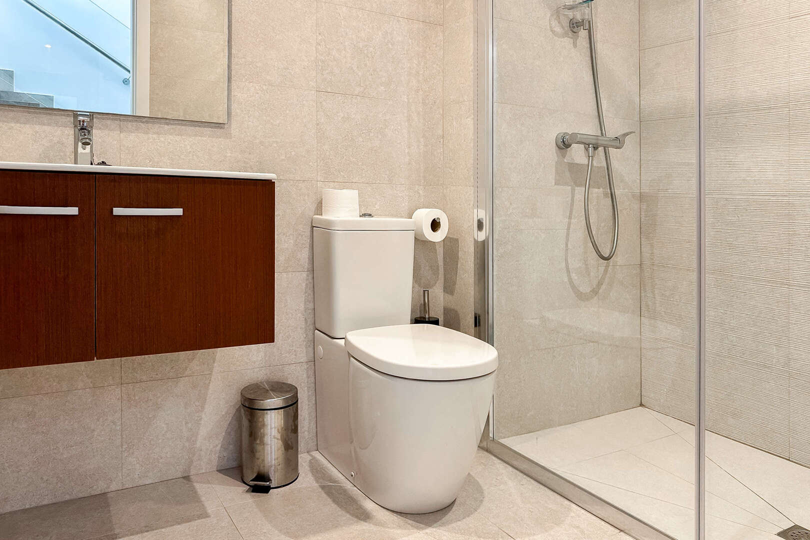 Al entrar en la casa, hay un dormitorio con dos camas individuales y un amplio armario empotrado directamente a la derecha. Más adelante en el pasillo se encuentra el primer cuarto de baño, más pequeño, con una moderna ducha a ras de suelo. Al lado está el cuarto de baño más grande, también equipado con ducha. Al final del pasillo está el segundo dormitorio, con dos camas individuales y un sofá. Desde aquí se accede a la terraza privada con acceso a la piscina y al pequeño jardín, ideal para pasar horas de relax al aire libre.