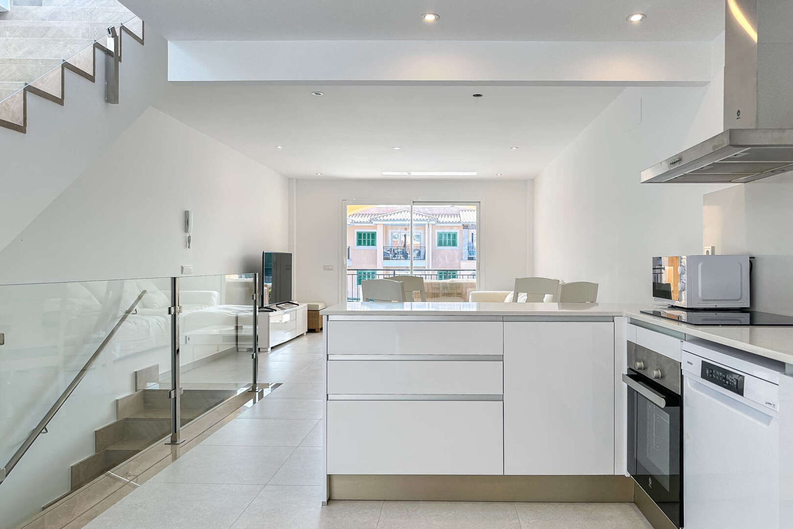 Una característica especial de la casa es la barandilla de cristal de alta calidad a lo largo de la escalera, que crea un ambiente moderno y elegante. Una escalera conduce a la impresionante azotea con techo hidráulico. Desde aquí se puede disfrutar de una impresionante vista de la bahía de buceo y el mar - el lugar perfecto para experimentar el ambiente mediterráneo.