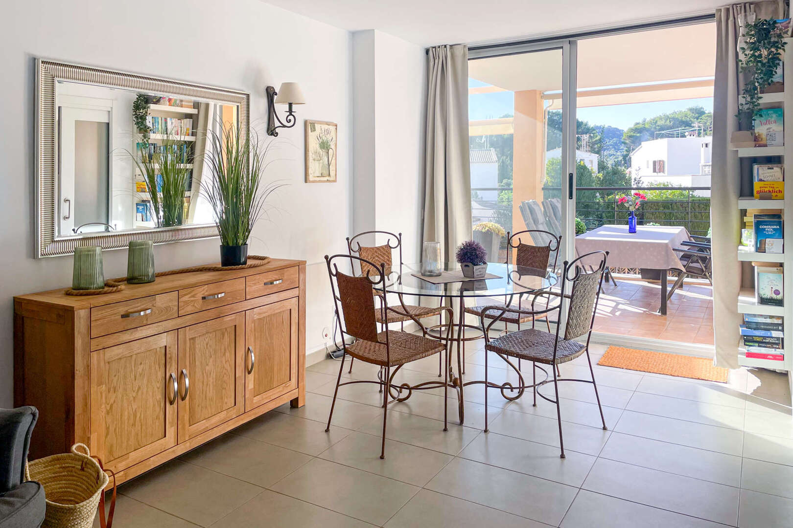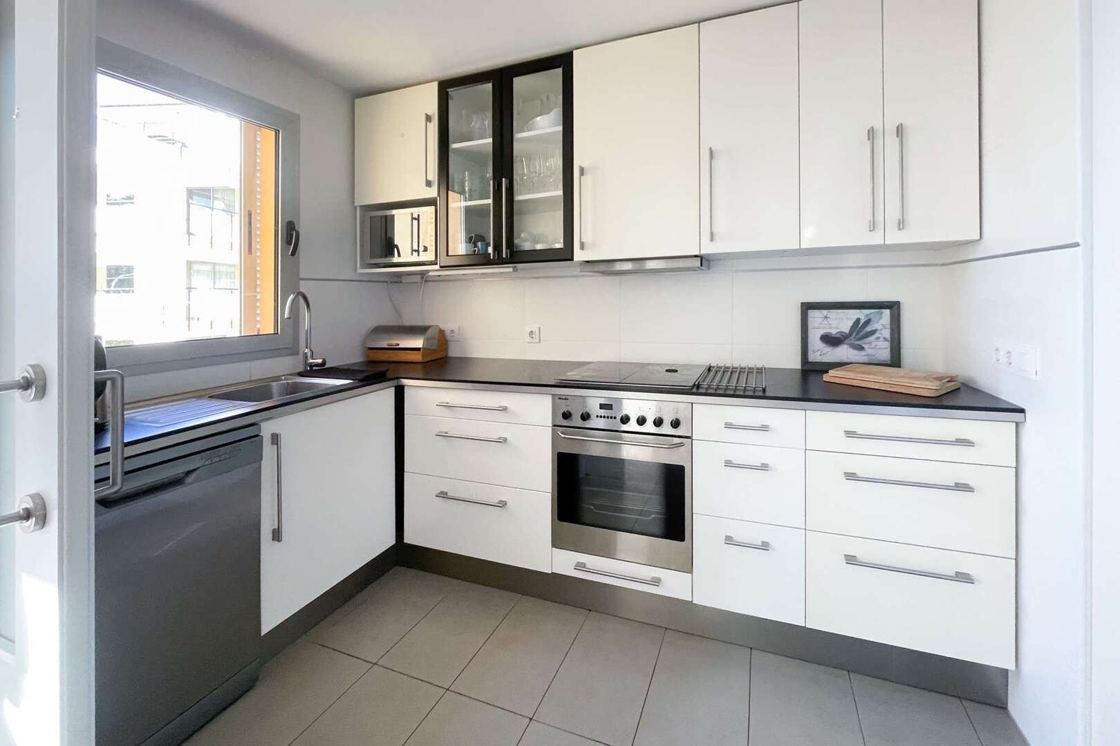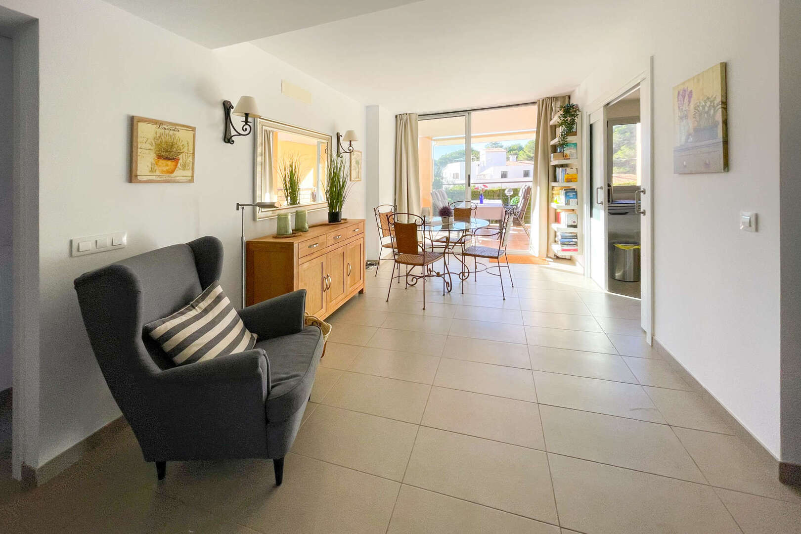 La cocina contigua, totalmente equipada, ofrece una hermosa vista de la piscina comunitaria gracias a una ventana. Desde el salón se accede a la amplia terraza, ideal para pasar veladas acogedoras o relajarse con un libro y una taza de té.