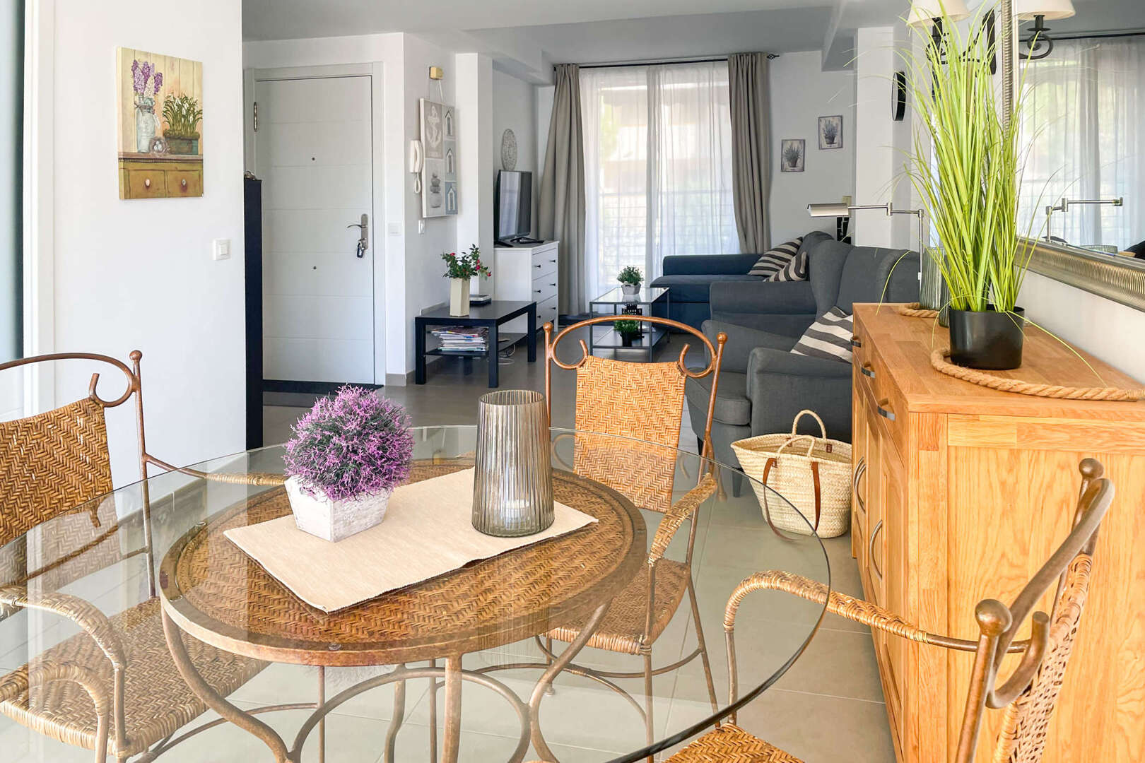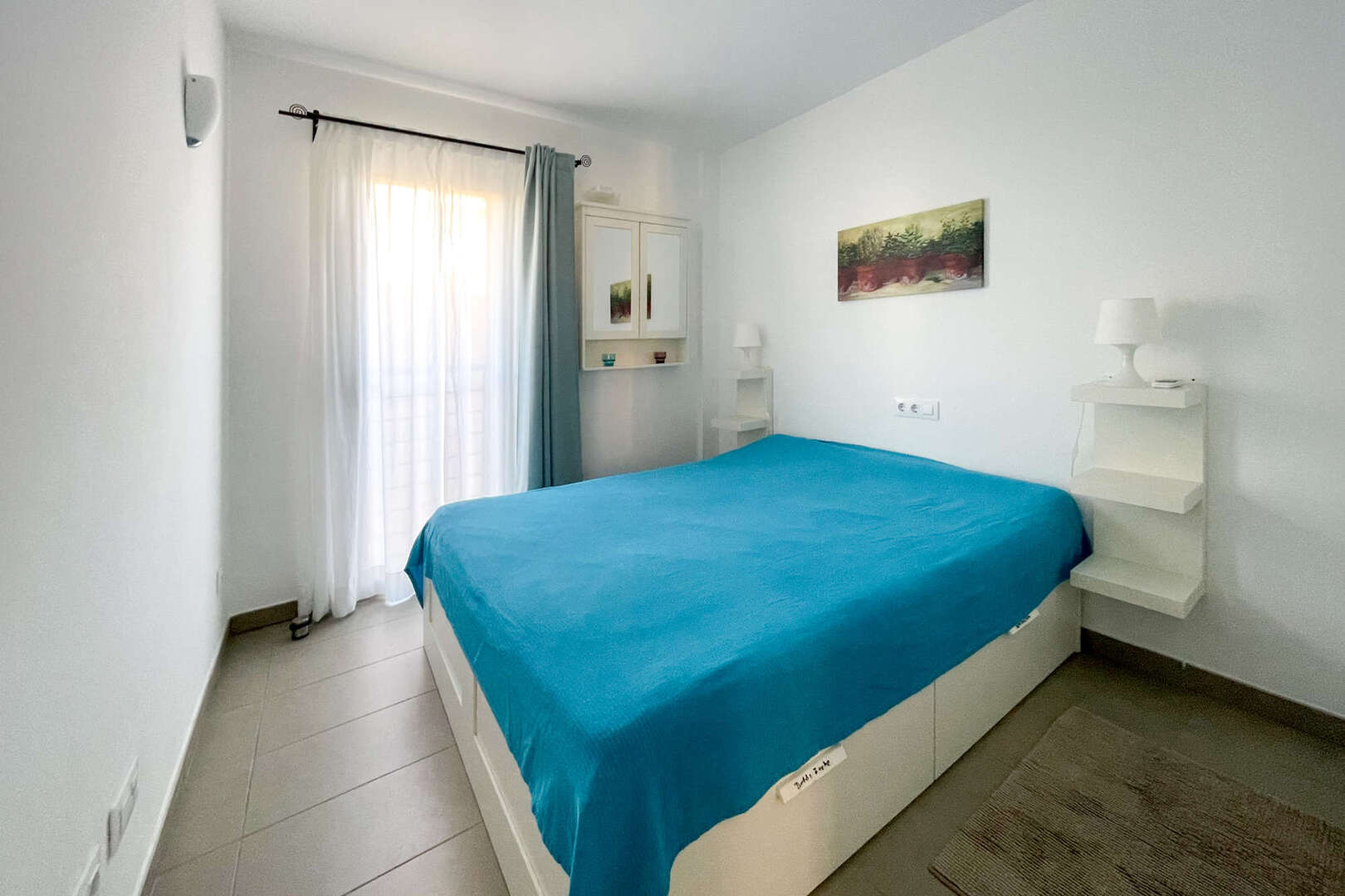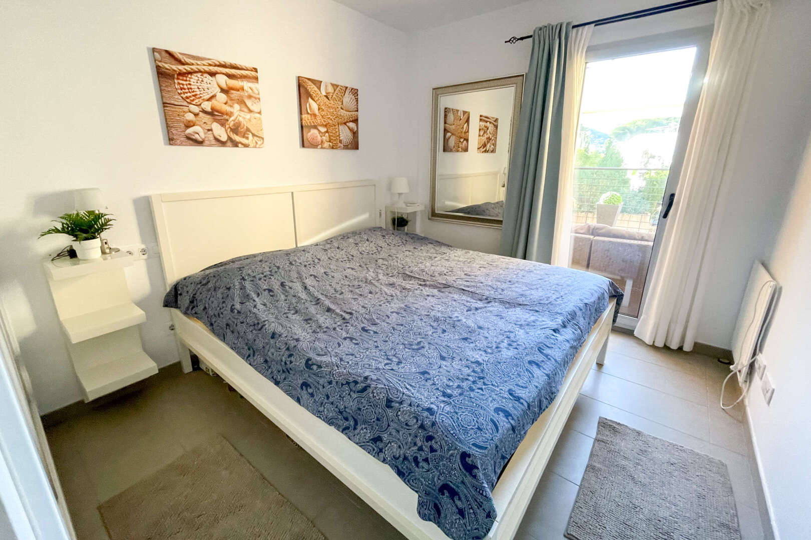 Desde el salón se accede a los dos dormitorios, que cuentan con mucha luz natural y amplio espacio de almacenamiento. Entre los dormitorios se encuentra el espacioso cuarto de baño principal con bañera, ideal para momentos de relax.