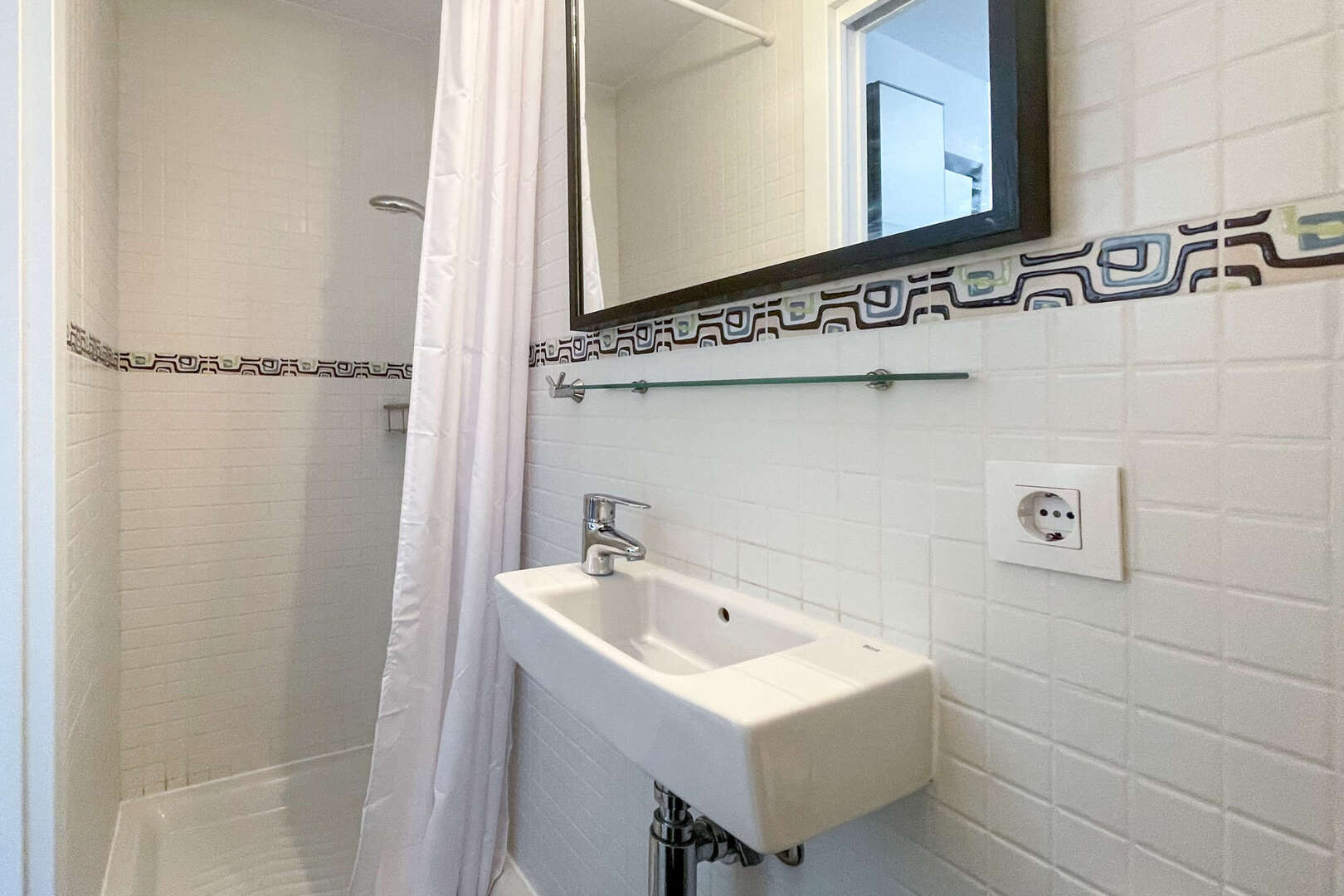 A la derecha de la entrada se encuentra el pequeño y funcional cuarto de baño de invitados con una moderna ducha, ideal para las visitas o como cuarto de baño adicional para la familia.