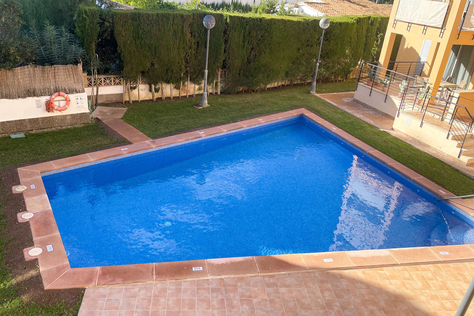 El piso cuenta con una piscina comunitaria rodeada de un cuidado jardín. Una plaza de aparcamiento subterráneo proporciona comodidad adicional.