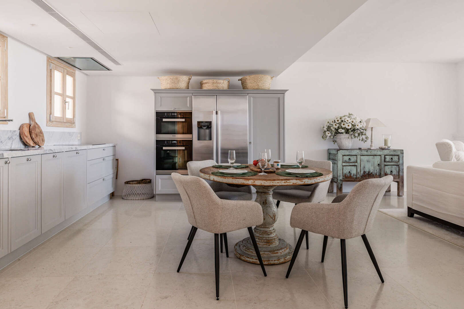 El acceso al precioso piso dúplex se realiza a través de unos pocos escalones y conduce a la planta inferior con una moderna cocina abierta y un luminoso salón-comedor que da directamente a una terraza cubierta. Dos amplios dormitorios dobles, un trastero y dos cuartos de baño (uno en suite) también se encuentran en este nivel.