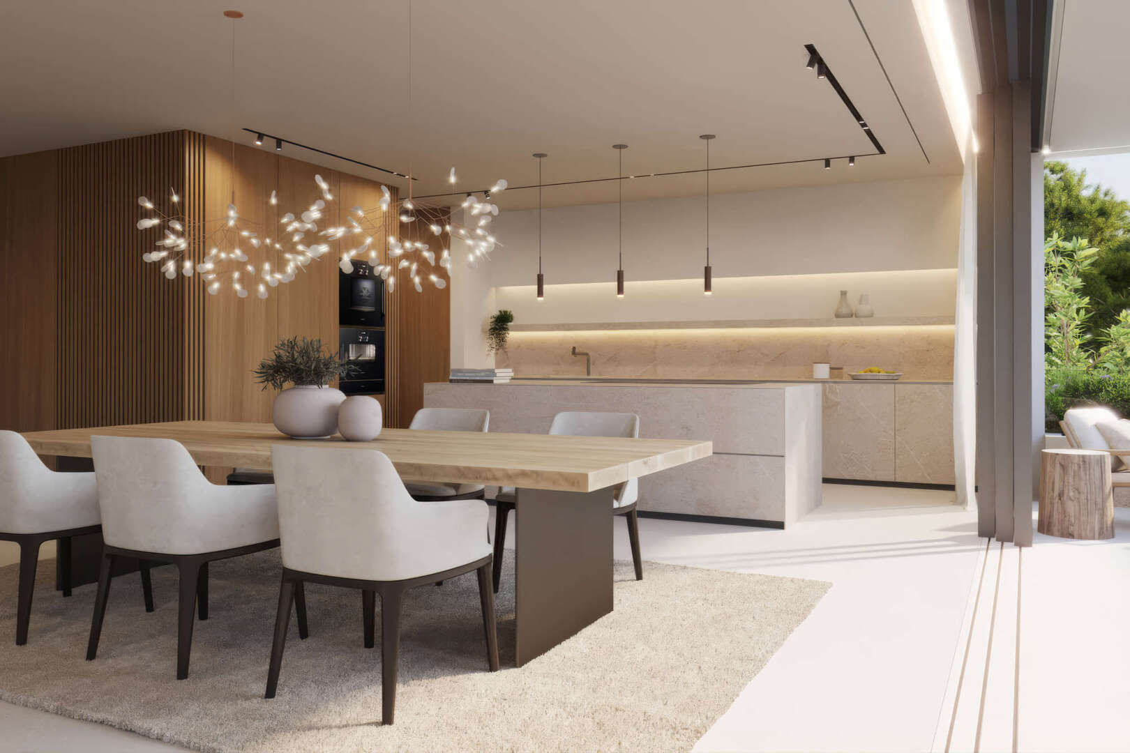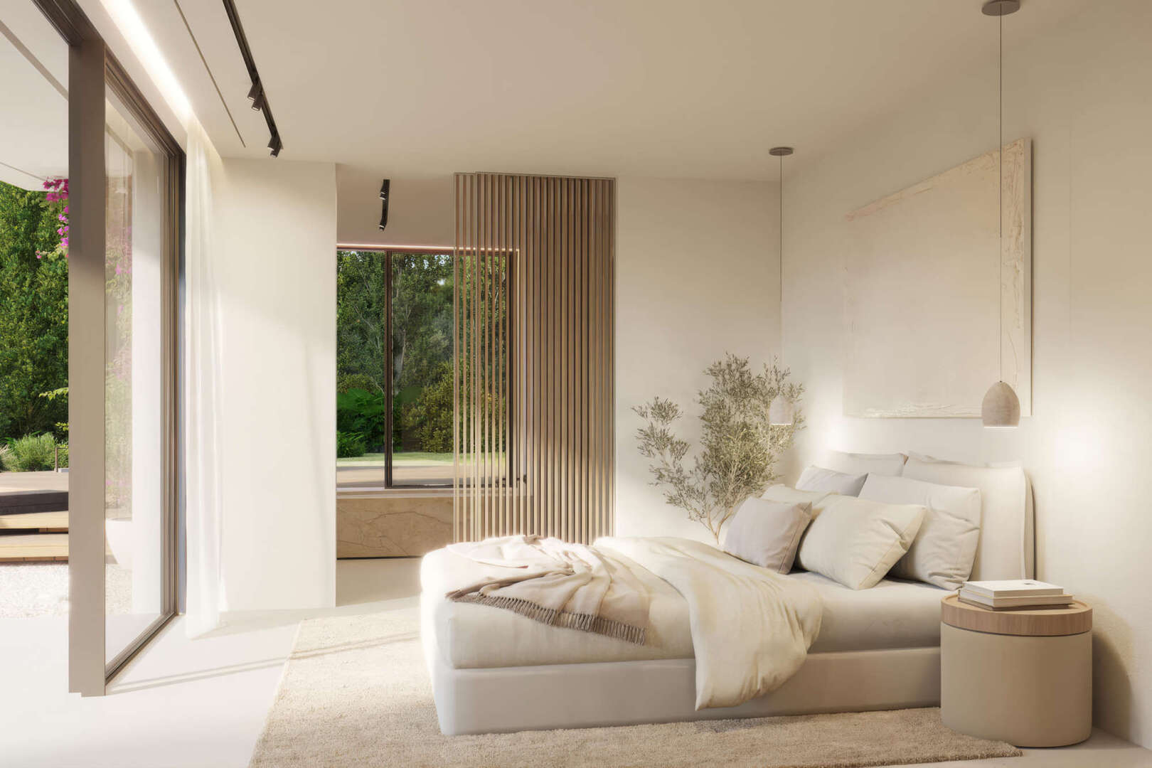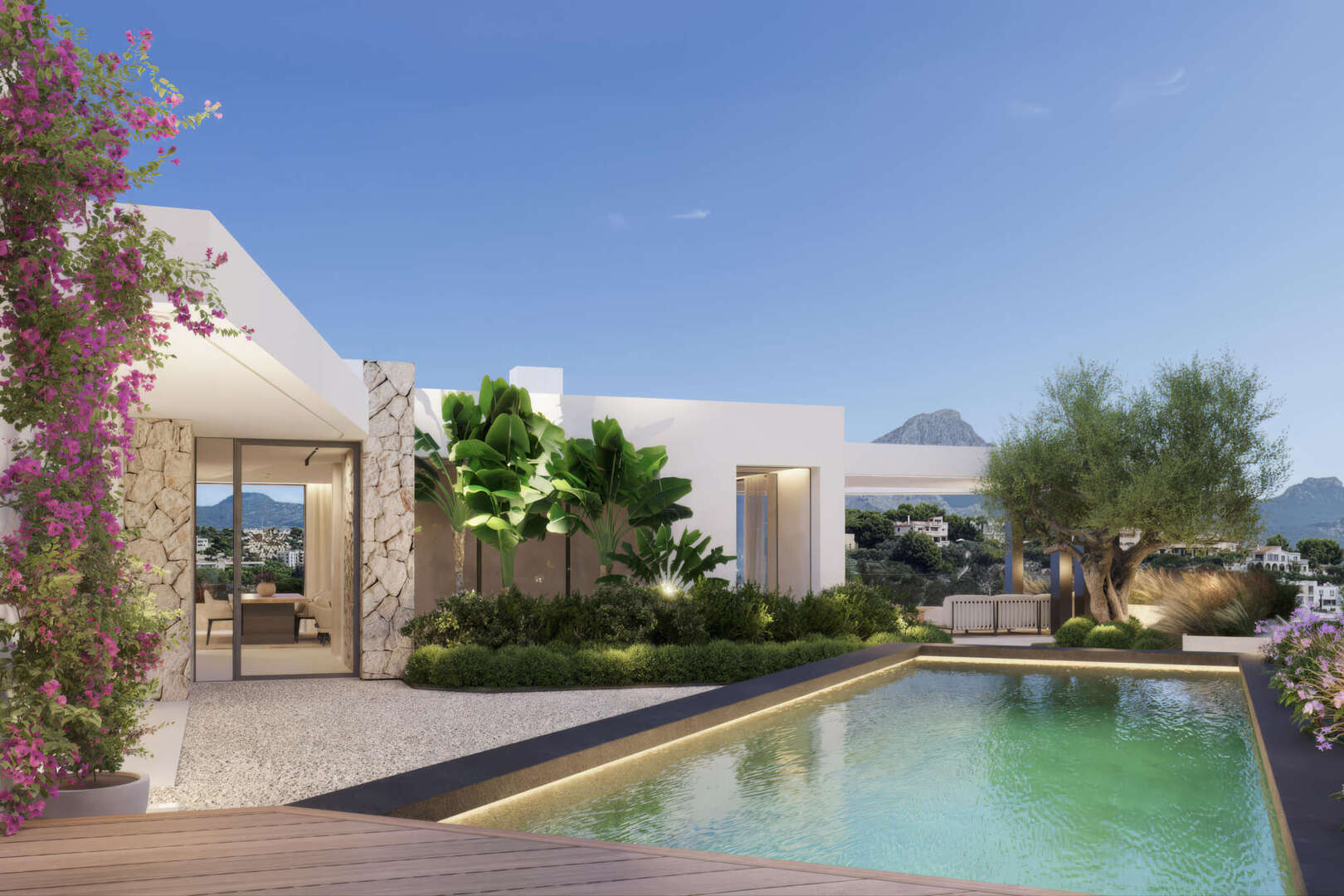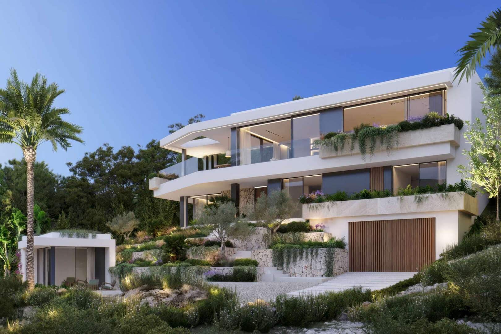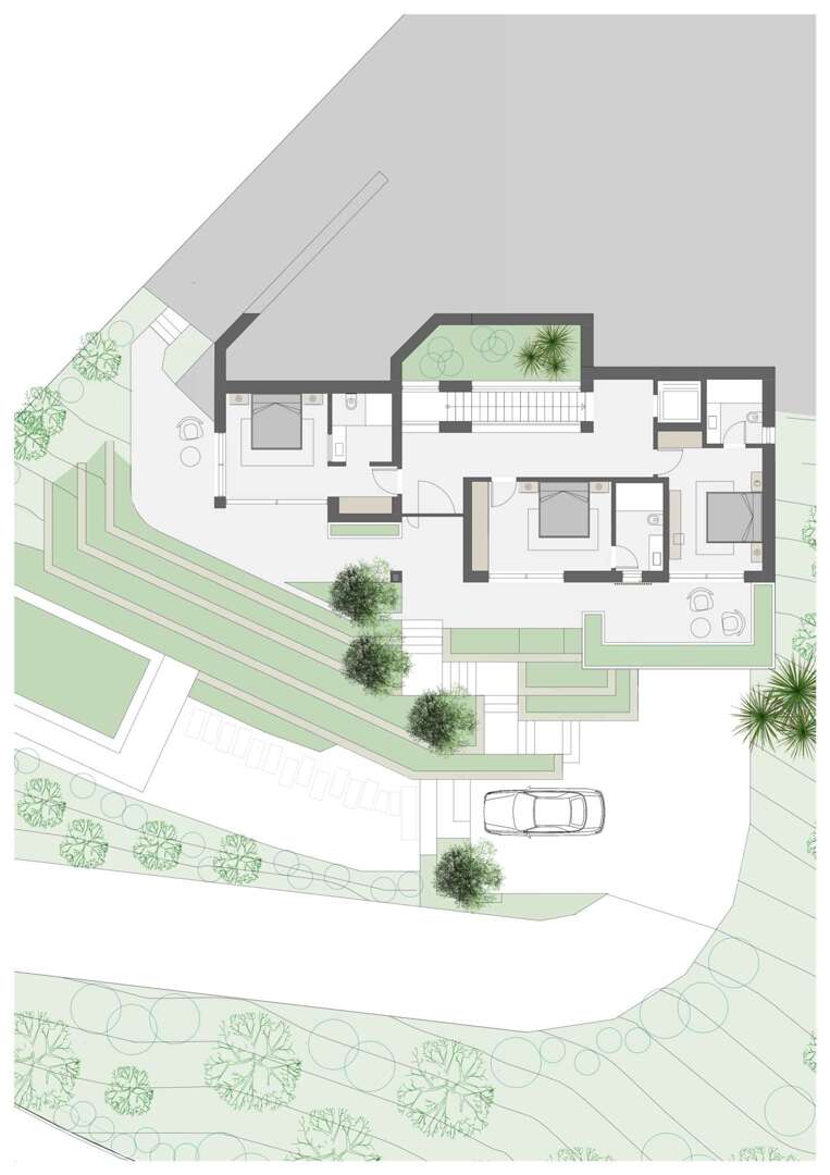 La villa cuenta con amplias zonas de estar caracterizadas por líneas limpias y un concepto de habitación bien pensado. En la planta superior le espera un luminoso salón-comedor con una moderna cocina americana equipada. Los cuatro dormitorios, cada uno con su propio cuarto de baño, ofrecen el máximo confort y privacidad.