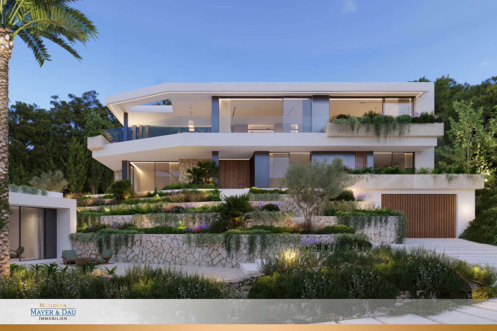 La villa cuenta con amplias zonas de estar caracterizadas por líneas limpias y un concepto de habitación bien pensado. En la planta superior le espera un luminoso salón-comedor con una moderna cocina americana equipada. Los cuatro dormitorios, cada uno con su propio cuarto de baño, ofrecen el máximo confort y privacidad.