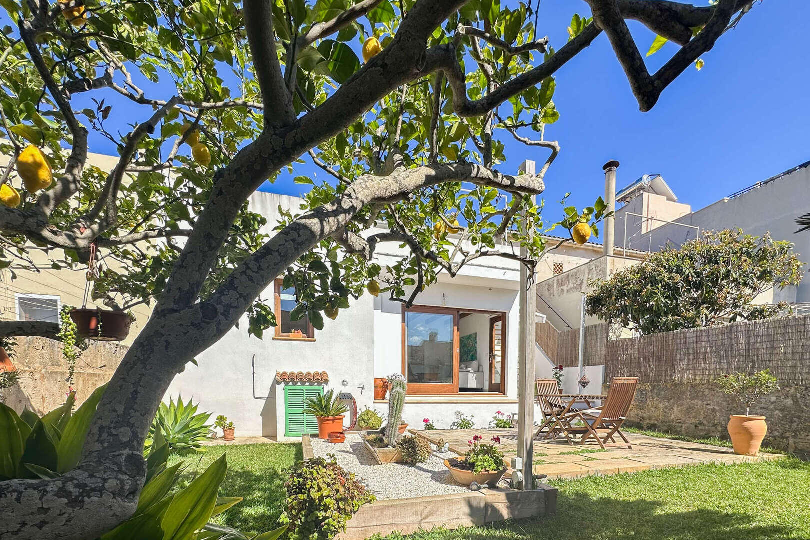 El cuidado jardín invita a relajarse, con zonas de sol y sombra, plantas mediterráneas y mucha privacidad. Lo más destacado es la posibilidad de construir una piscina, que refresca en los días cálidos y complementa a la perfección la vida al aire libre.