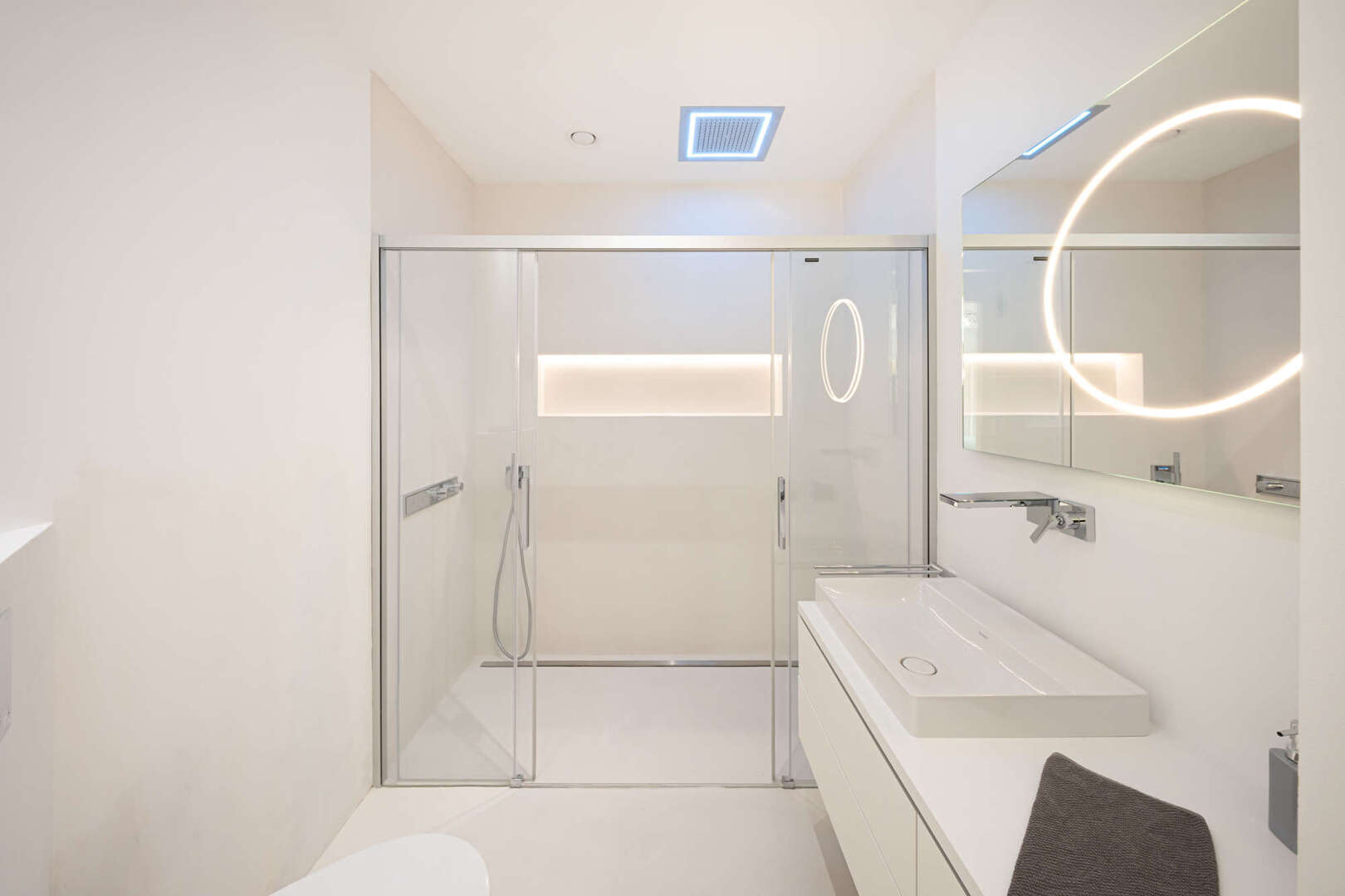En la planta baja hay tres dormitorios, cada uno con su propio cuarto de baño. Dos dormitorios principales disponen además de vestidor, bañera y ducha. Aquí también hay acceso directo a la terraza desde todas las habitaciones.