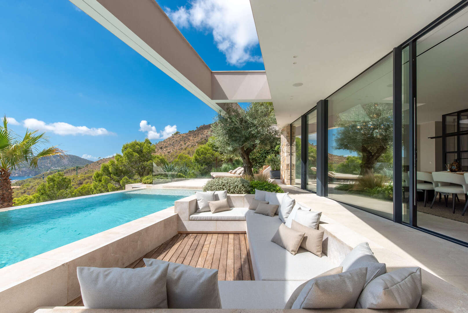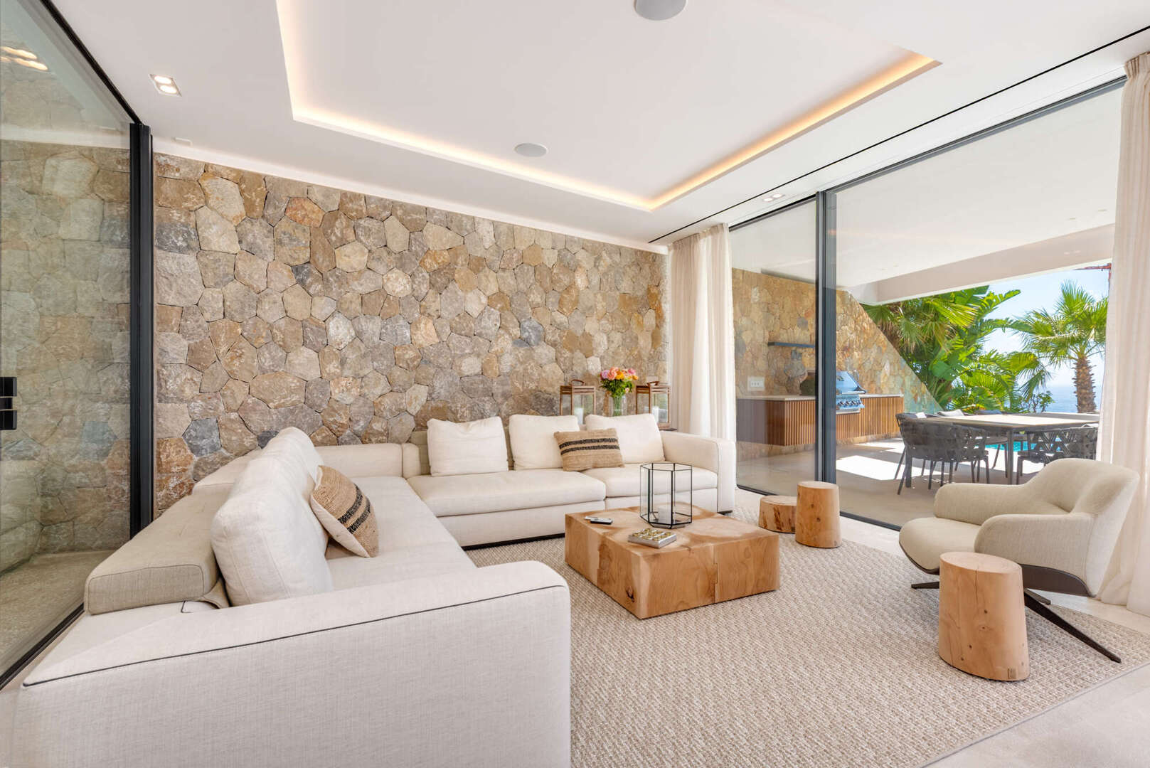 La zona exterior invita a relajarse durante todo el año con piscina, cocina de verano, salón, hoguera y ducha exterior: su oasis privado en Mallorca.
