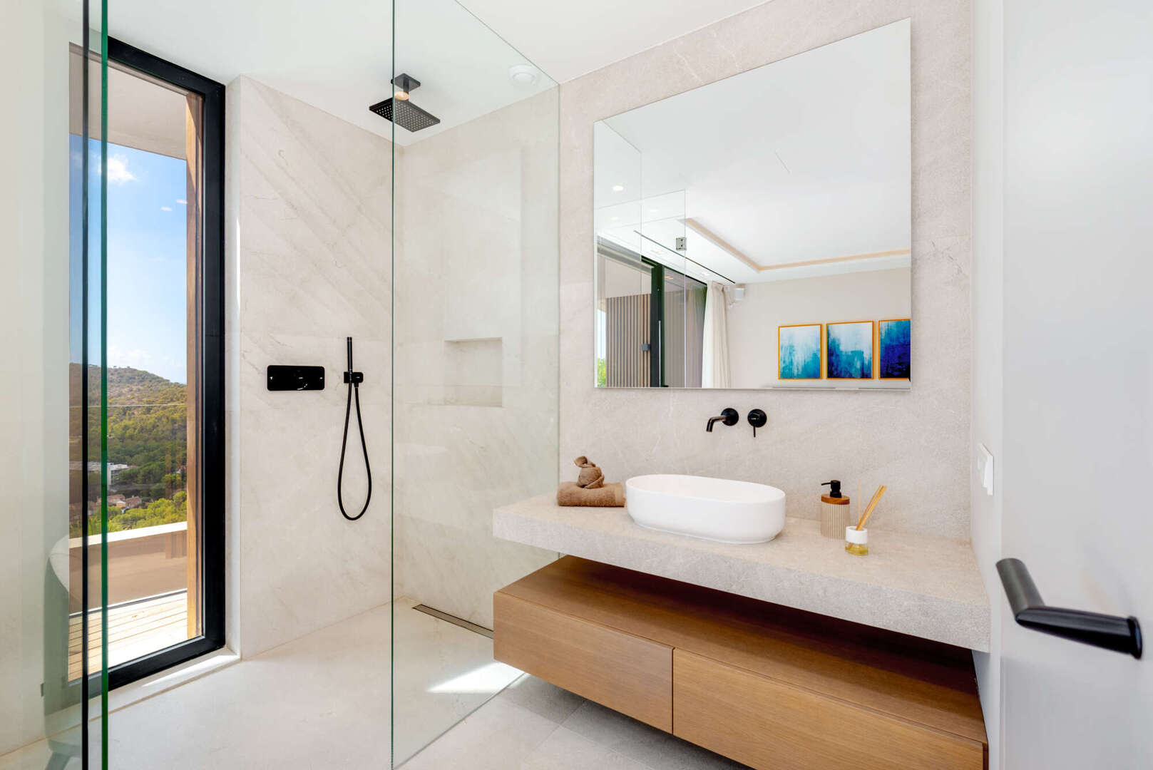 La planta superior le da la bienvenida con una amplia zona de entrada y tres elegantes dormitorios, todos con baño en suite y acceso directo a la amplia terraza con vistas al mar.
