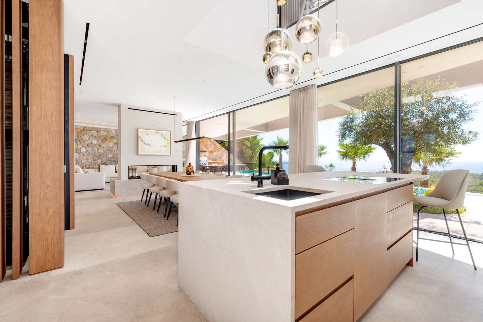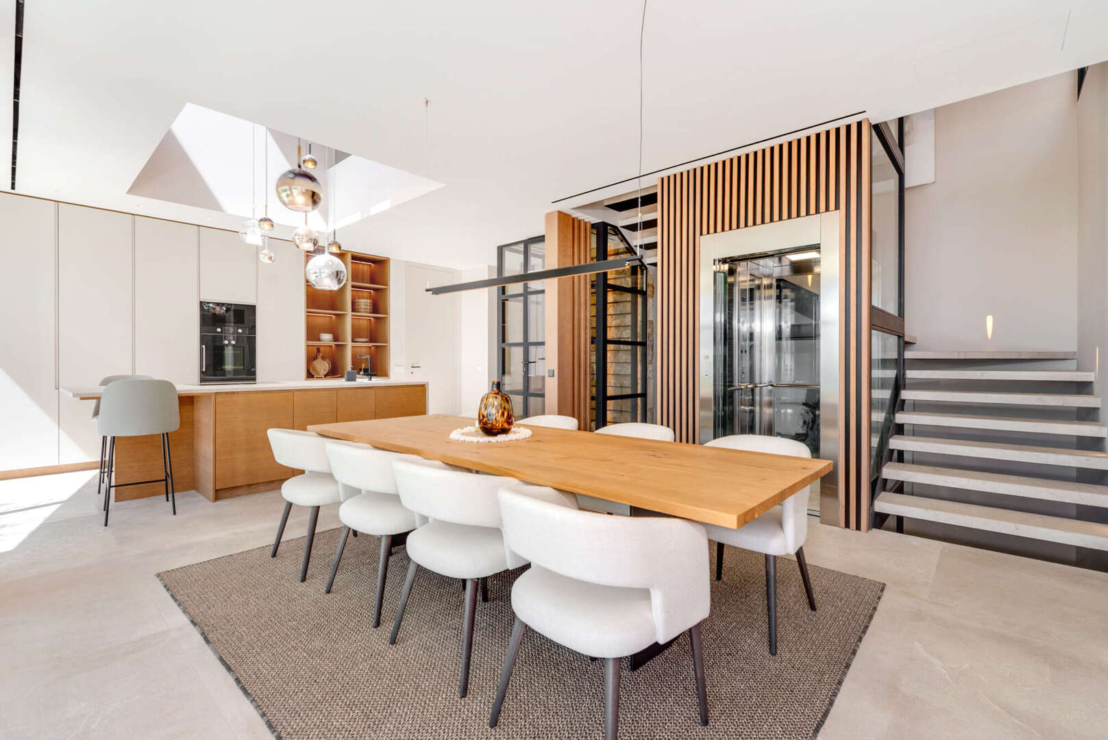 En la planta baja, disfrutará de un salón-comedor de planta abierta con chimenea de gas, una cocina de diseño con electrodomésticos Bora y Gaggenau, una elegante bodega, un aseo de invitados y un lavadero. También en este nivel: otro dormitorio con baño en suite y un impresionante patio interior con cascada.