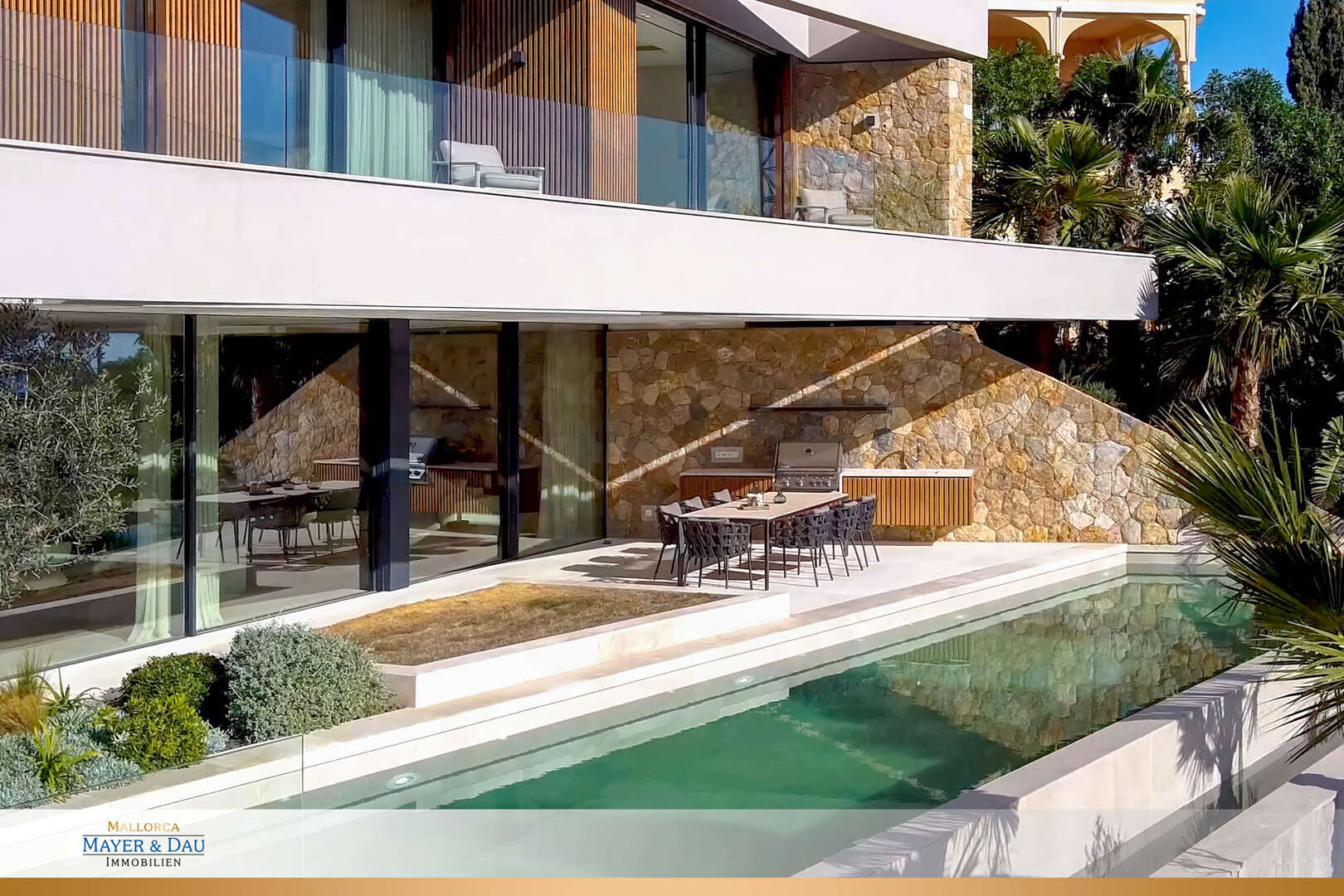 La zona exterior invita a relajarse durante todo el año con piscina, cocina de verano, salón, hoguera y ducha exterior: su oasis privado en Mallorca.