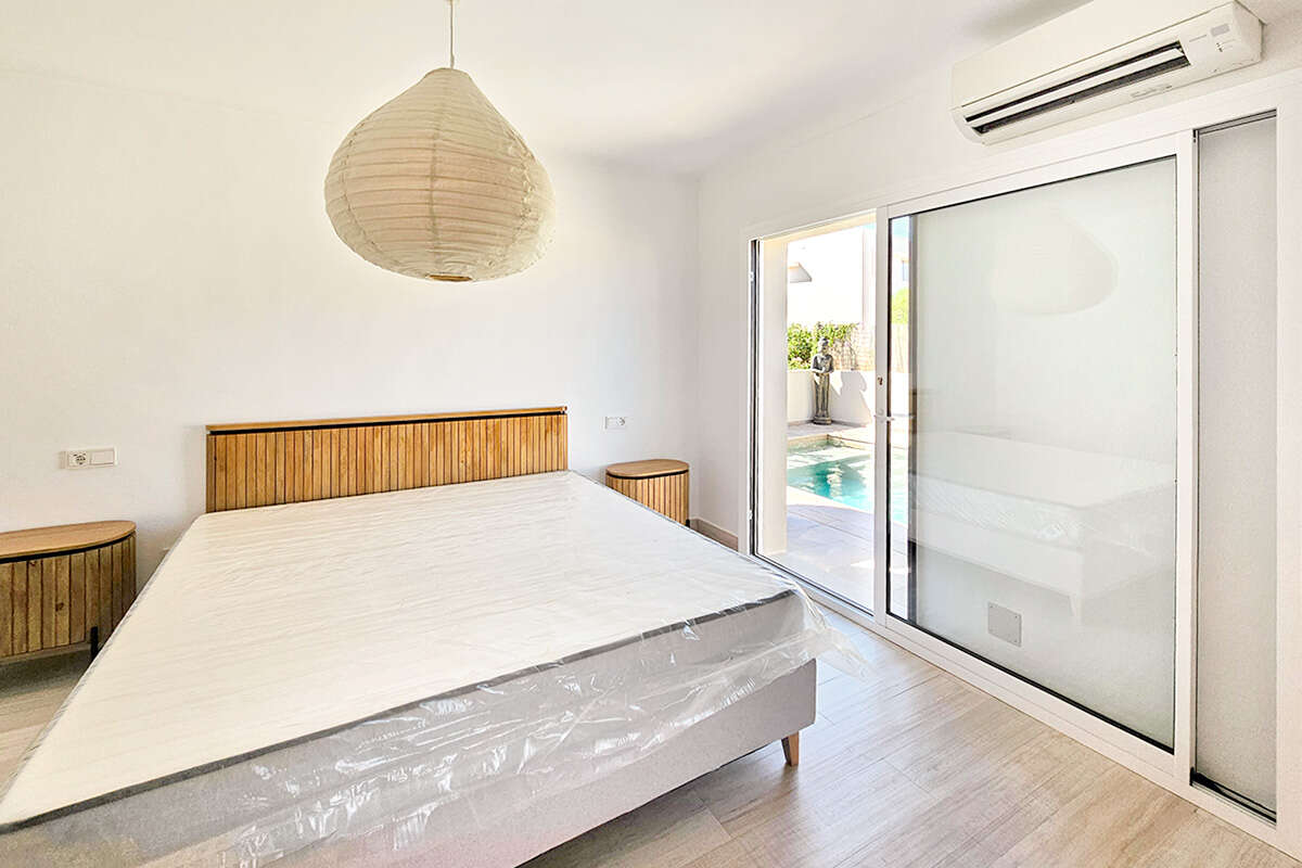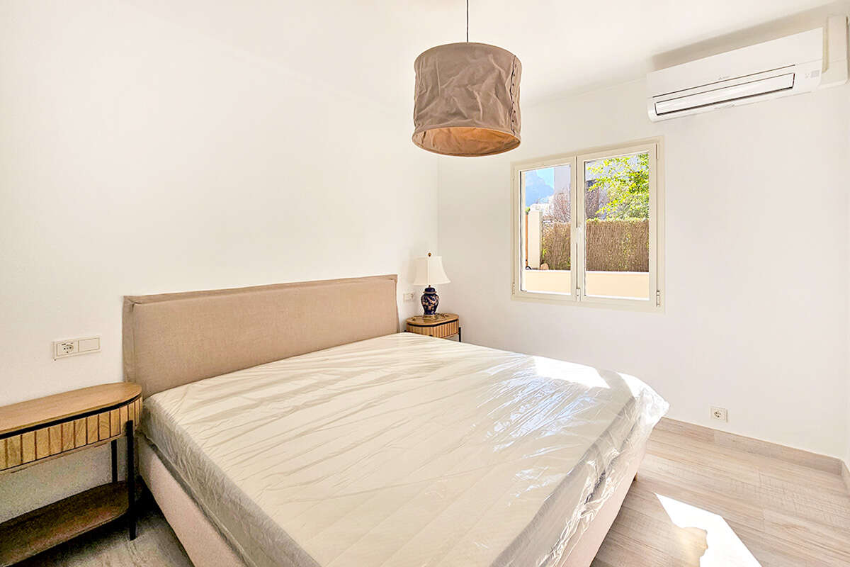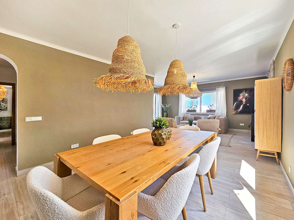 En la planta baja hay un amplio salón-comedor con chimenea, una moderna cocina totalmente equipada con electrodomésticos de alta calidad, así como dos dormitorios dobles y dos cuartos de baño, uno de ellos en suite con vestidor adicional. Grandes ventanales dan a la espaciosa terraza con zona de comedor cubierta y vistas al mar.